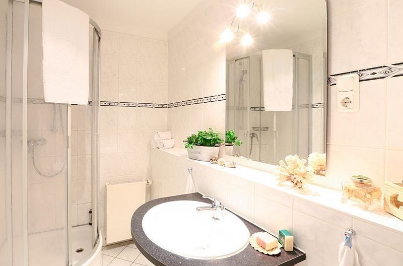 Ebenfalls auf dieser Ebene befindet sich das Badezimmer. Dieses ist ausgestattet mit einer Dusche, einem Waschbecken mit Unterschrank, einem WC sowie Ablageflächen für Ihre Bad-Utensilien.
