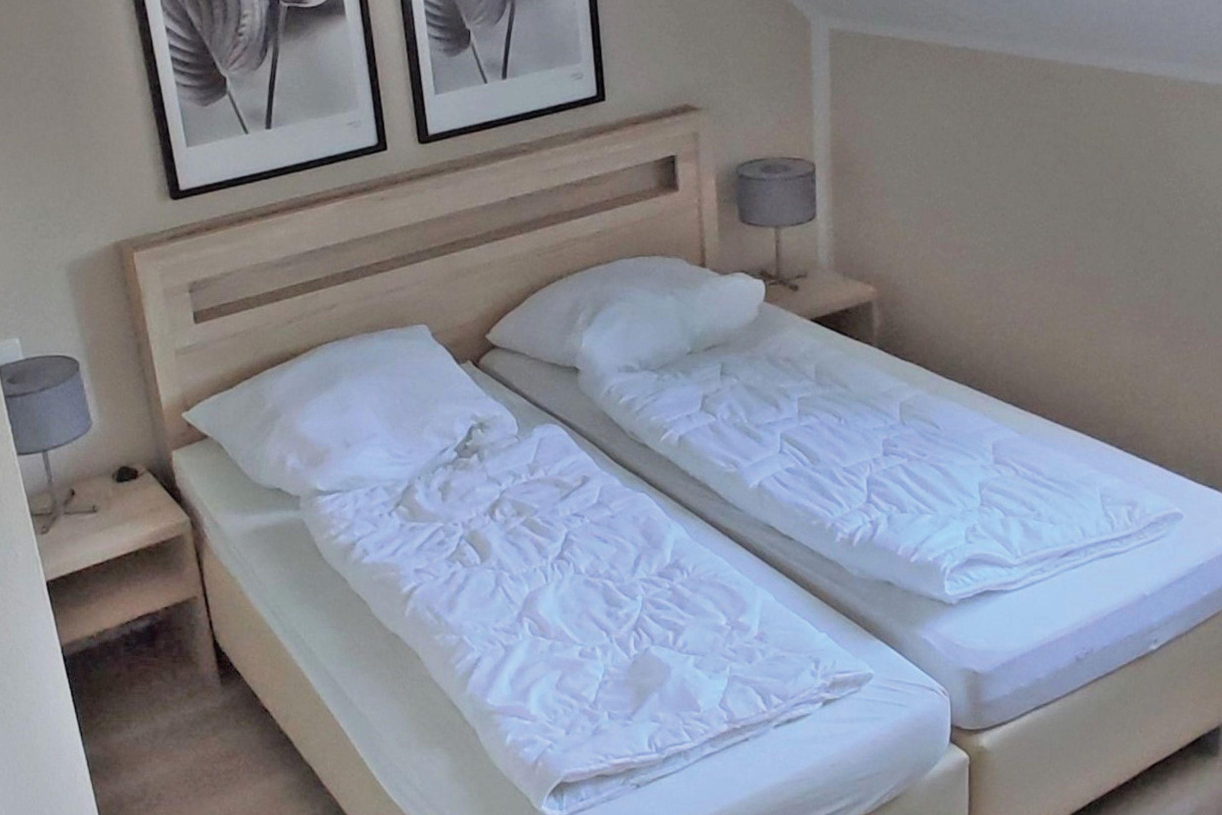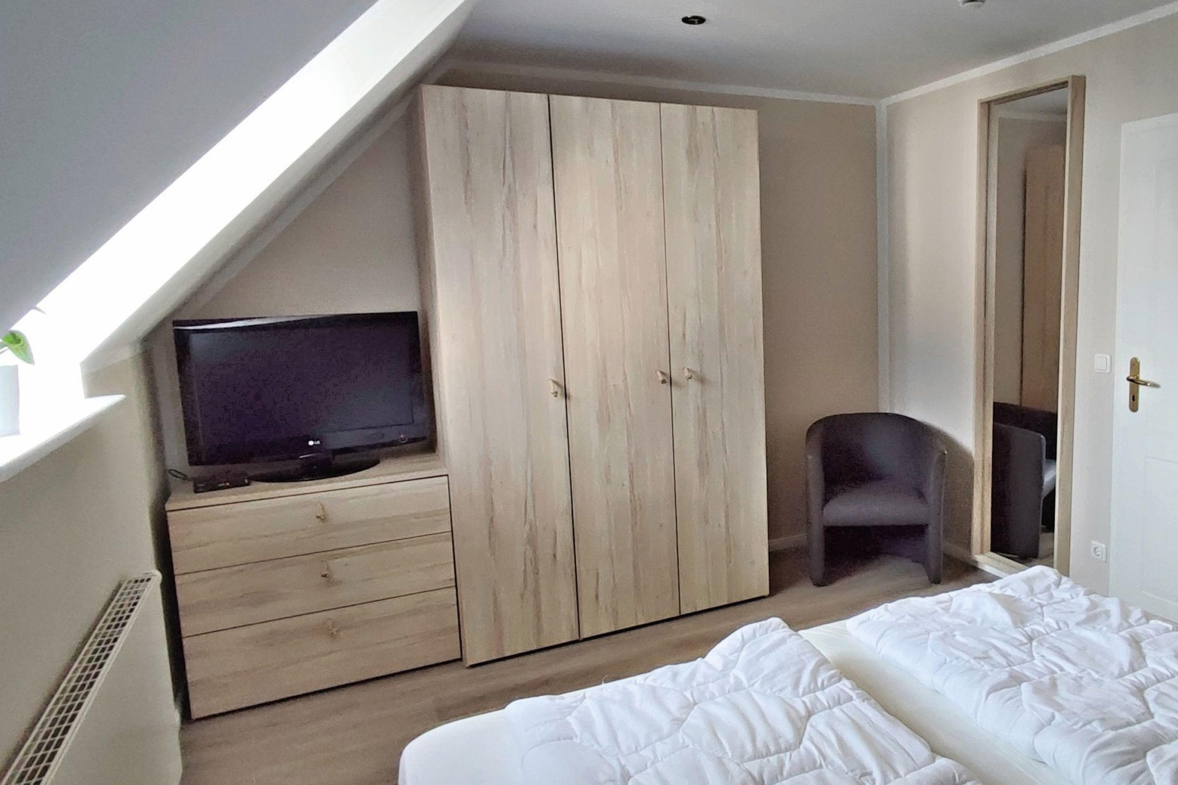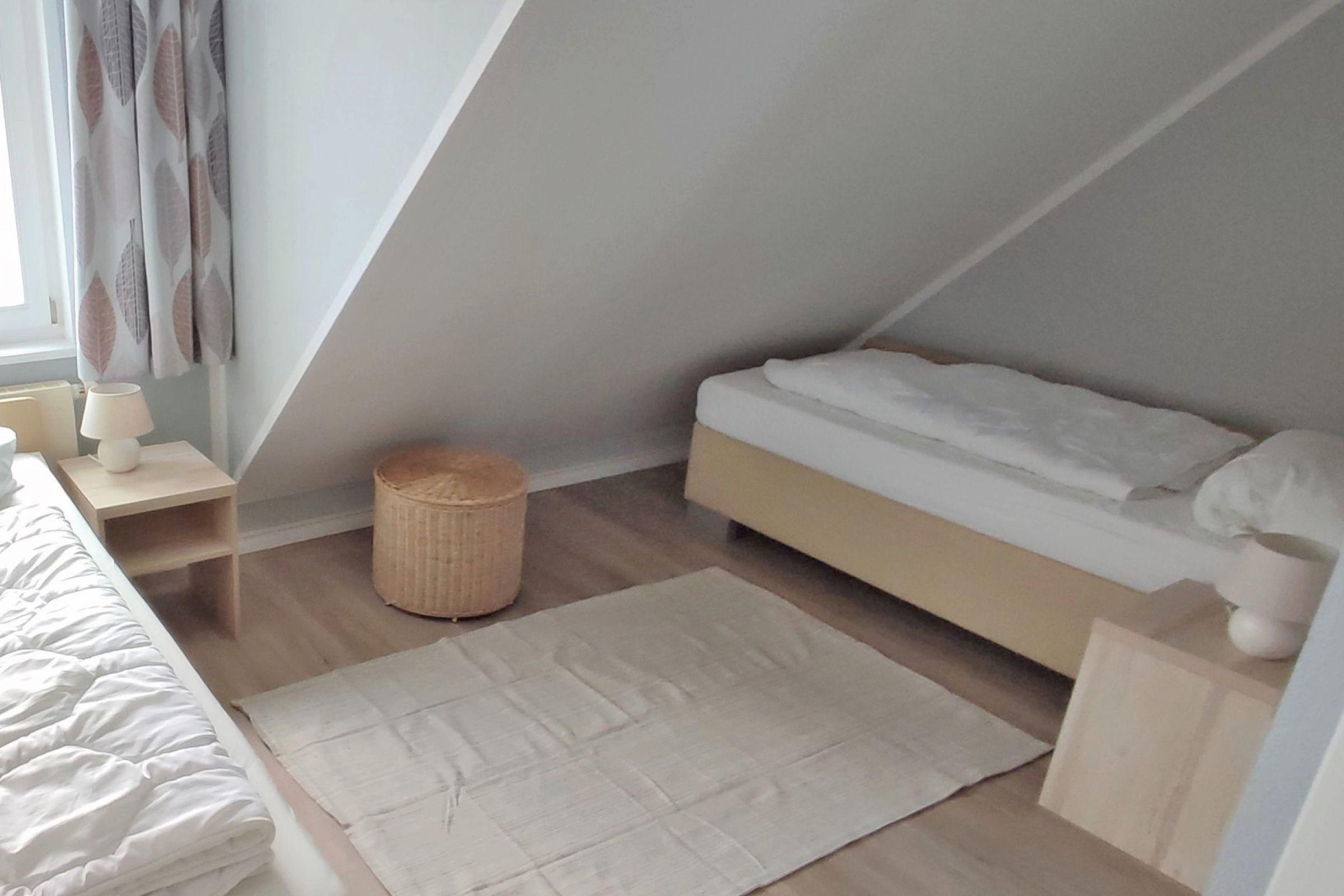 Über eine Wendeltreppe gelangen Sie in das Obergeschoss. Hier befinden sich zwei Schlafzimmer, eines ist mit einem komfortablen Doppelbett, das zweite mit zwei Einzelbetten eingerichtet. In beiden Zimmern stehen Ihnen je ein geräumiger Kleiderschrank sowie ein zusätzliches Fernsehgerät zur Verfügung.