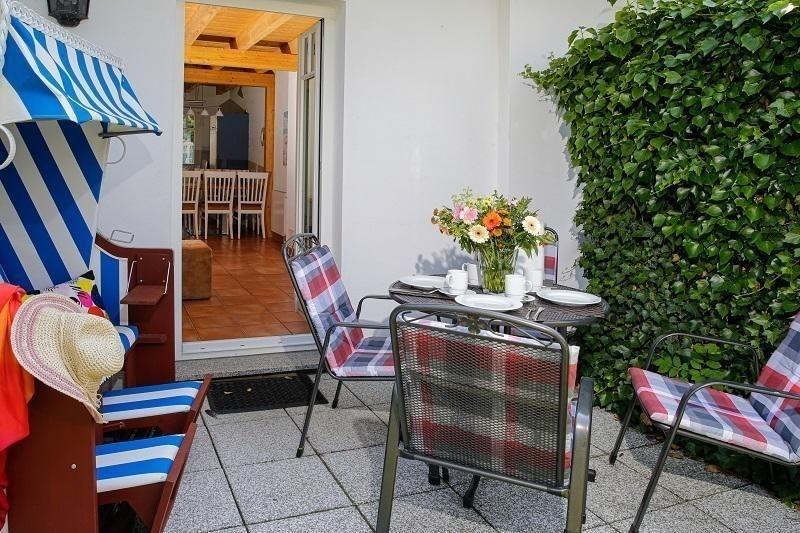 Die charmant anmutende Terrasse mit einem fantastischen freien Blick auf die nahe Umgebung mit weitläufigen Grünflächen verspricht Ihnen Erholung und Entspannung pur! Moderne und bequeme Gartenmöbel sowie ein hübscher Strandkorb für das maritime Ambiente sorgen für ein gemütliches Beisammensein mit der ganzen Familie.