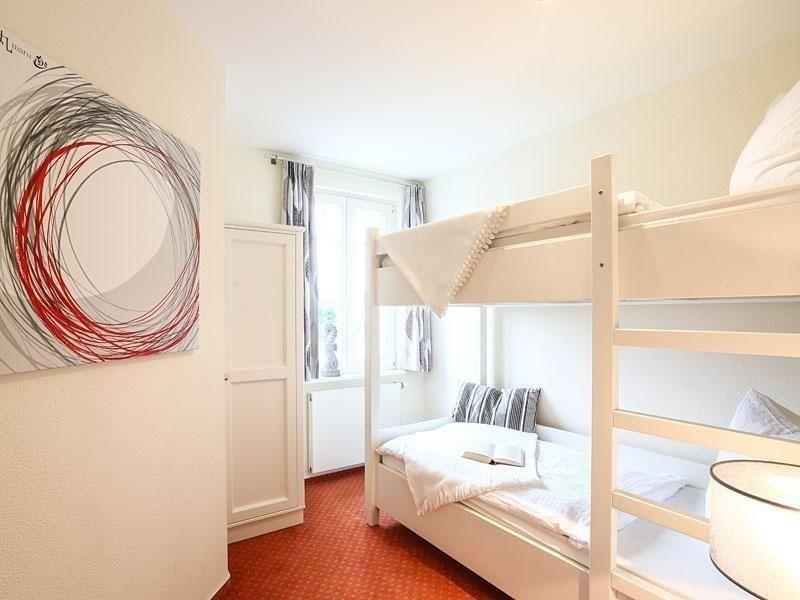 In das Obergeschoss gelangen Sie über eine Wendeltreppe. Hier befinden sich drei Schlafzimmer, wobei zwei mit jeweils einem komfortablen Doppelbett sowie einem geräumigen Kleiderschrank und das dritte Zimmer mit einem Etagenbett ausgestattet ist. In einem der Schlafzimmer befindet sich ein zusätzliches Fernsehgerät.
