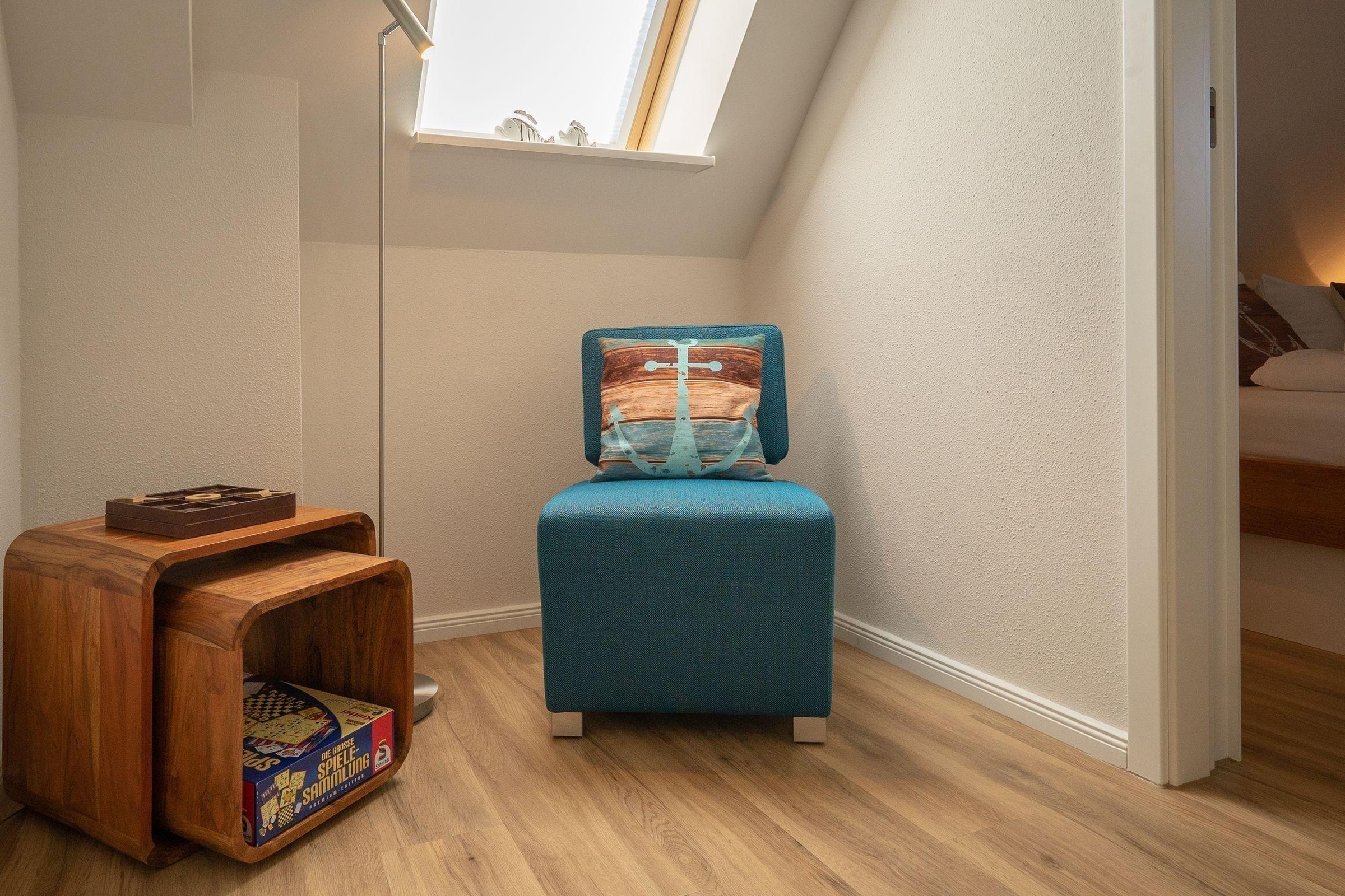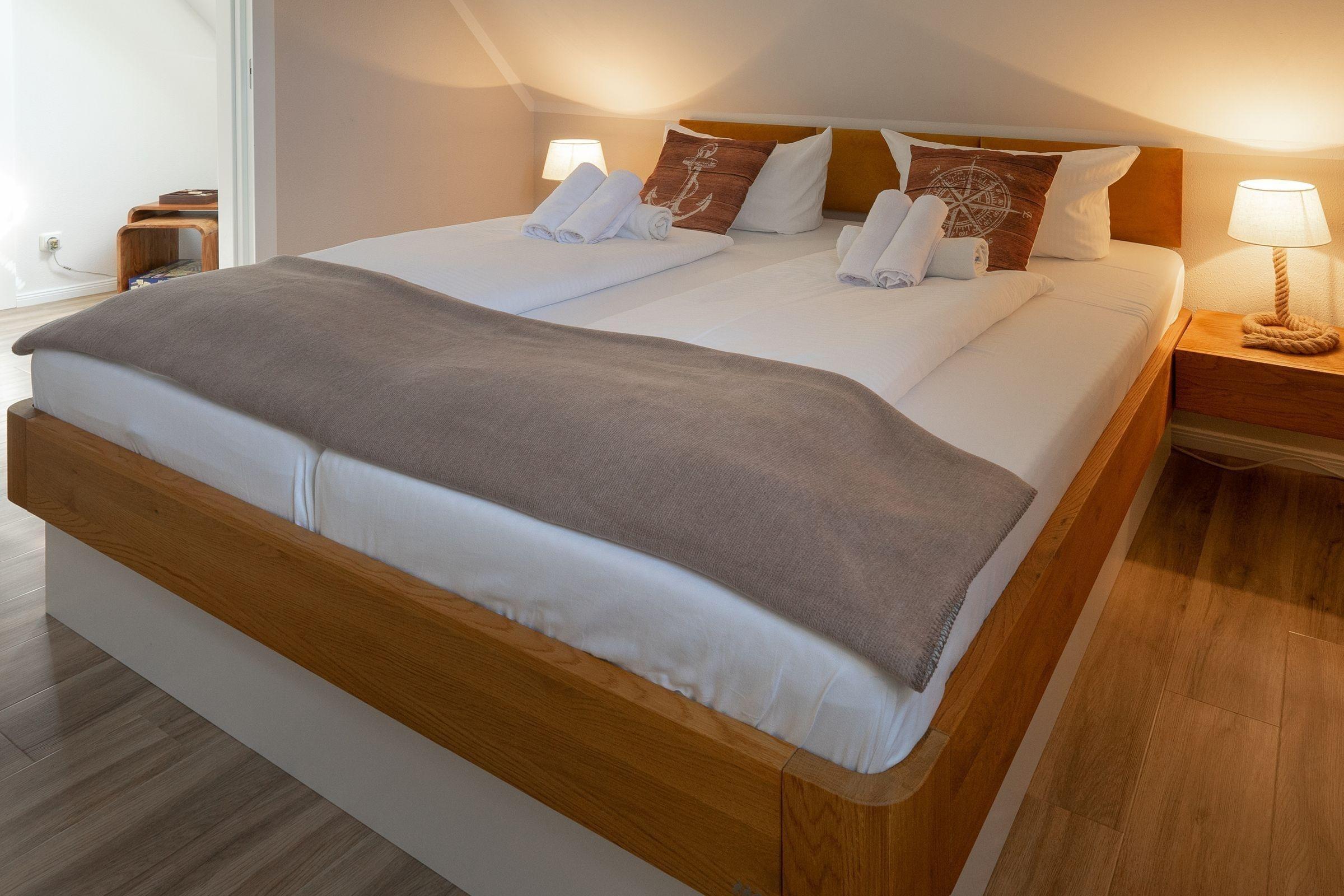Über eine Wendeltreppe gelangen Sie in das Obergeschoss. Hier befindet sich das Schlafzimmer, ausgestattet mit einem komfortablen Doppelbett, einem geräumigen Kleiderschrank sowie einem zusätzlichen Fernsehgerät.