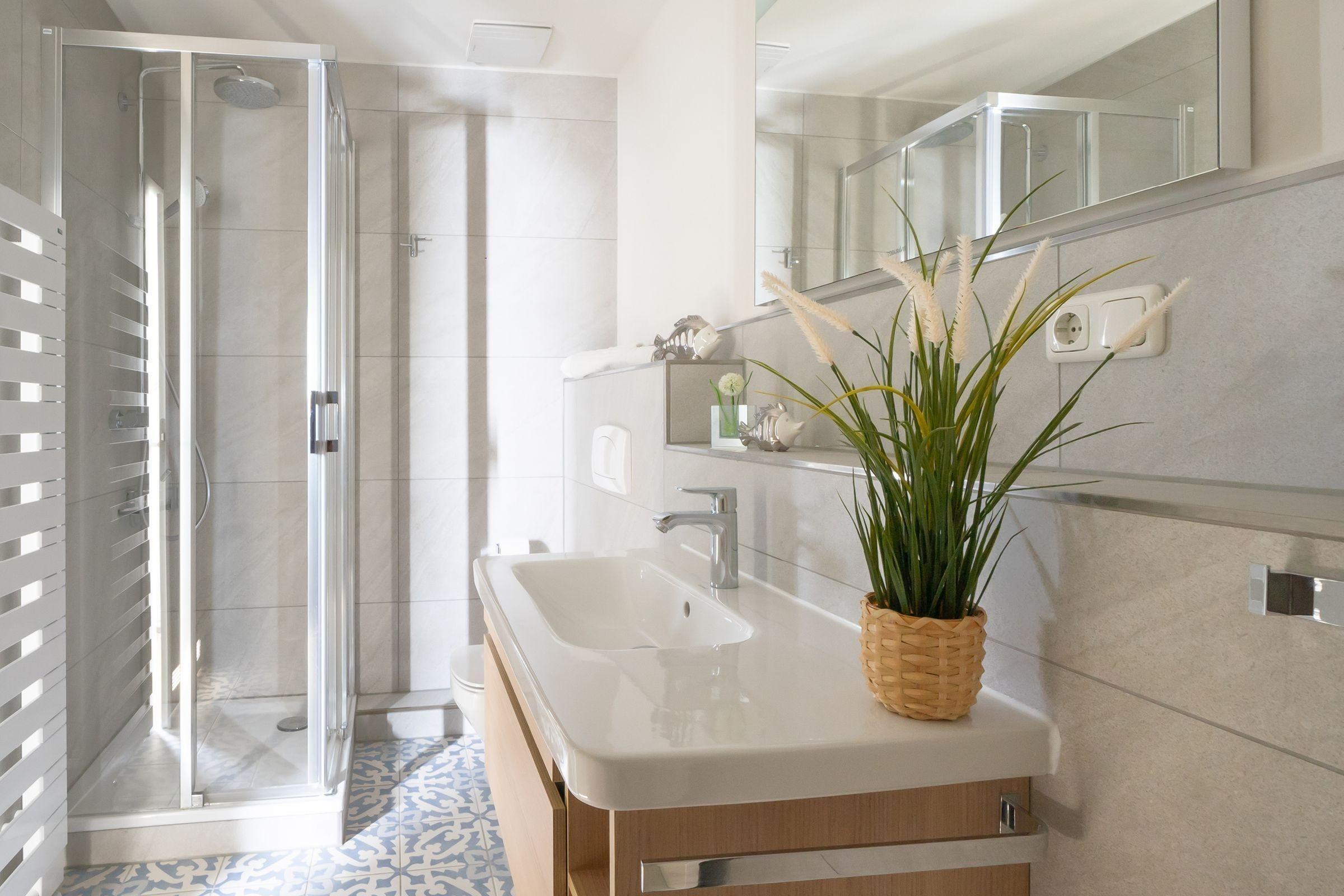 Das exklusive Badezimmer verfügt über eine Dusche, ein WC, ein Waschbecken mit Unterschrank sowie ausreichend Abstellflächen für Ihre Badutensilien.