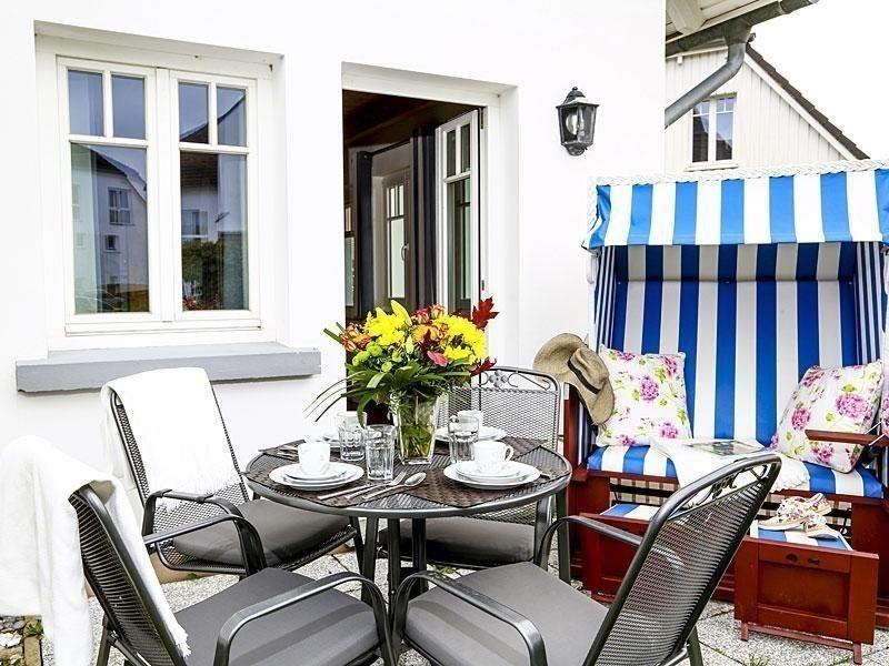 Die idyllisch anmutende Terrasse im Außenbereich des Hauses ist ausgestattet mit modernen Gartenmöbeln und einem hübschen Strandkorb für das besondere maritime Ambiente. Diese kleine Wohlfühloase lädt zum Verweilen ein und bietet einen fantastischen Blick auf die ruhige Umgebung und die weitläufigen, gepflegten Grünflächen, die die Terrasse umfassen.