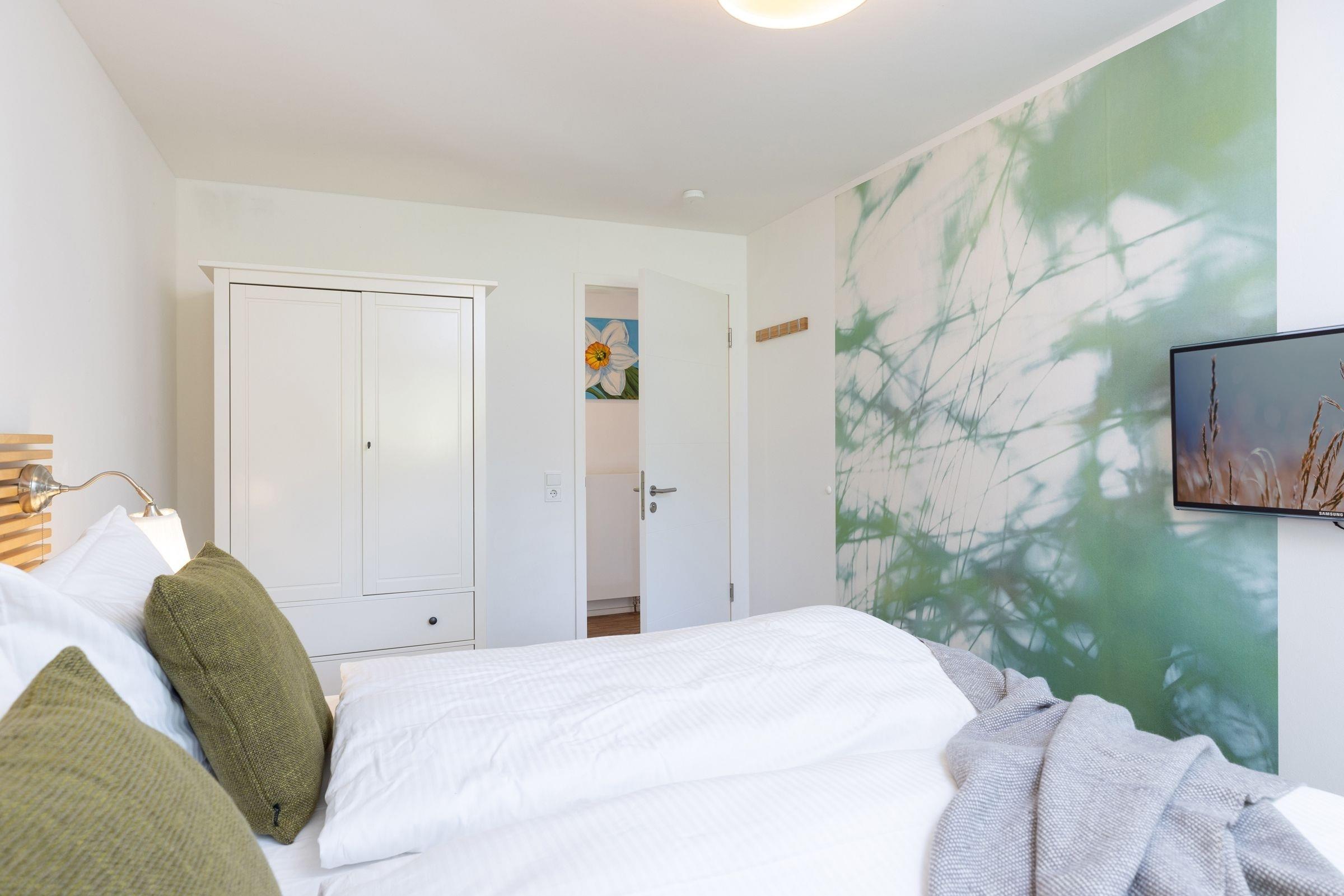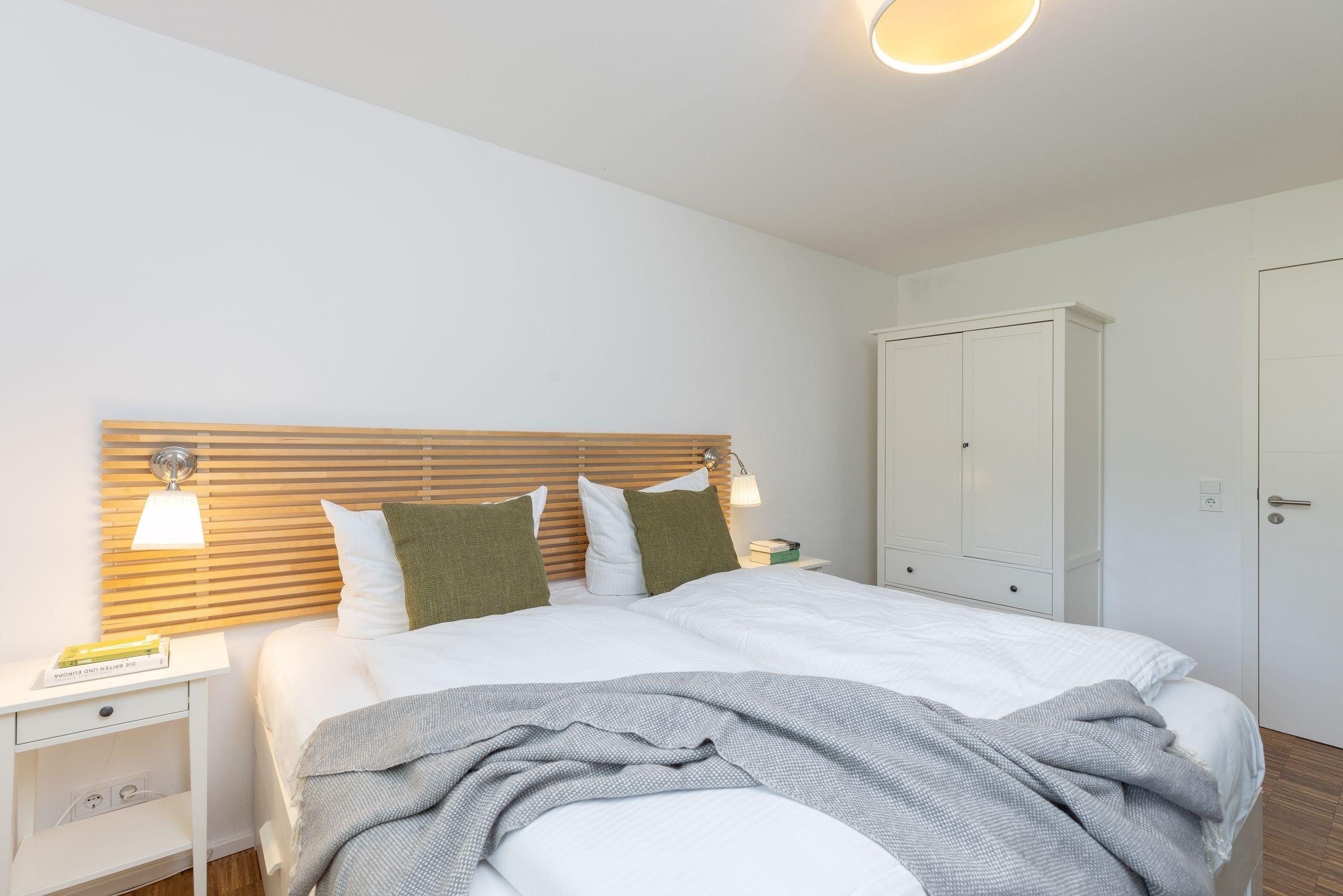 2. Schlafzimmer: 1 Doppelbett (2x 90x200 cm), Kleiderschrank, TV, Verdunkelung/Sichtschutz: Plissee, Platz für Babybett vorhanden