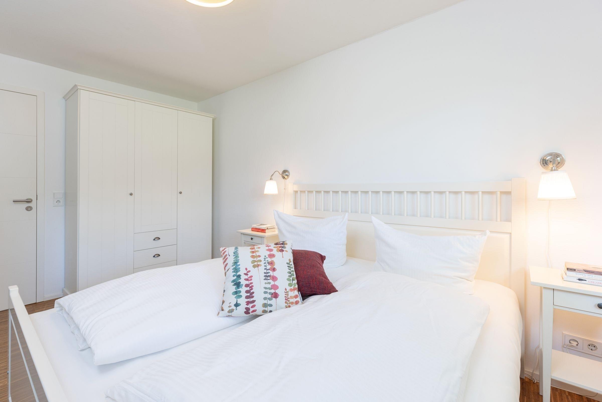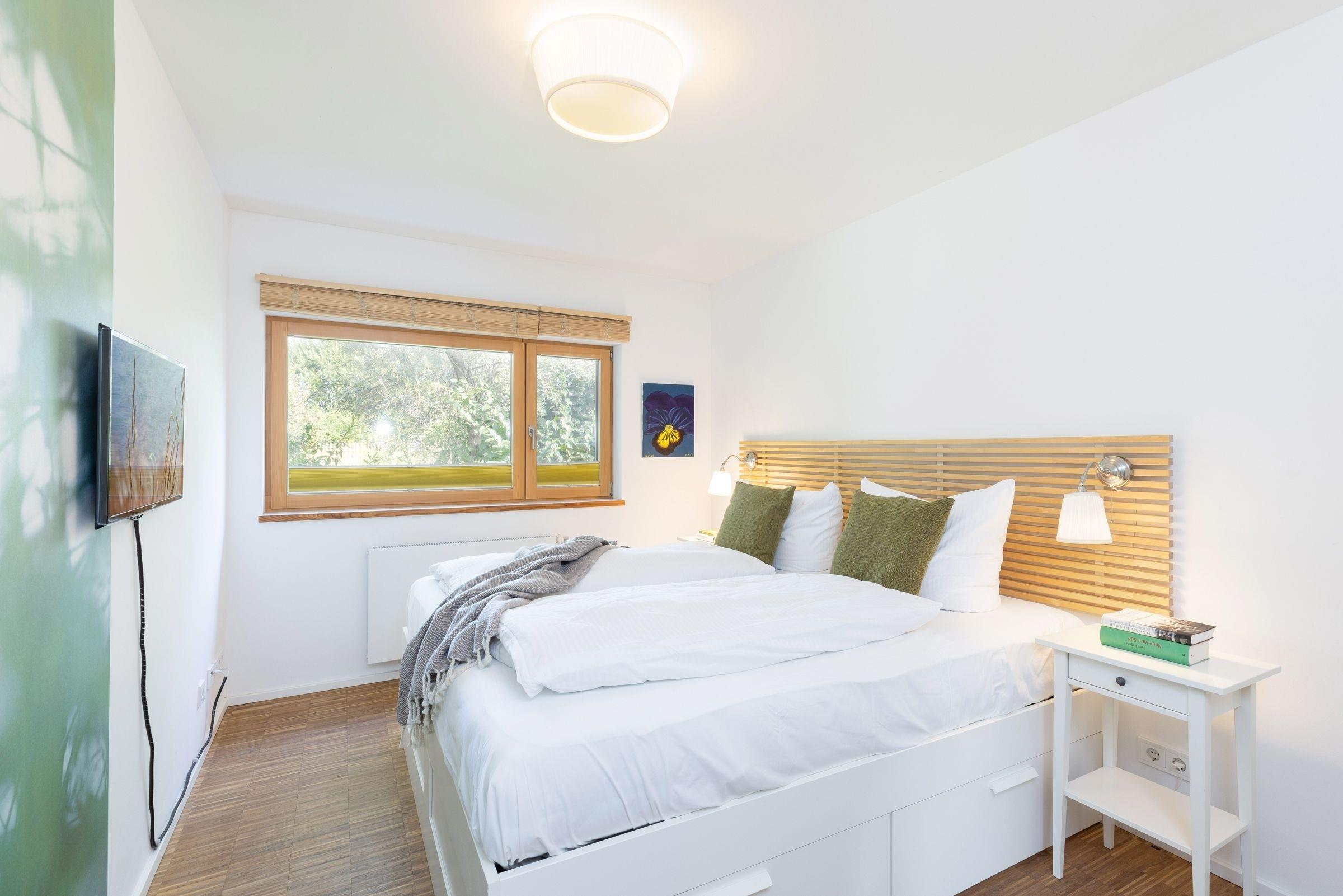 1. Schlafzimmer: 1 Doppelbett (2x 90x200 cm), Kleiderschrank, TV, Verdunkelung/Sichtschutz: Plissee, Platz für Babybett vorhanden