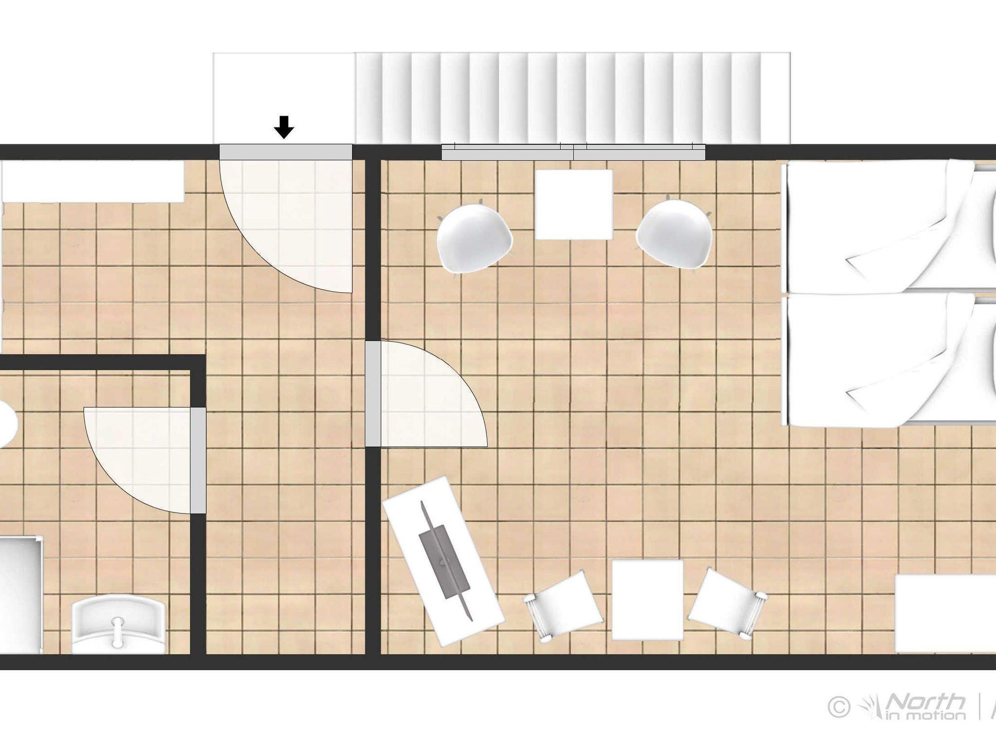 Den Gästen stehen im Wohn-/Schlafraum 2 Einzelbetten (90x200auch als Doppelbett stellbar), eine gemütliche Sitzecke, ein Essplatz, Sat/TV und Radio sowie WLAN zur Verfügung. Die separate Küchenzeile befindet sich im Vorraum und ist mit zwei Kochplatten, Kühlschrank mit Gefrierfach, Kaffeemaschine, Wasserkocher, Toaster ausgestattet. Selbstverständlich gibt es auch Dusche, WC, Fön und Heizung. Die Aufbettung für eine dritte Person besteht aus einem Zustellbett (90x190), welches anstelle der Sessel und des Tisches aufgestellt wird.
