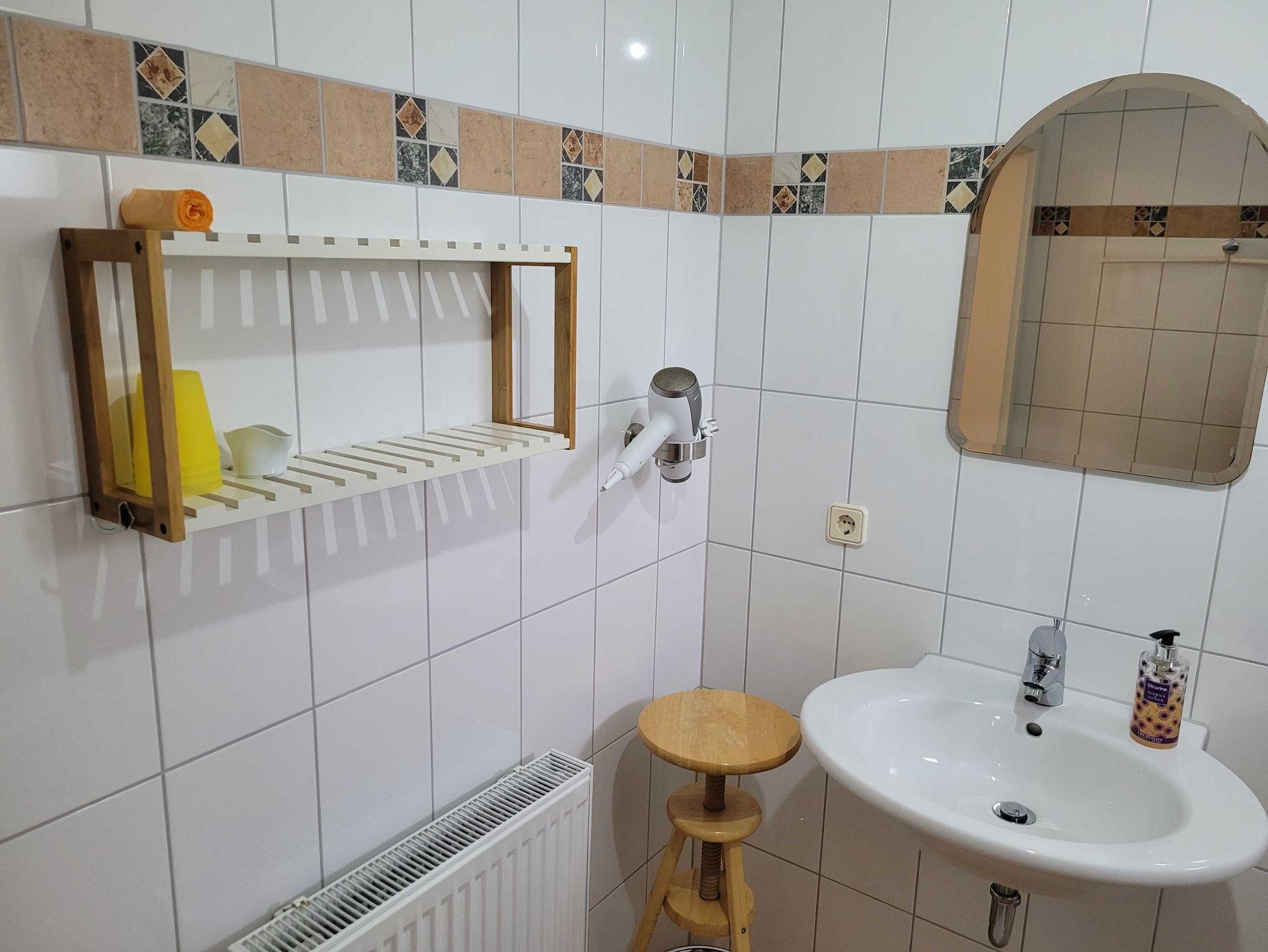 Die Erdgeschoss-Ferienwohnung ist 50 m² groß und und verfügt über ein Wohnzimmer mit einer Schlafcouch für 2 Personen, ein Schlafzimmer mit einem Doppelbett für 2 Personen sowie ein Schlafsofa für eine Person, Bad und Küchenzeile. Die gesamte Wohnung ist gefliest.
