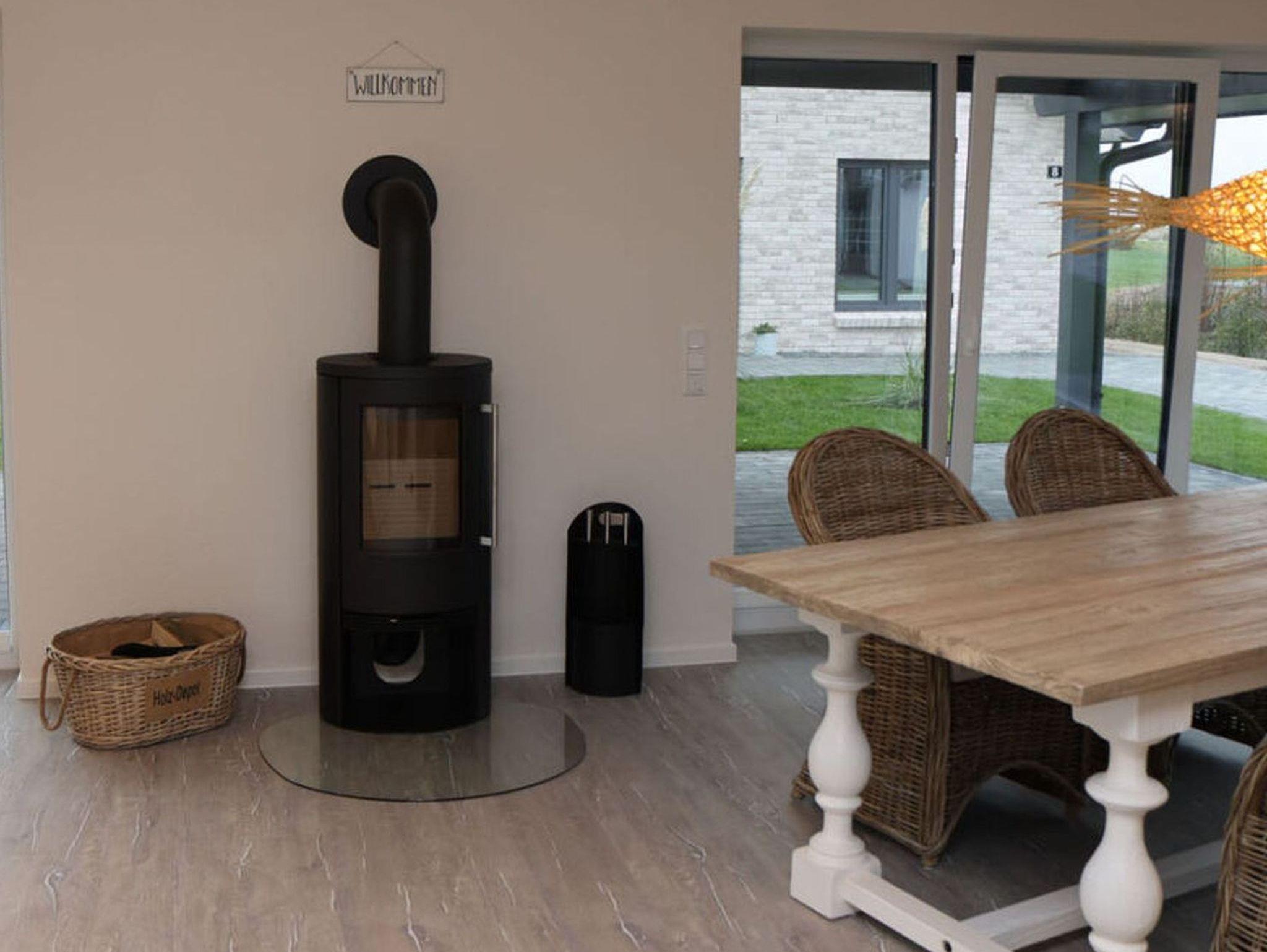 • Wohn- und Essbereich mit offener Küche, massivem Esstisch (2,50 m lang), Induktionskochfeld, Kaminofen und anliegender Terrasse