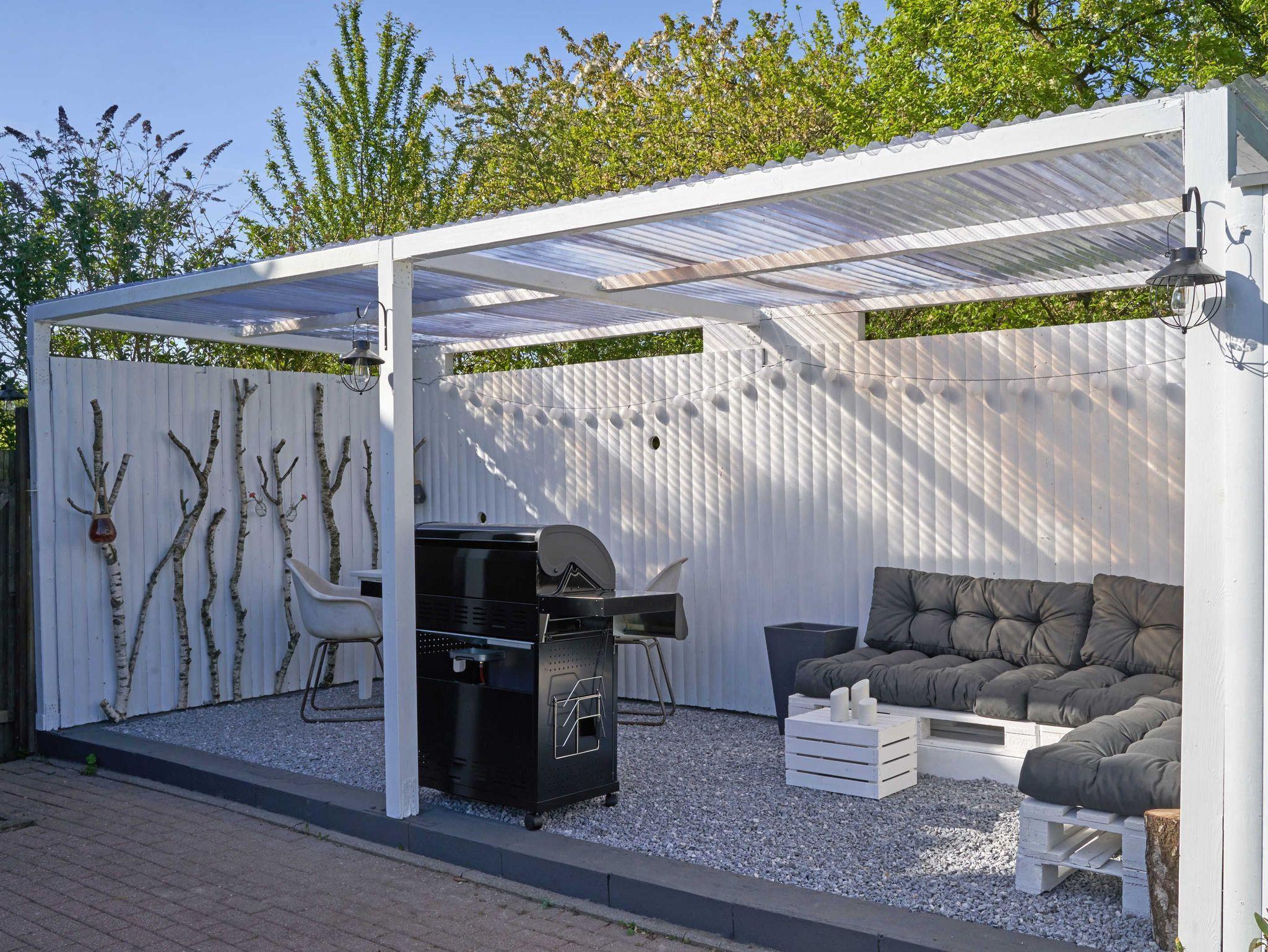 • Überdachte Terrasse mit Loungemöbeln, Essecke und Gasgrill