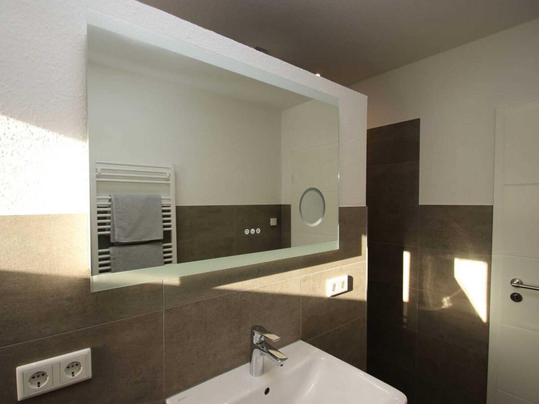 • Badezimmer mit bodengleicher Regendusche, Handtuchheizung und beheizbarem Spiegel mit LED Ambientebeleuchtung; Handtücher zu buchbar