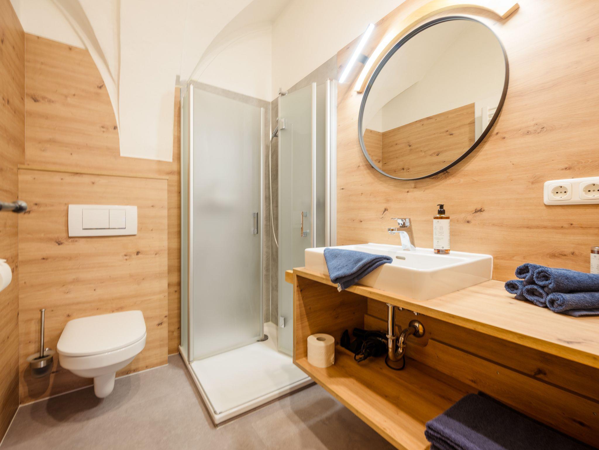 Im Bad befindet sich eine Dusche, ein Waschbecken und ein WC.