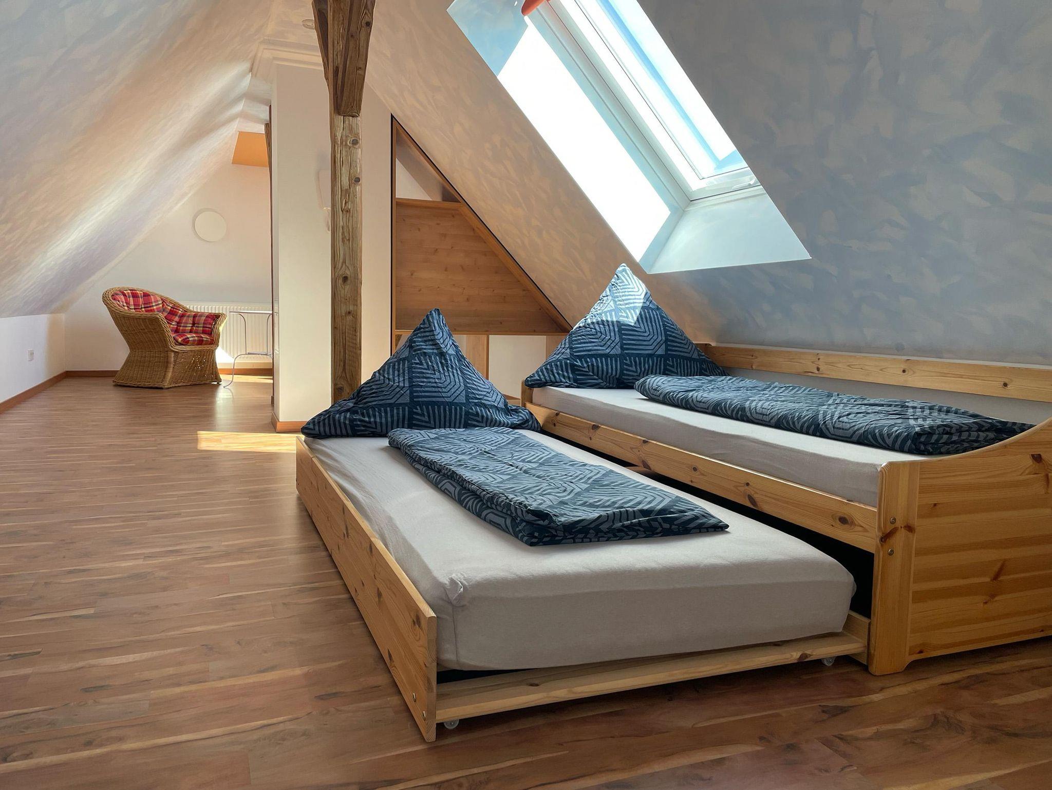 Ein echtes Highlight ist die offene Galerie, die mit einem gemütlichen französischen Doppelbett ausgestattet ist. Diese lichtdurchflutete Ebene wird liebevoll das „Sternense(h)ezimmer“ genannt – hier finden je nach Bedarf bis zu drei weitere Gäste eine stimmungsvolle Schlafmöglichkeit mit traumhaftem Blick in den Himmel.