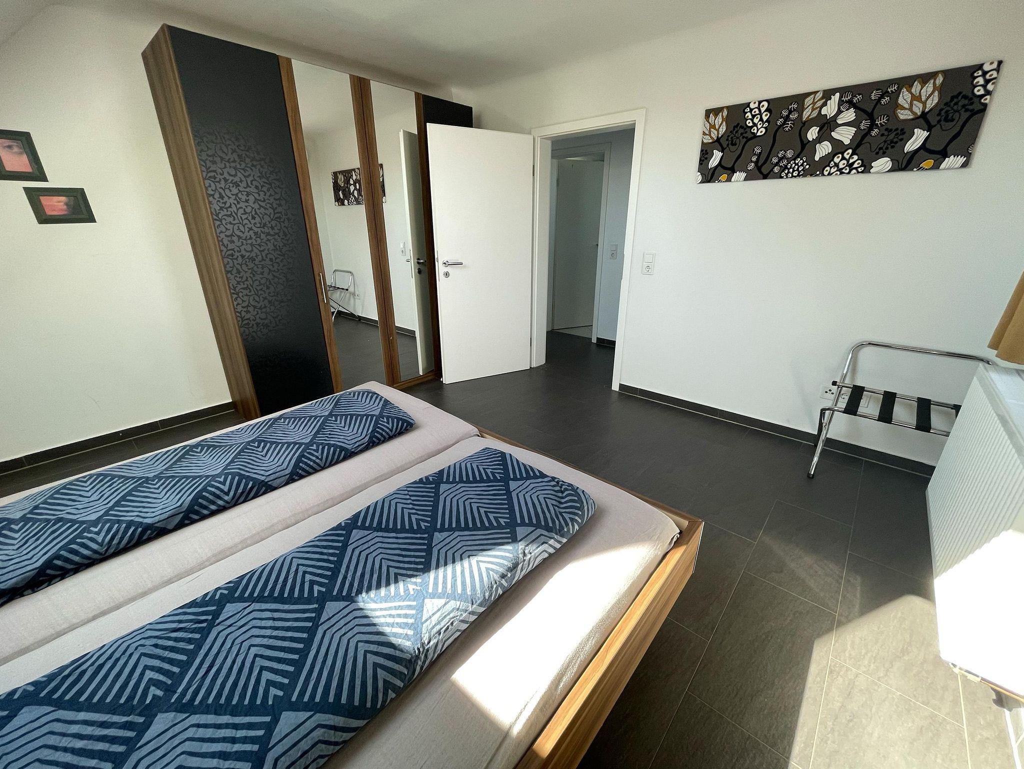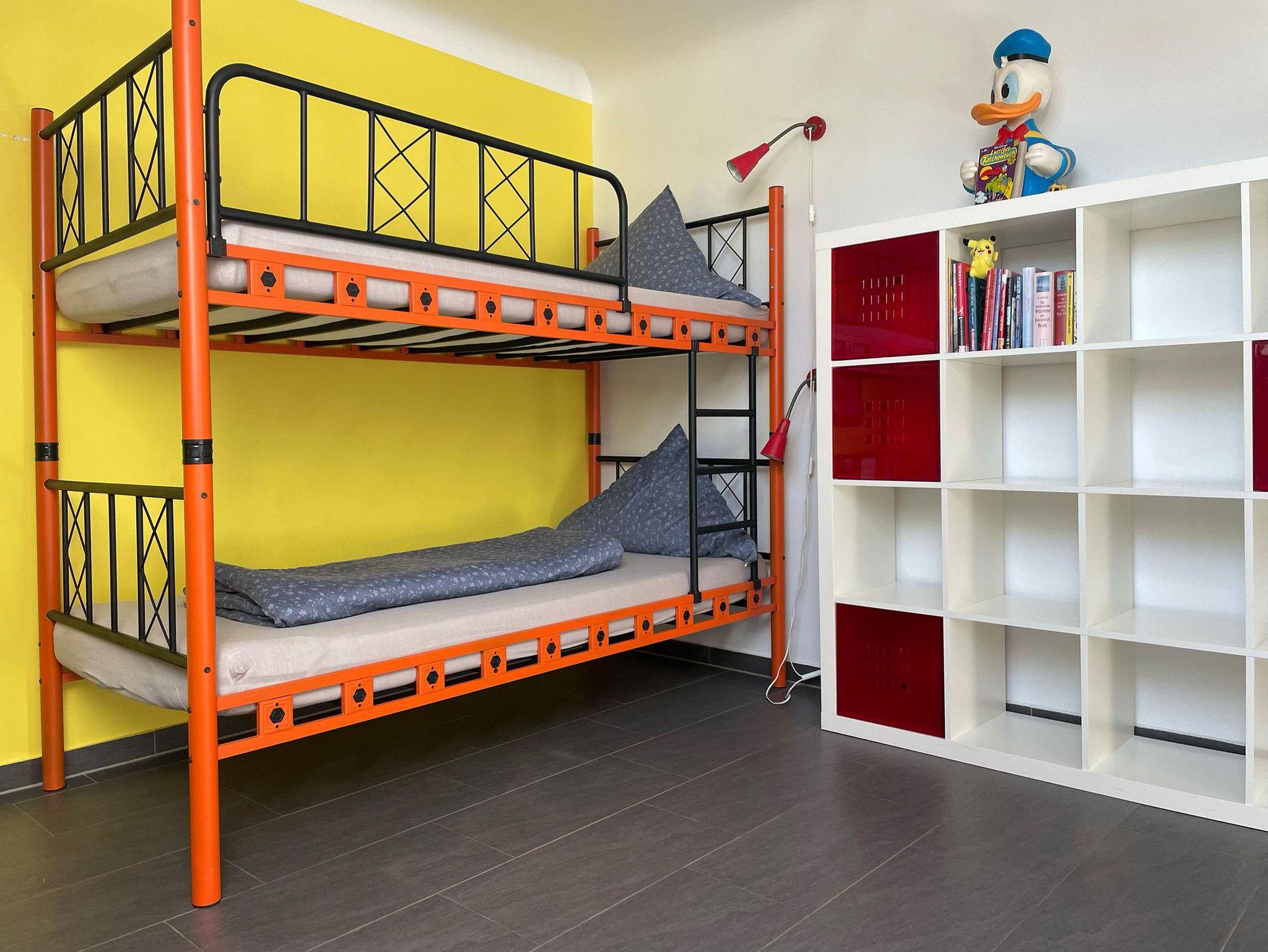 Die Wohnung verfügt über zwei separate Schlafzimmer: Das Hauptschlafzimmer ist mit einem bequemen Doppelbett ausgestattet, das zweite Schlafzimmer bietet ein praktisches Etagenbett sowie zwei Einzelbetten – perfekt für Kinder oder Jugendliche.