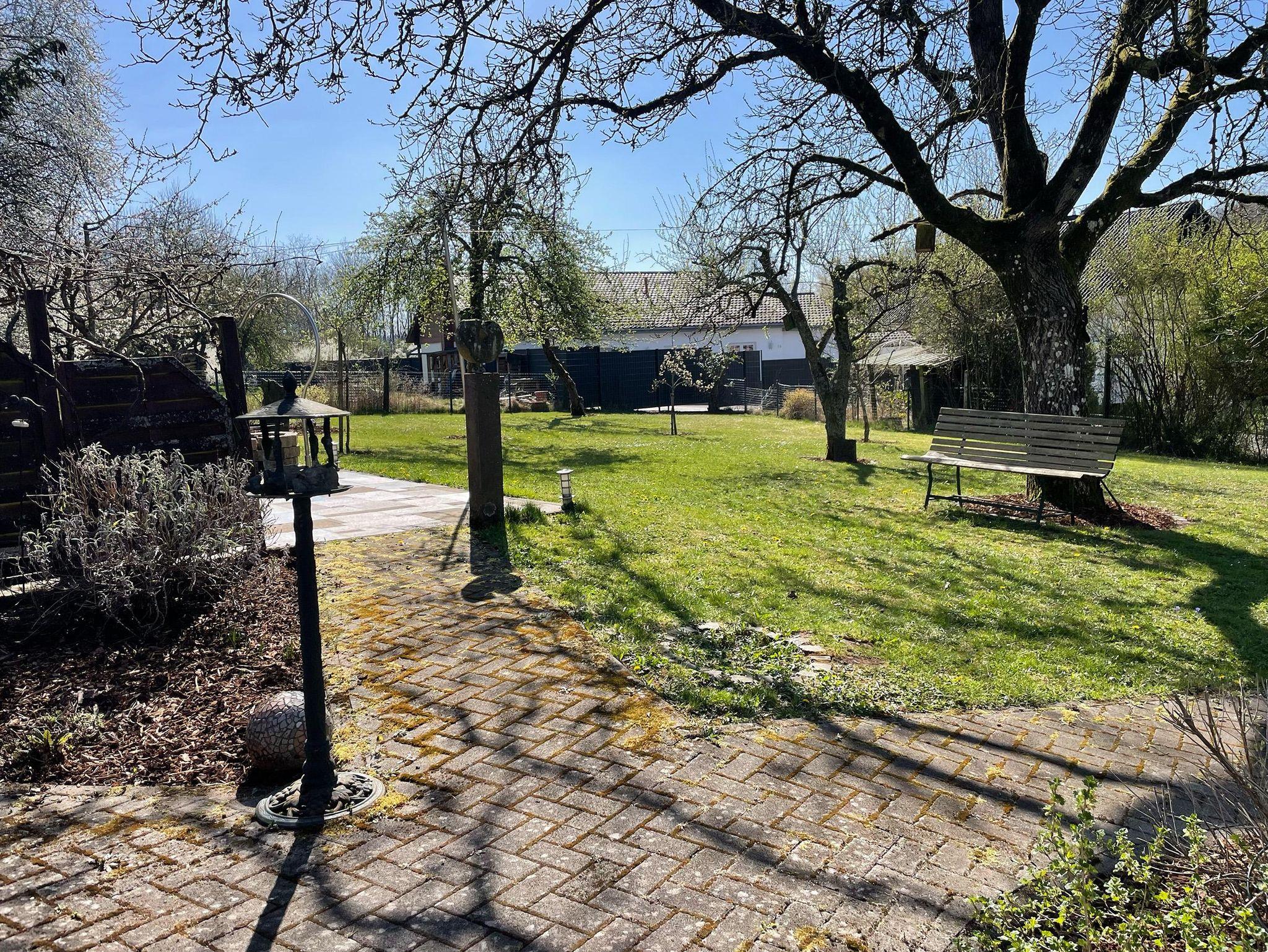 Das weitläufige Grundstück begeistert mit einer gepflegten Rasenfläche, alten Obst- und Zierbäumen, einem kleinen Kräutergarten sowie einem stilvoll angelegten Gräsergarten. Eine gemütliche Terrasse mit Natursteinmauerung und gemauerter Grillstelle lädt zum Verweilen und Genießen ein – perfekt für entspannte Urlaubstage im Grünen.