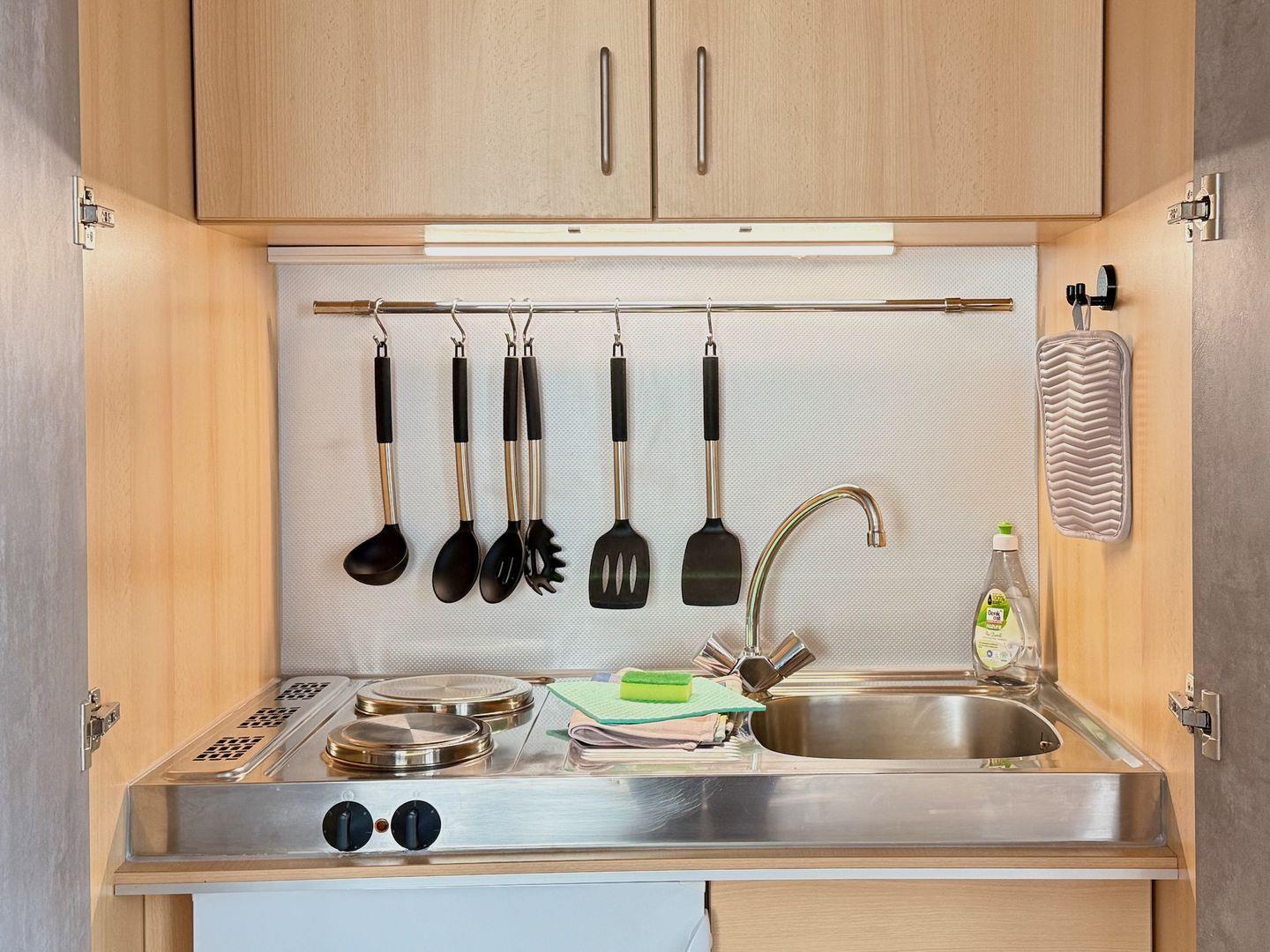 Der kombinierte Wohn- und Schlafraum ist komfortabel und praktisch gestaltet. Hier erwartet Sie ein bequemes Doppelbett, ein geräumiger Kleiderschrank, eine gemütliche Sitzgelegenheit mit Couch und Tisch sowie ein Farb-Sat-TV und ein anwählbares Telefon. Die integrierte Pantryküche ist mit einem 2-Plattenherd, Kühlschrank, Kaffeemaschine (Pads), Wasserkocher, Toaster, Eierkocher und allem nötigen Kochzubehör ausgestattet – ideal für kleinere Mahlzeiten oder ein Frühstück mit Aussicht.