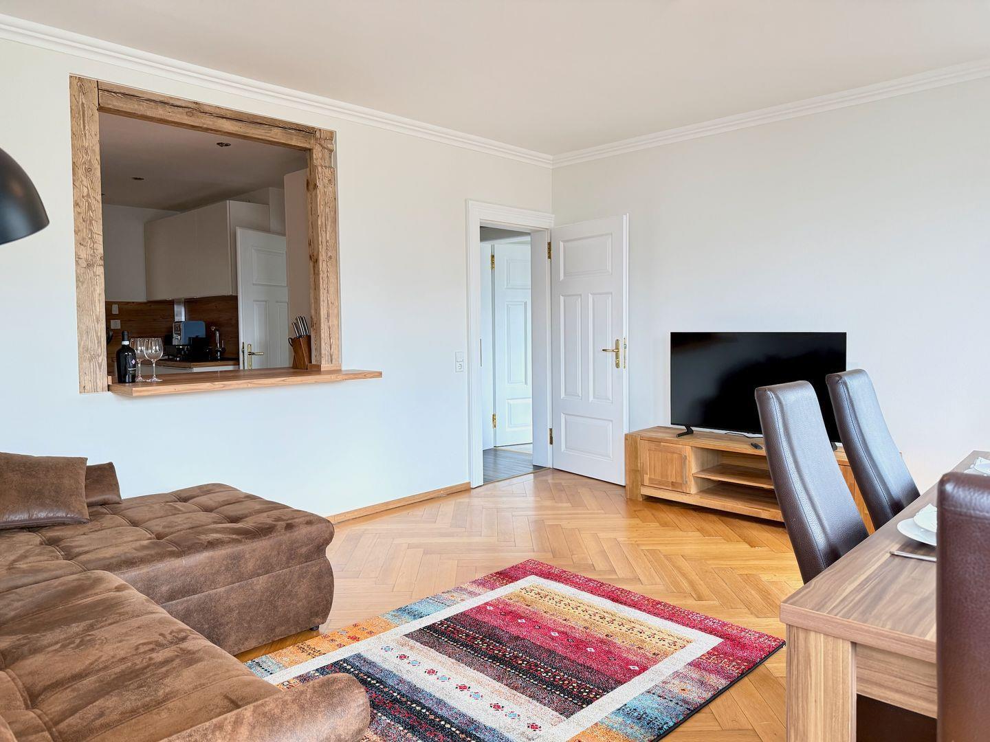 Ihr vollausgestattetes Domizil im 2. OG der Villa ist mit dem Aufzug erreichbar und auf dem neuesten technischen Stand. Eine neue Küche mit hochwertigen Geräten und einer praktischen Durchreiche zum Essbereich sorgt für kulinarischen Komfort. Der Ess-/Wohnbereich mit Couch und TV bietet Ihnen direkte abwechslungsreiche Sicht auf den Bodensee. Die Couch kann bei Bedarf zu einem Schlafsofa zur zusätzlichen Schlafgelegenheit für Kinder und junge Erwachsene umfunktioniert werden.
