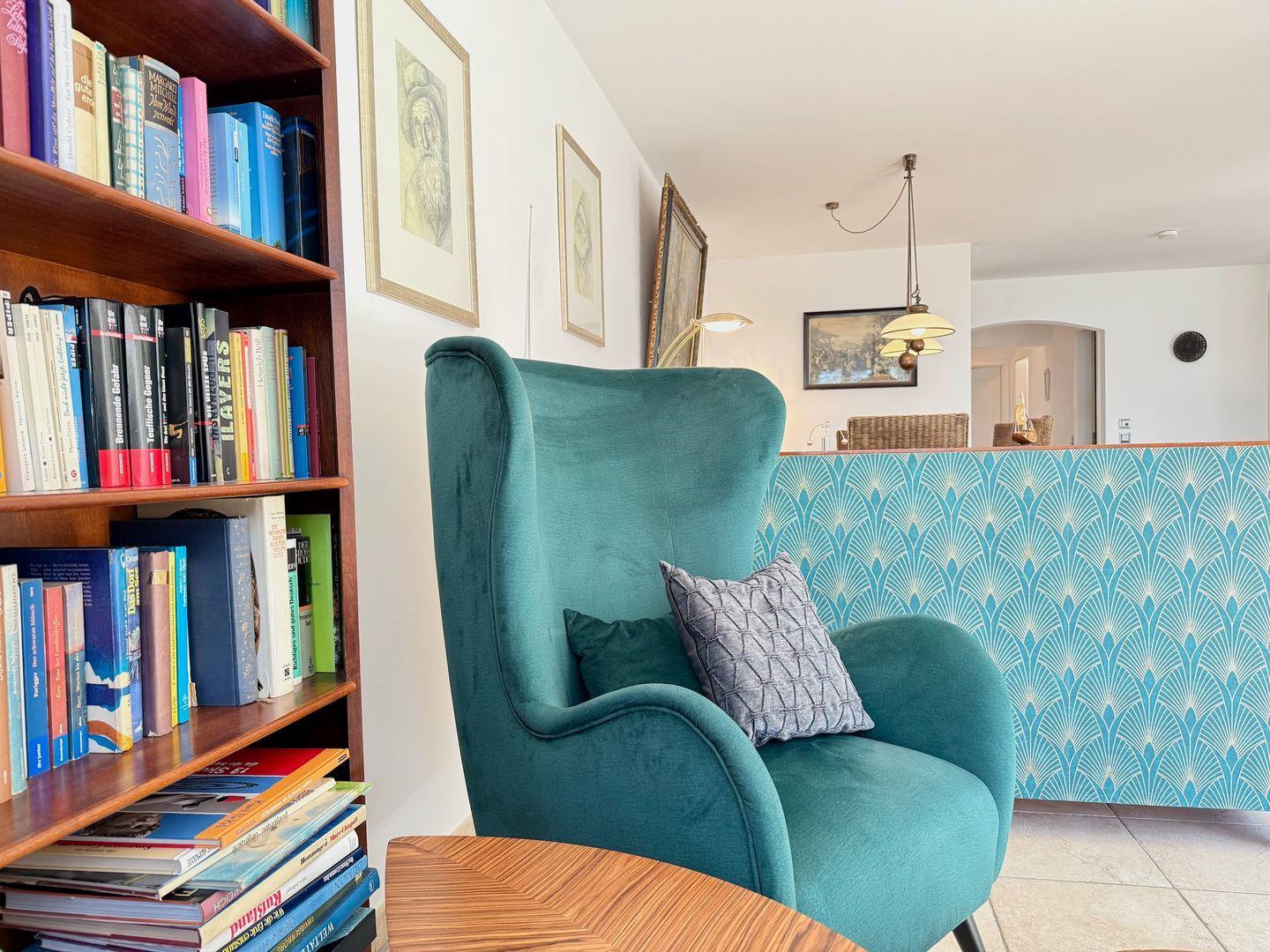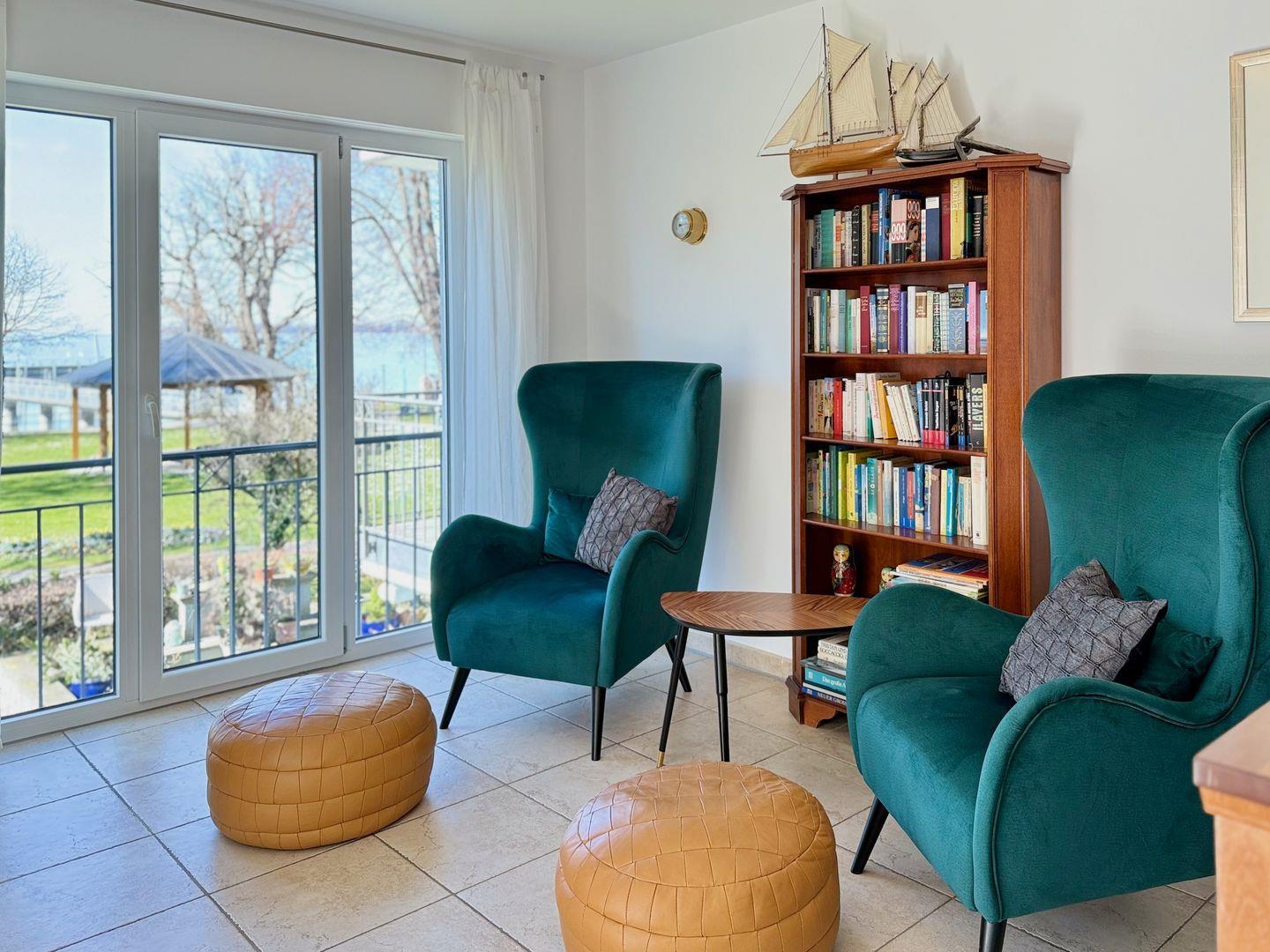 Der großzügige Wohnbereich lädt mit einer gemütlichen Leseecke zum Entspannen ein – genießen Sie ein gutes Buch und ein Glas Wein mit traumhaftem Seeblick. Ein besonderes Highlight ist der große Balkon, der dank Markise auch bei Sonnenschein angenehmen Schatten bietet. Für erholsamen Schlaf lässt sich die gesamte Wohnung komplett verdunkeln.