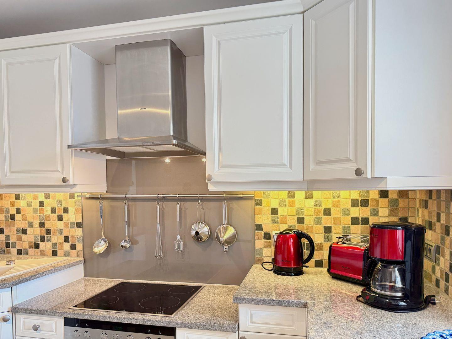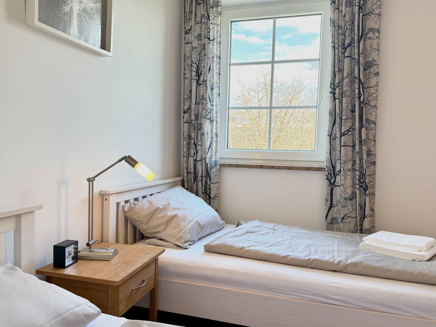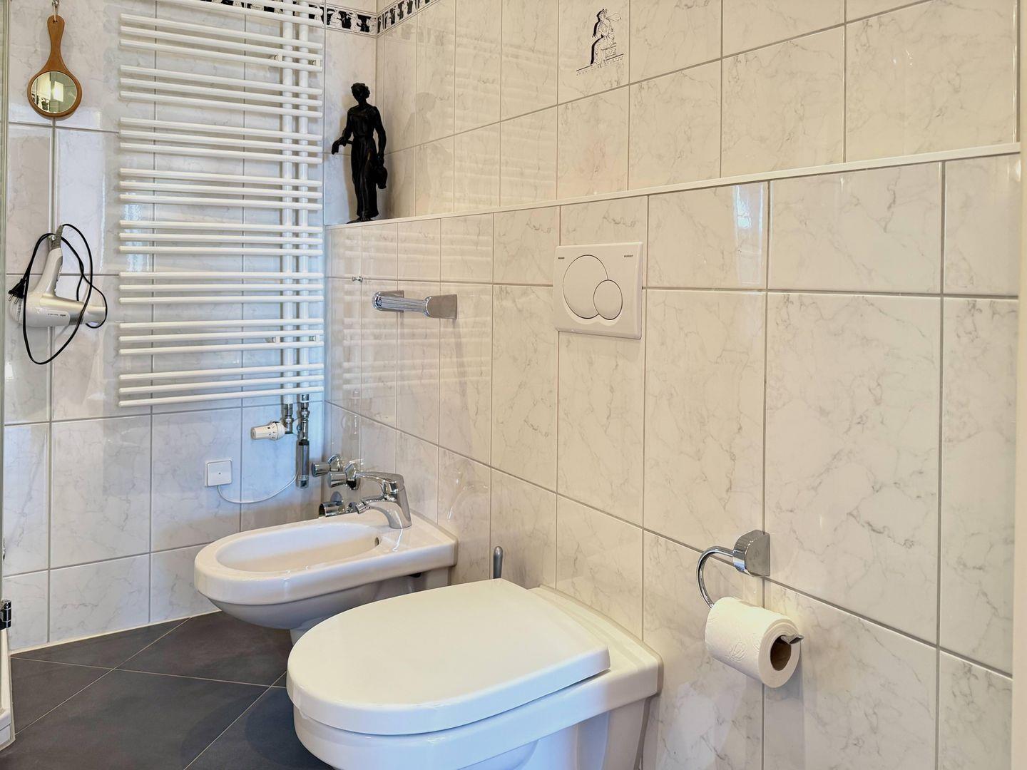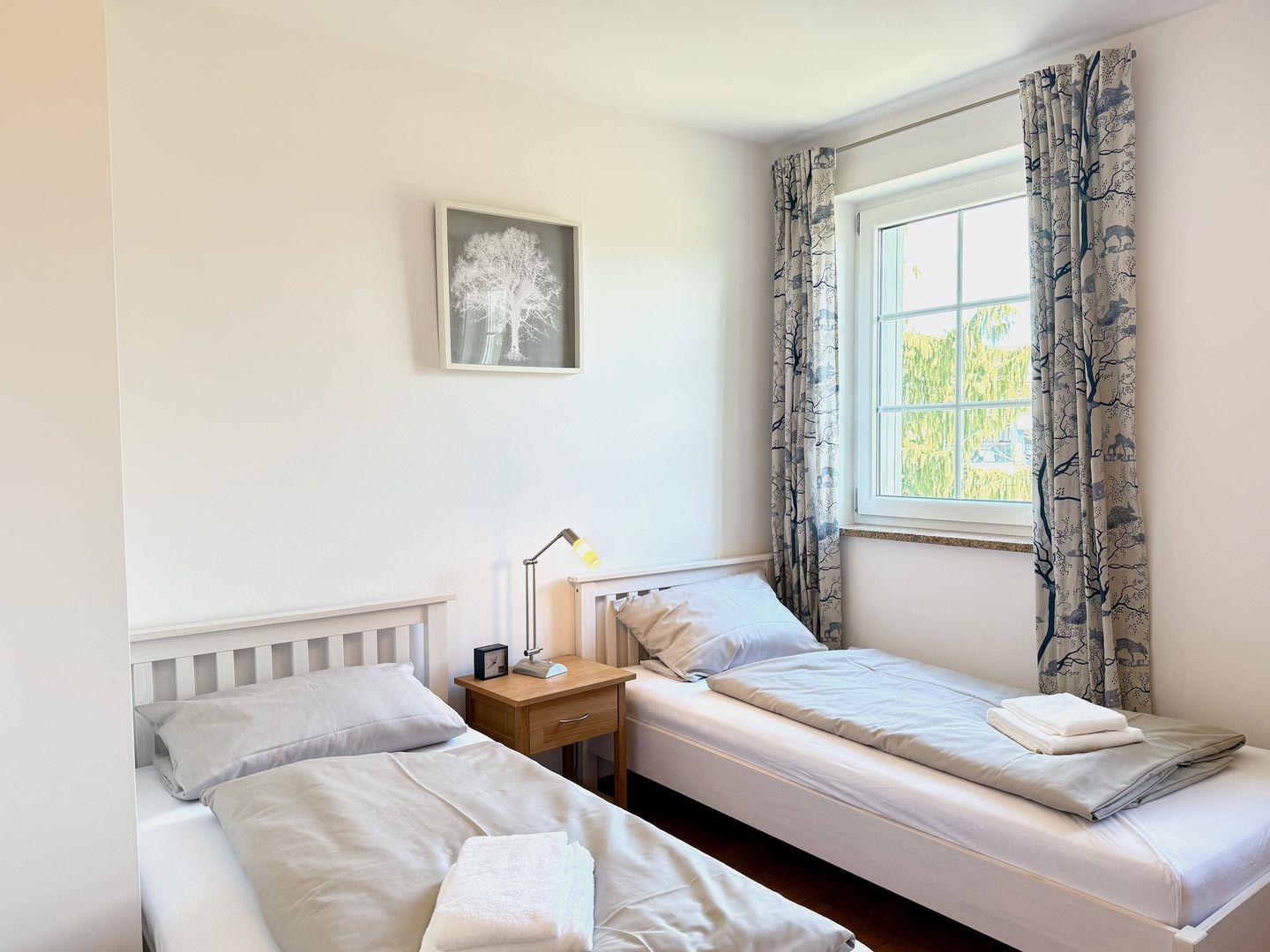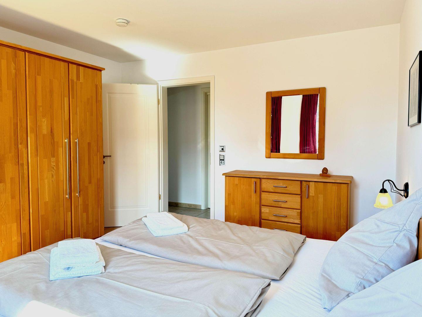 Die Wohnung bietet Platz für 4 Personen und verfügt über zwei Schlafzimmer – eines mit Doppelbett, eines mit zwei Einzelbetten. Das moderne Badezimmer ist mit Dusche, WC und Bidet ausgestattet, zusätzlich gibt es ein separates Gäste-WC. Die voll ausgestattete Küche mit Kühlschrank und Gefrierteil, Geschirrspüler und hochwertigen Geräten bietet alles für gemütliche Mahlzeiten.