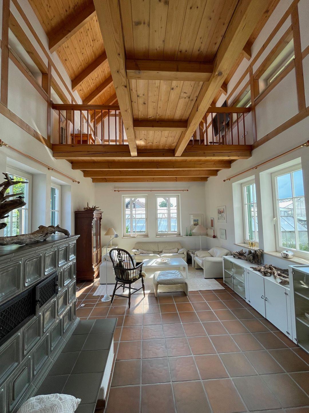 Das Wohnzimmer ist mit einer gemütlichen Sofaecke, Sessel und Kommoden ausgestattet. Auf der Empore ist ein weiterer Sitzbereich mit TV (bis zu 24 Zoll, digitaler Satellitenanschluss). Ein Schlafzimmer ist mit einem zweiten Fernseher ausgestattet. Ein Kaminofen sorgt an kühleren Abenden für behagliche Wärme. Die Gasheizung mit Fußbodenheizung ergänzt das Raumklima optimal. Ein Schreibtisch ermöglicht ungestörtes Arbeiten. Für Unterhaltung bieten sich zwei Fernseher sowie Gesellschaftsspiele an, für moderne Ansprüche ist schnelles WLAN (ab 100 Mbit/s über Kabel bzw. Glasfaser) vorhanden.