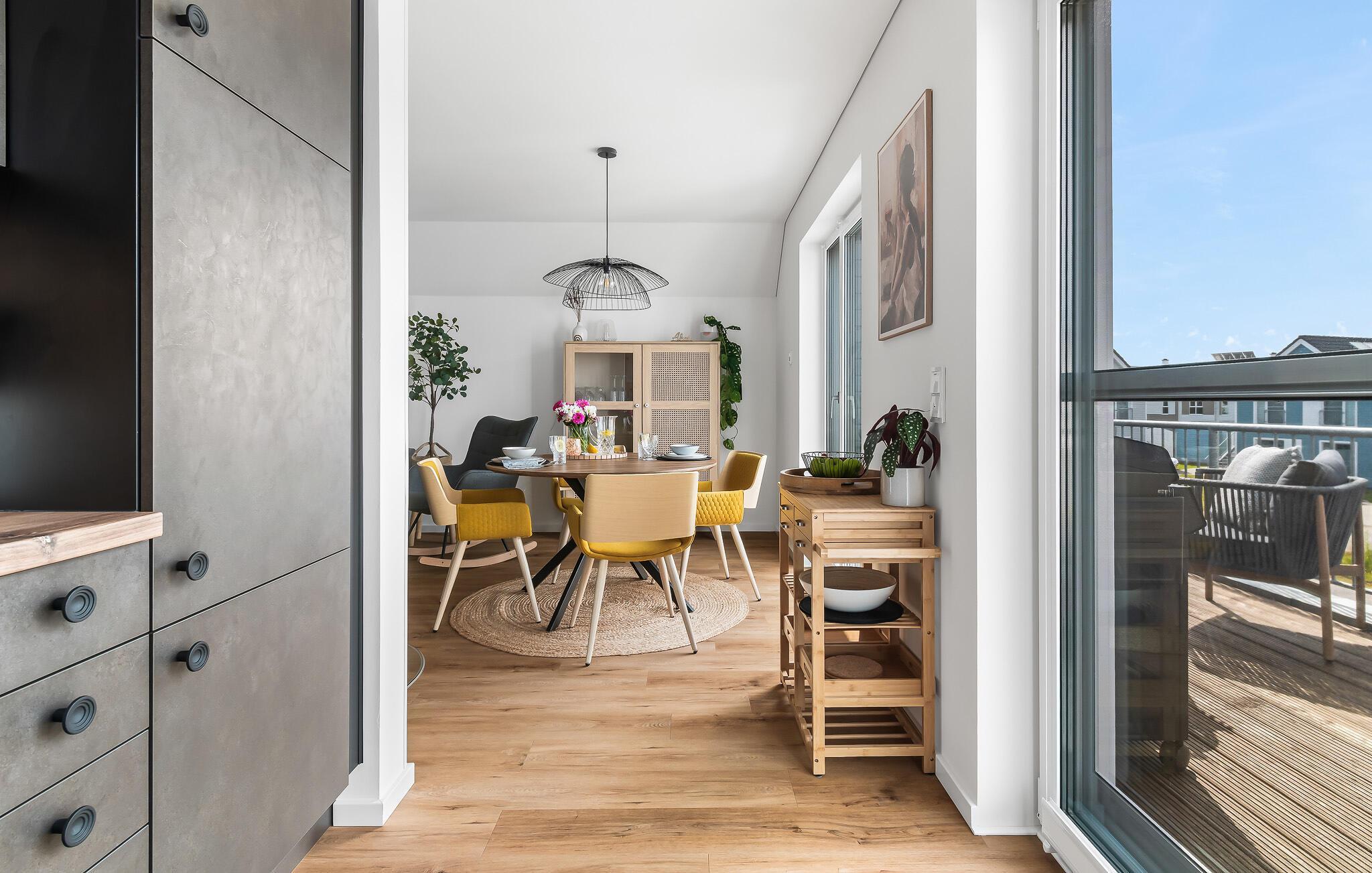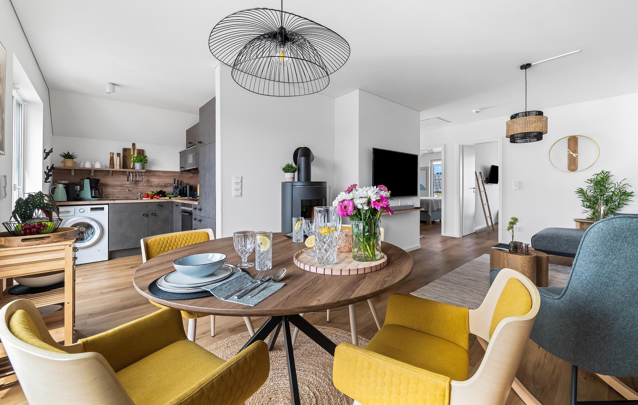 Der Wohn- und Essbereich lädt zu ausgiebigen Frühstücksmomenten, gemeinsamen Mahlzeiten und langen Abenden ein, wobei die hochwertig und vollausgestattete Küche ein Paradies für Hobbyköche ist, die die Zubereitung von Gerichte durch die offene Wohnküche noch geselliger macht.