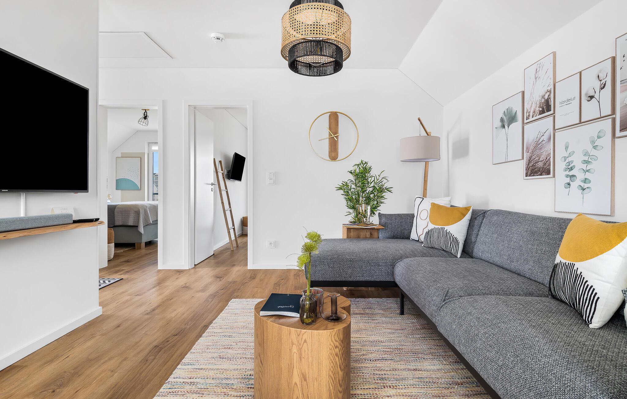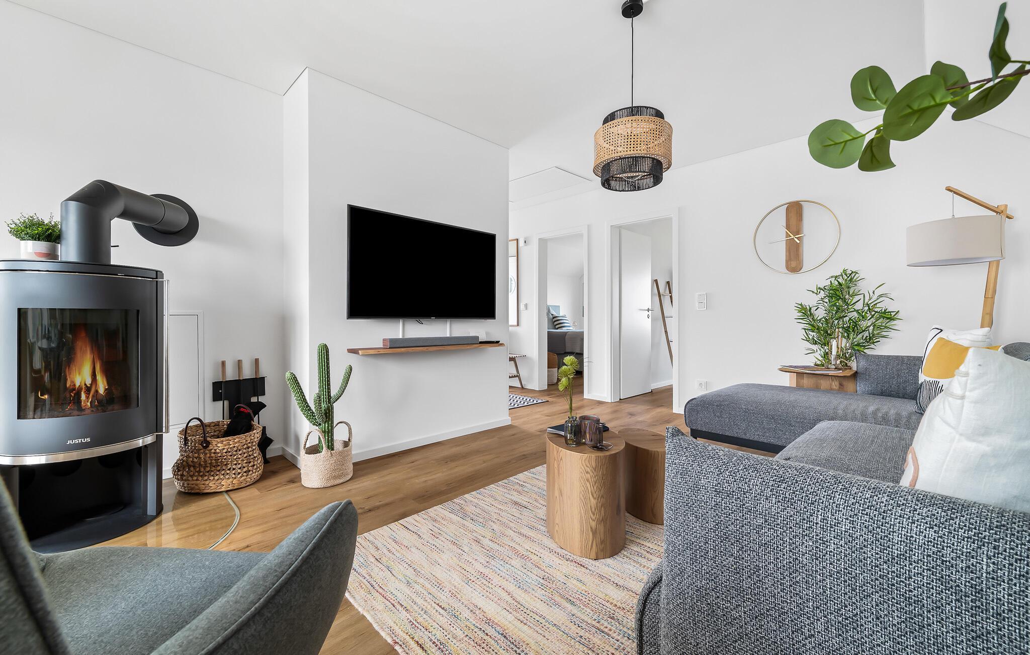 Die gemütliche Sitzecke im Wohnzimmerbereich ist ideal für Filmabende oder zum Genießen der wohligen Atmosphäre mit der ganzen Familie.