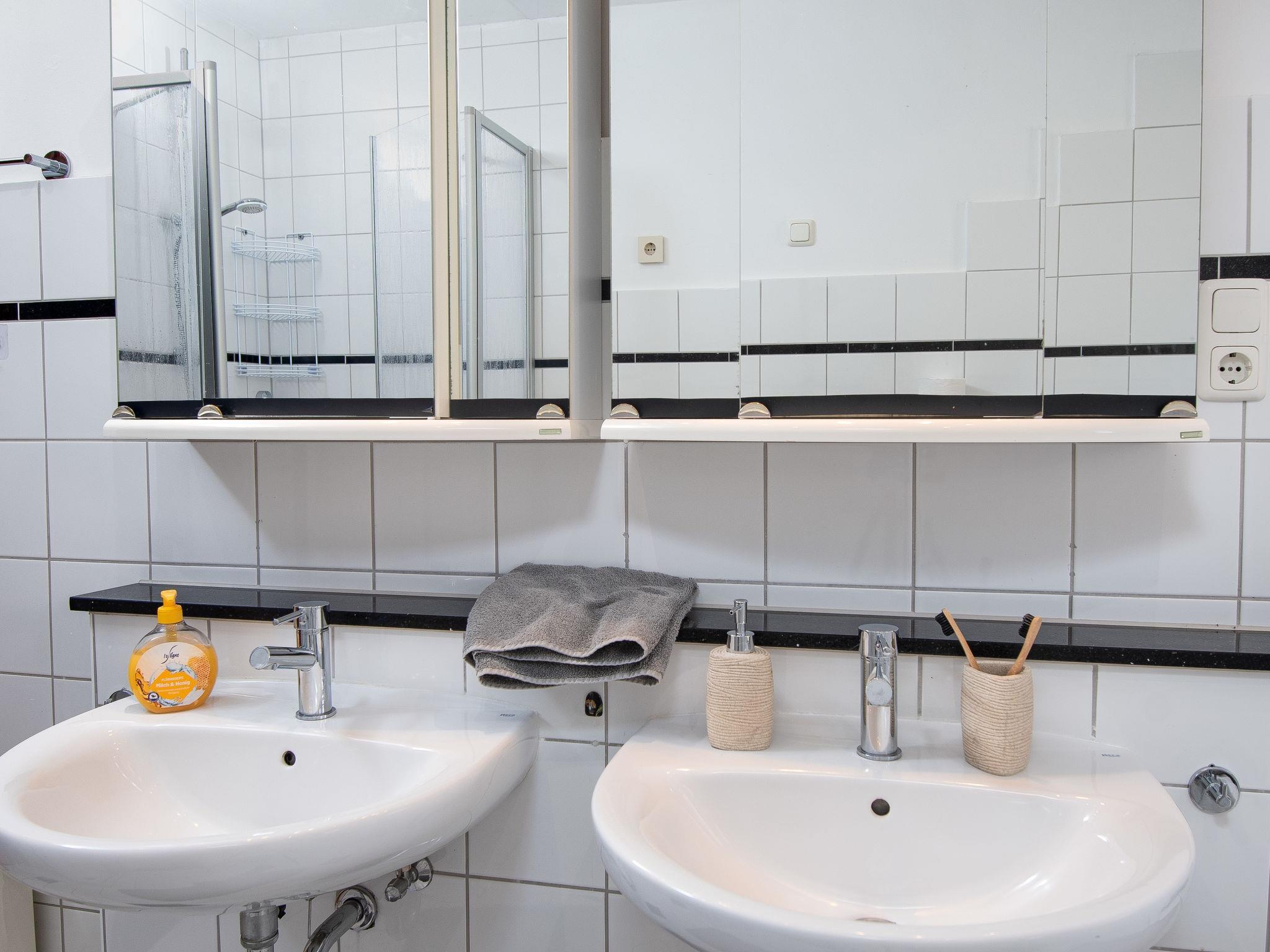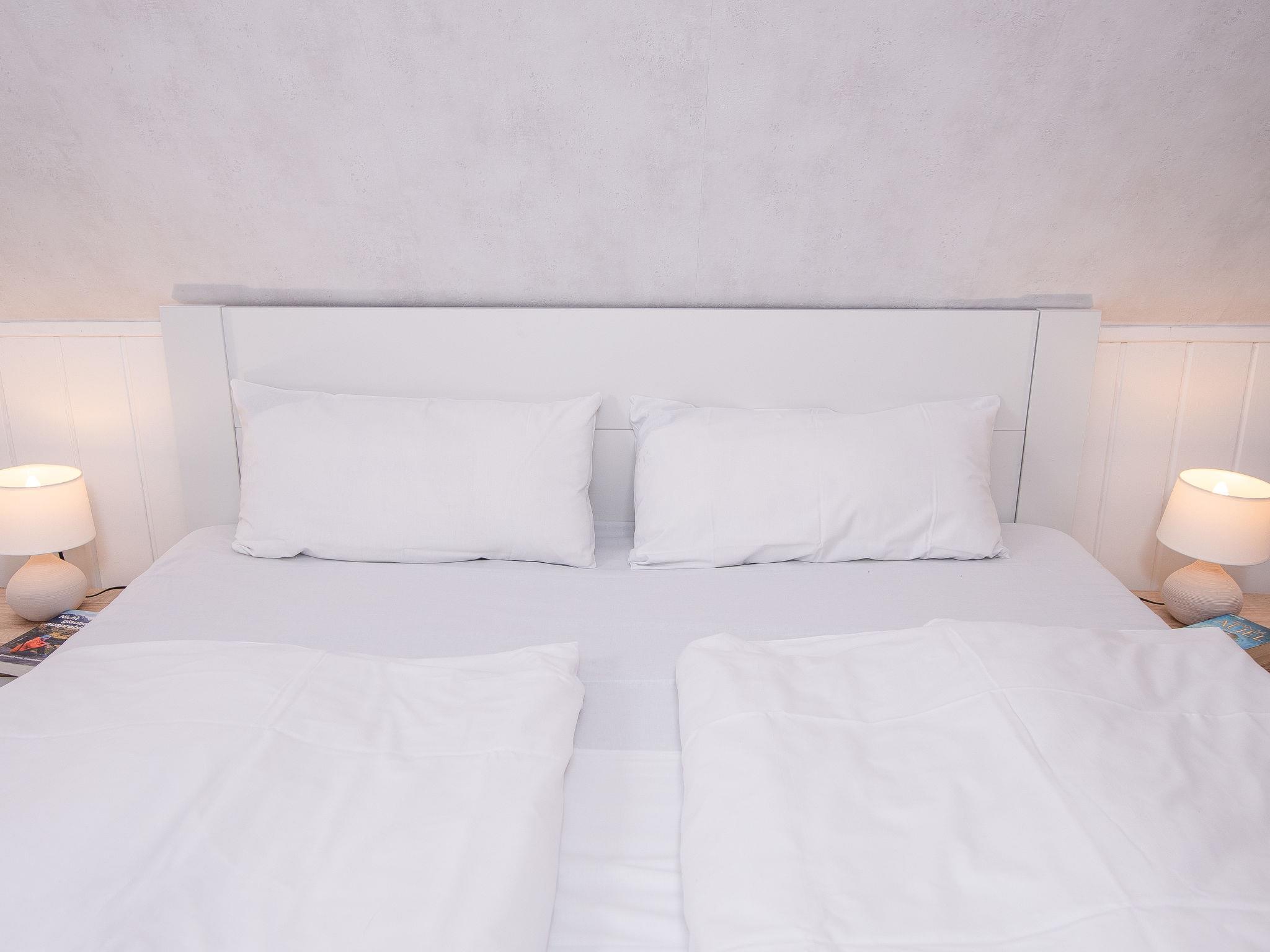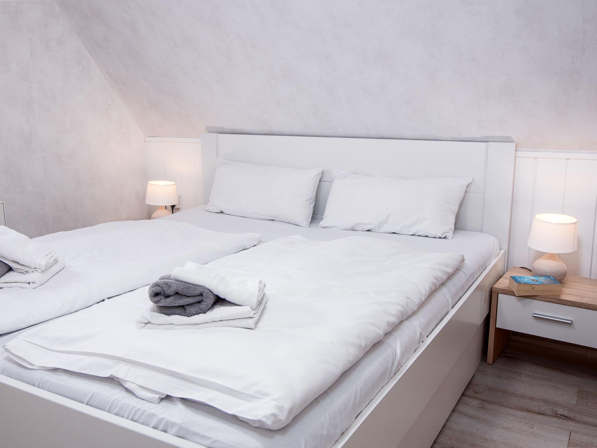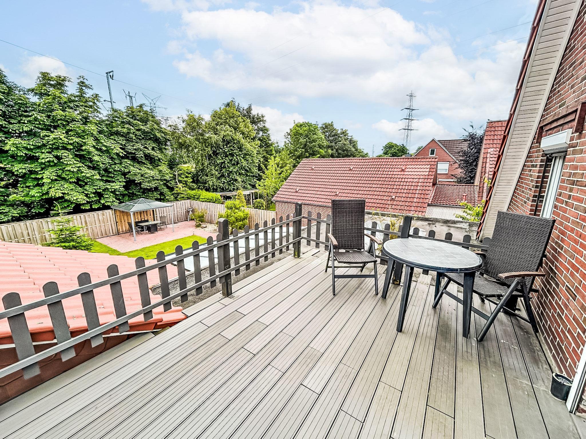 6-room apartment 125 m2 on 2 levels. Cosy furnishings: living room with satellite TV (flat screen). 1 room with 1 double bed. 1 room with 1 pull-out bed (2 pers. 2 x 90 cm, length 200 cm). Kitchen (oven, dishwasher, 4 ceramic glass hob hotplates, toaster, kettle, microwave, electric coffee machine) with dining table. Bath/shower/WC. Upper floor: living/dining room with dining table and satellite TV (flat screen). 1 room with 1 double bed. 1 room with 1 bed. Exit to the balcony. Kitchenette (2 ceramic glass hob hotplates, toaster, kettle, electric coffee machine, Capsules for coffee machine (Senseo) extra). Shower/WC. Large balcony, terrace, garden. Terrace furniture, balcony furniture. Facilities: children's high chair, baby cot for up to 2 year olds (extra). Internet (WiFi, free). Please note: smoke alarm. No internal connecting door between the separated properties.