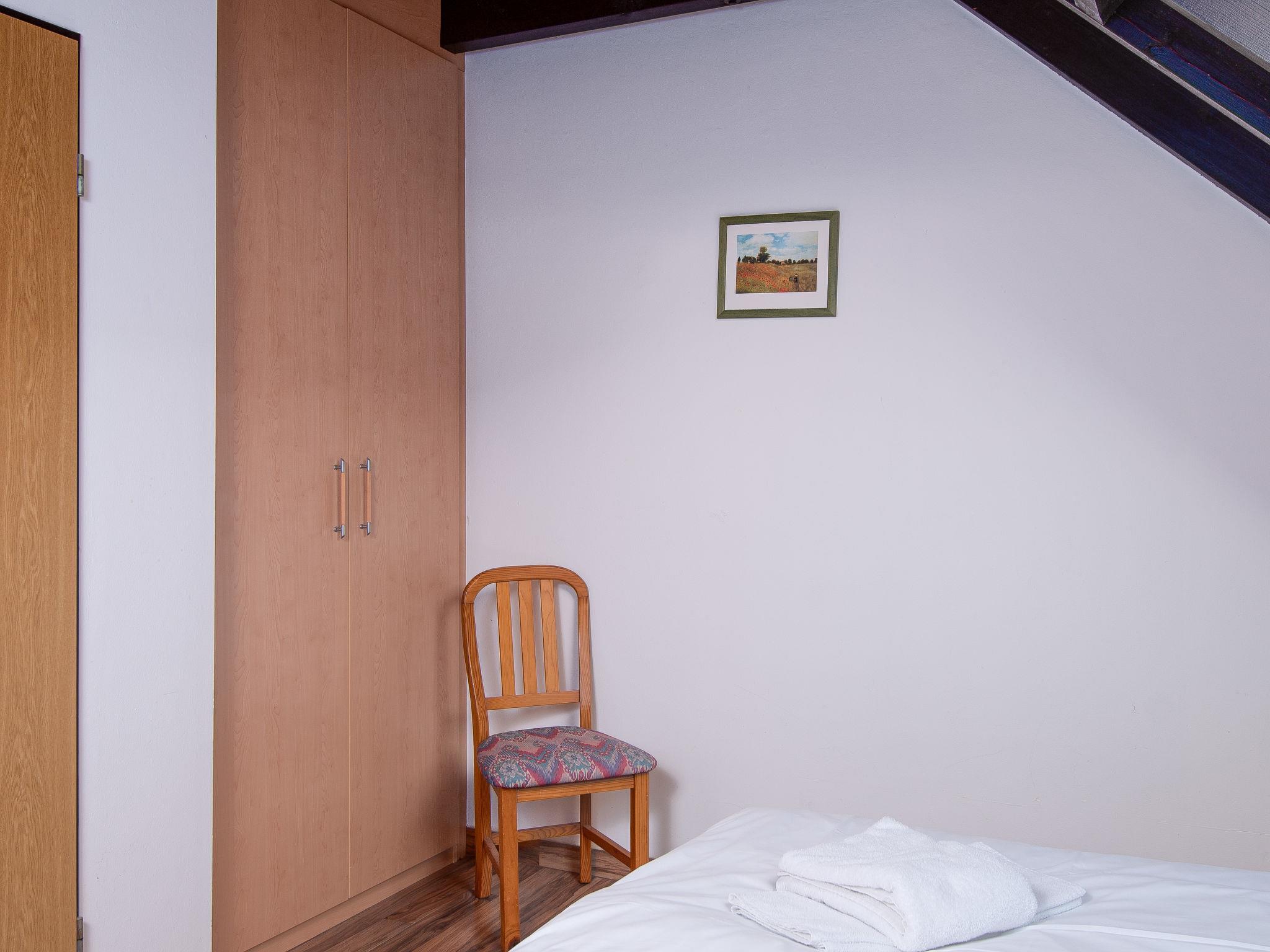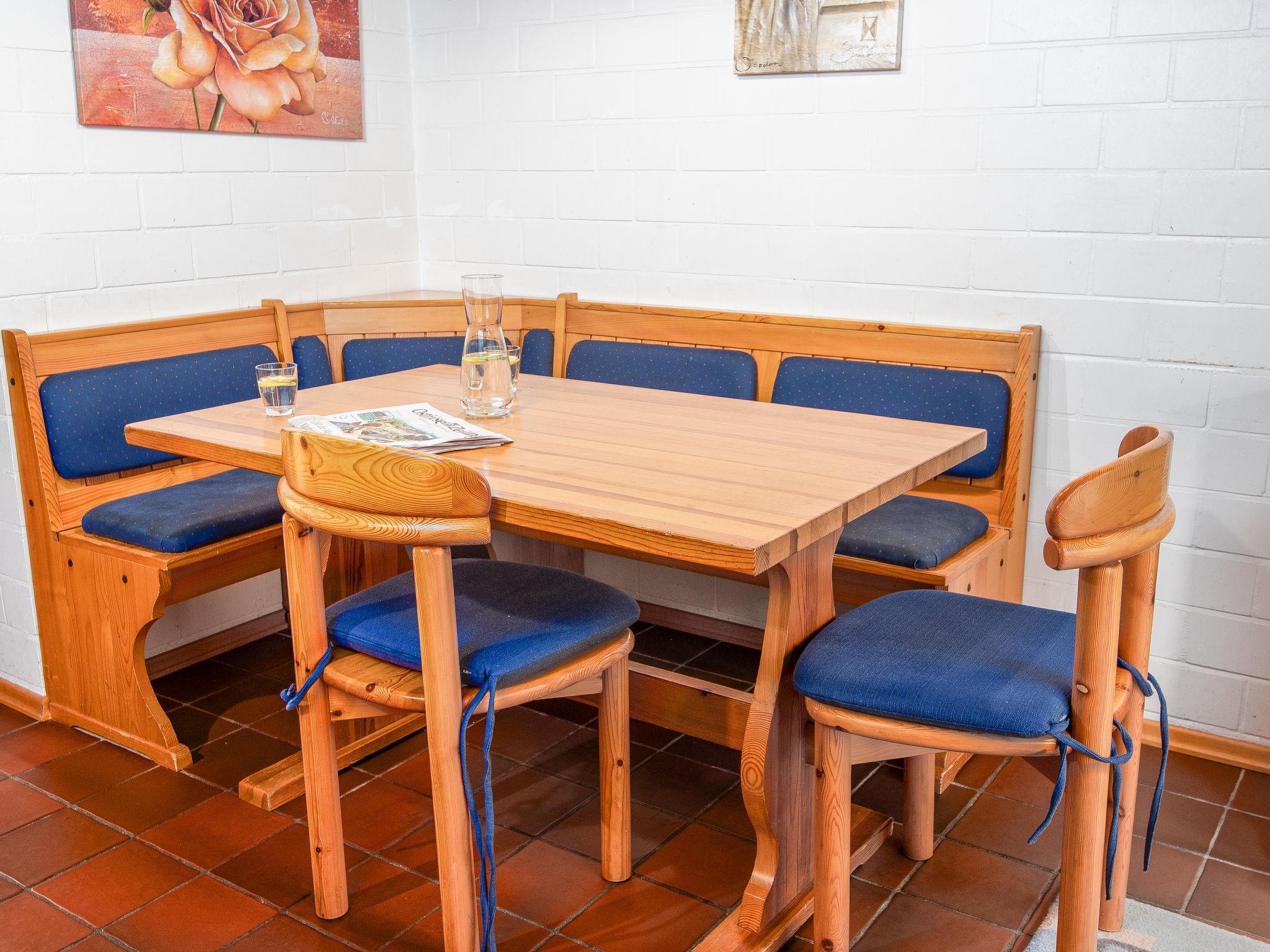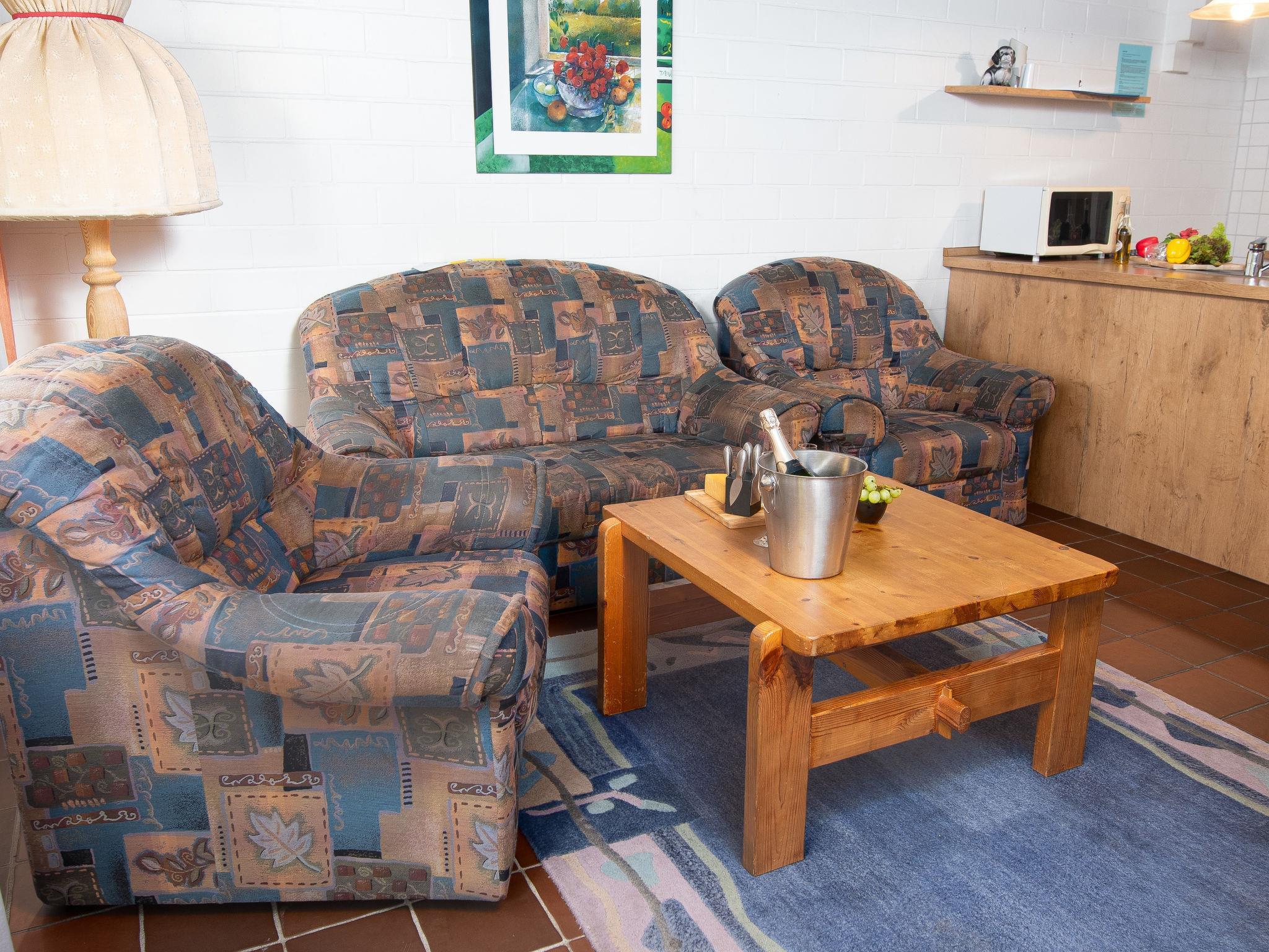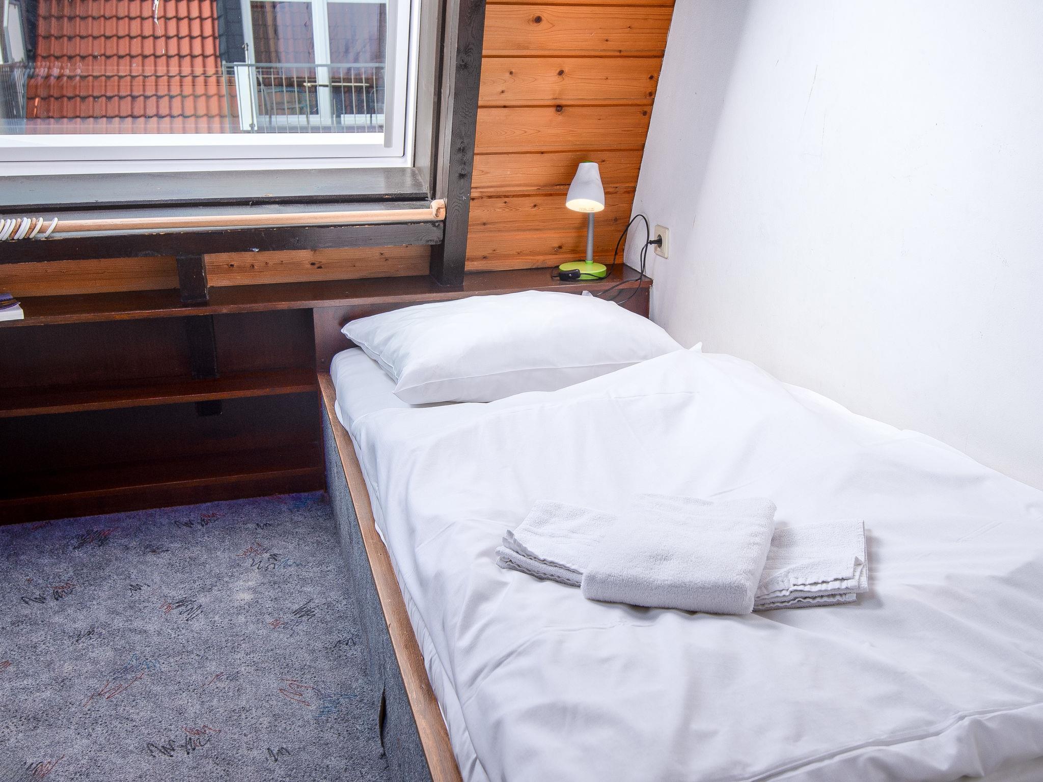 3-room terraced house 75 m2 on 2 levels, on the ground floor. Cosy furnishings: living/dining room 21 m2 with satellite TV, video, hi-fi system and DVD. Kitchenette (oven, dishwasher, 4 ceramic glass hob hotplates, toaster, kettle, microwave, electric coffee machine). Shower/WC. Upper floor: 1 room 9 m2, with sloping ceilings with 1 double bed (2 x 90 cm, length 200 cm). 1 room 7 m2, with sloping ceilings with 2 beds (90 cm, length 200 cm). Sep. WC. Terrace. Terrace furniture. Facilities: children's high chair (extra). Please note: non-smoking house.