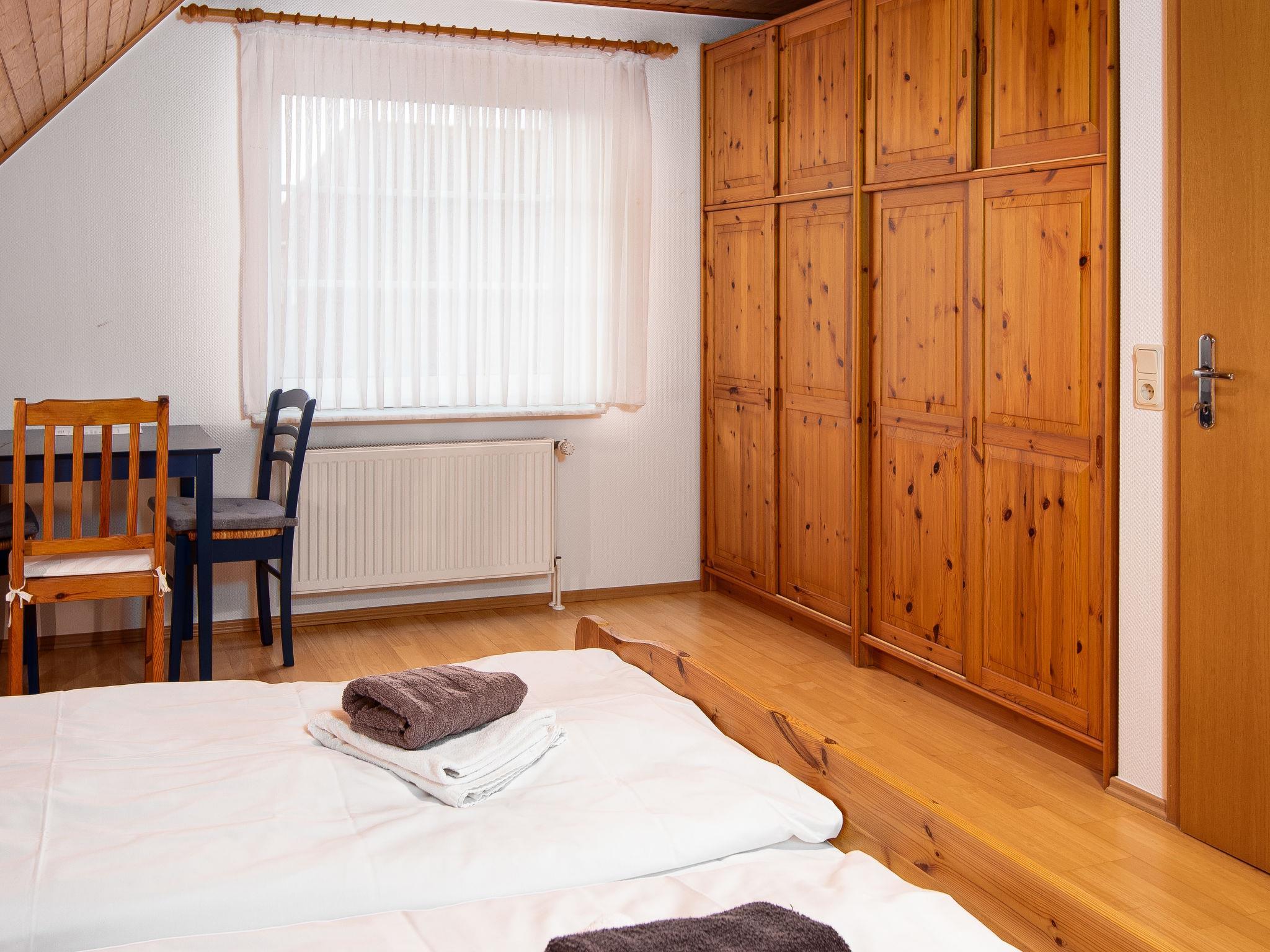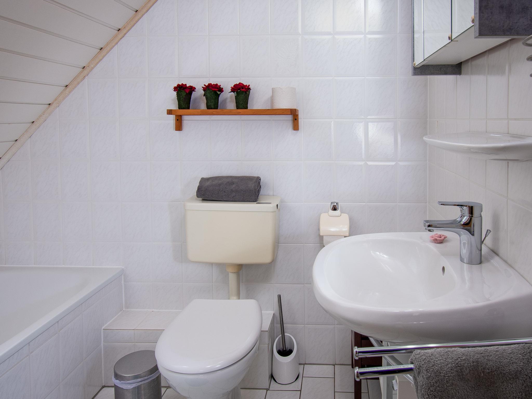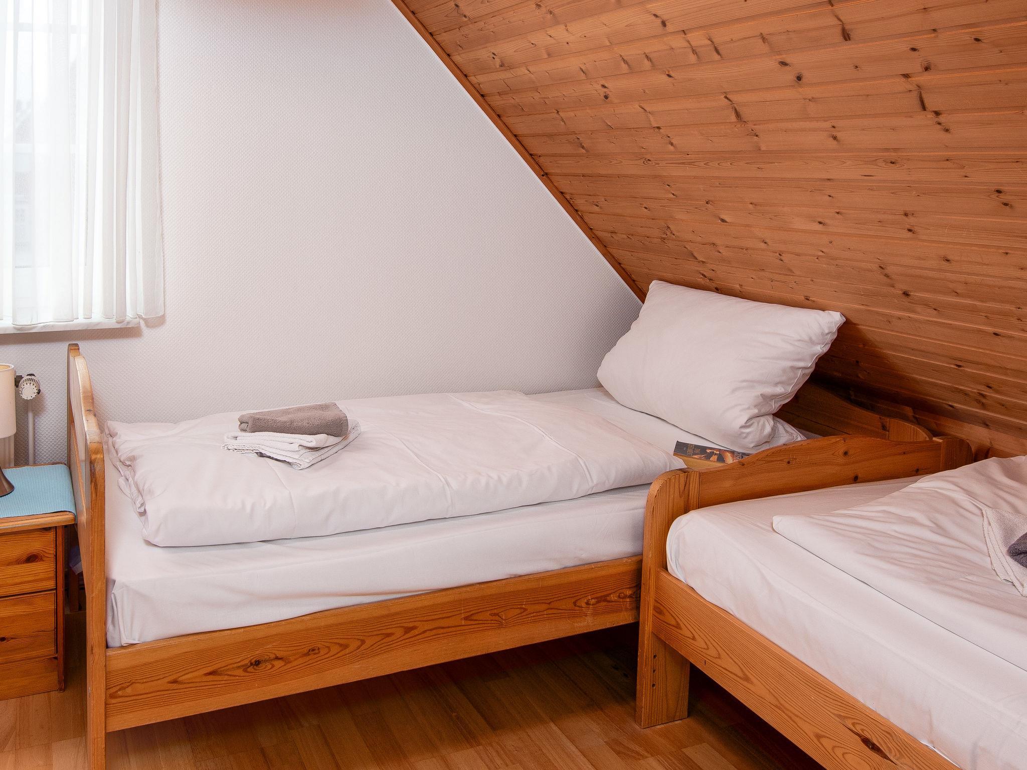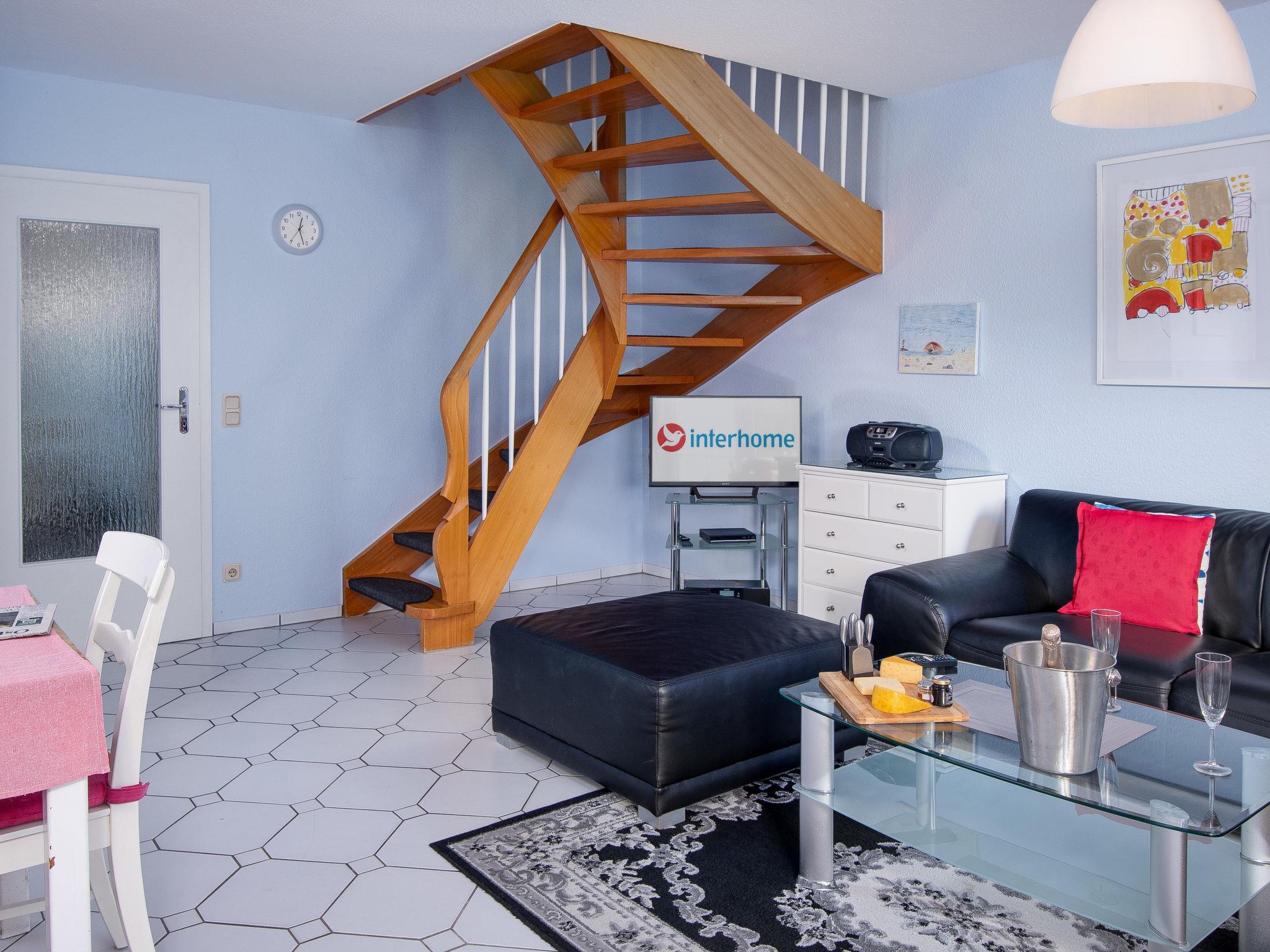 "Krebs", 3-room terraced house 82 m2 on 2 levels. Cosy furnishings: living/dining room with cable TV (flat screen), radio and CD-player. Exit to the terrace. Kitchen (oven, dishwasher, 4 ceramic glass hob hotplates, toaster, kettle, microwave, electric coffee machine). Shower/WC. Upper floor: 1 room with sloping ceilings with 1 double bed (2 x 90 cm, length 200 cm). 1 room with sloping ceilings with 2 beds (90 cm, length 200 cm), bath/WC. Terrace. Terrace furniture, barbecue. Facilities: washing machine, dryer, children's high chair (extra). Internet (WiFi, free). Please note: non-smoking house. Smoke alarm.