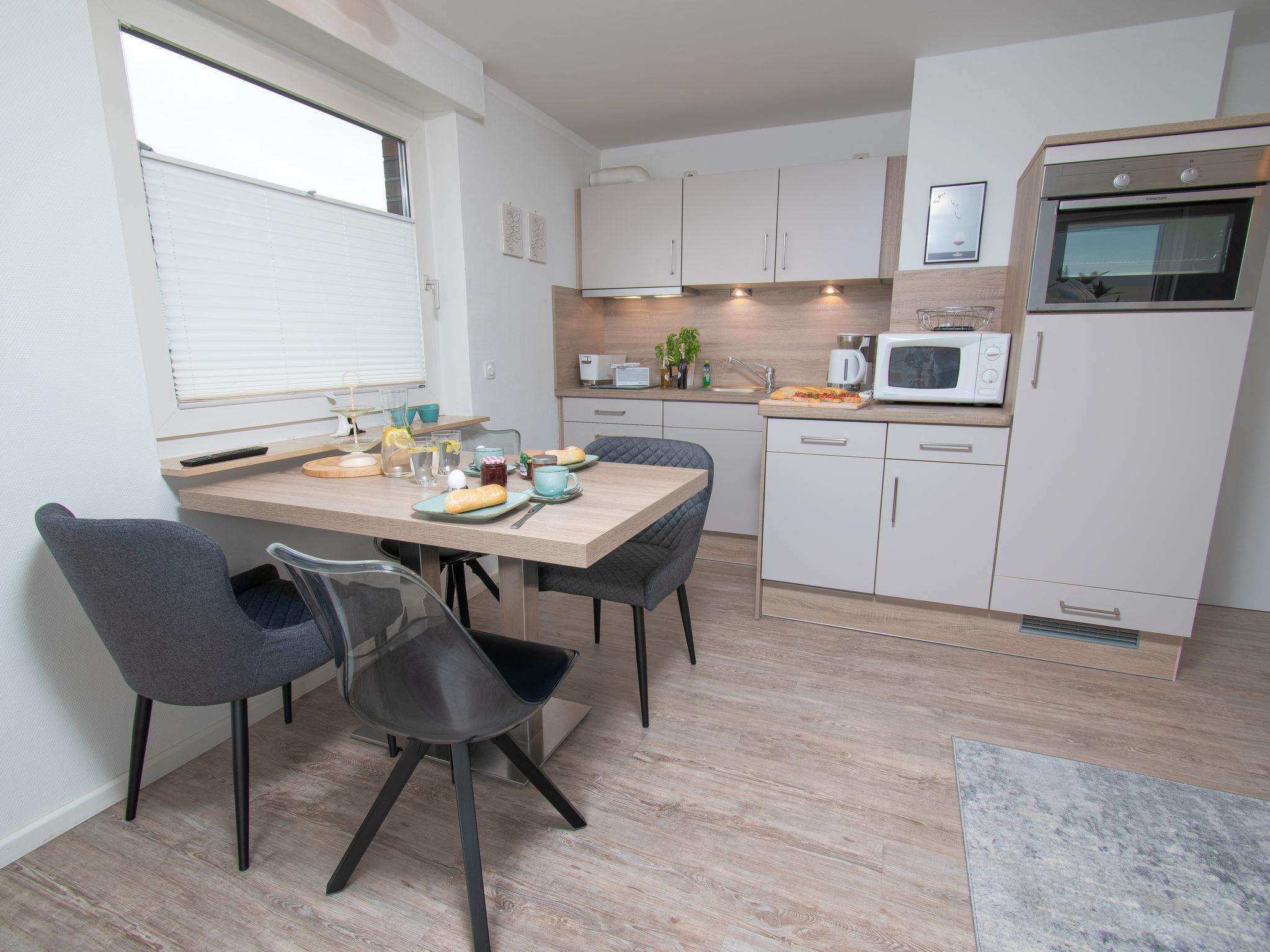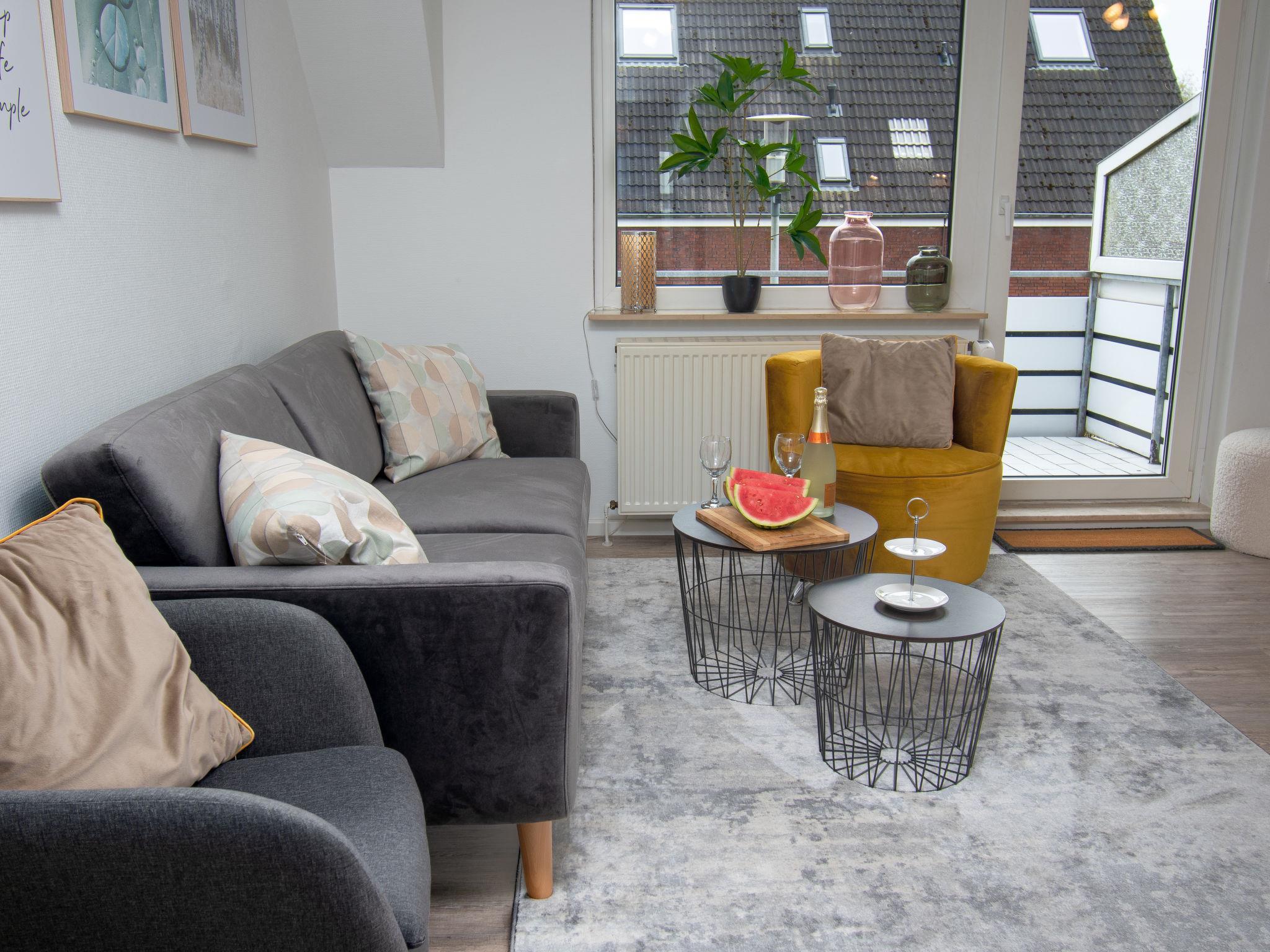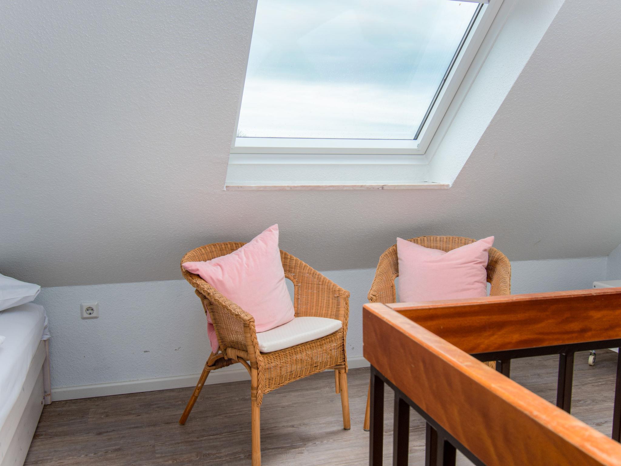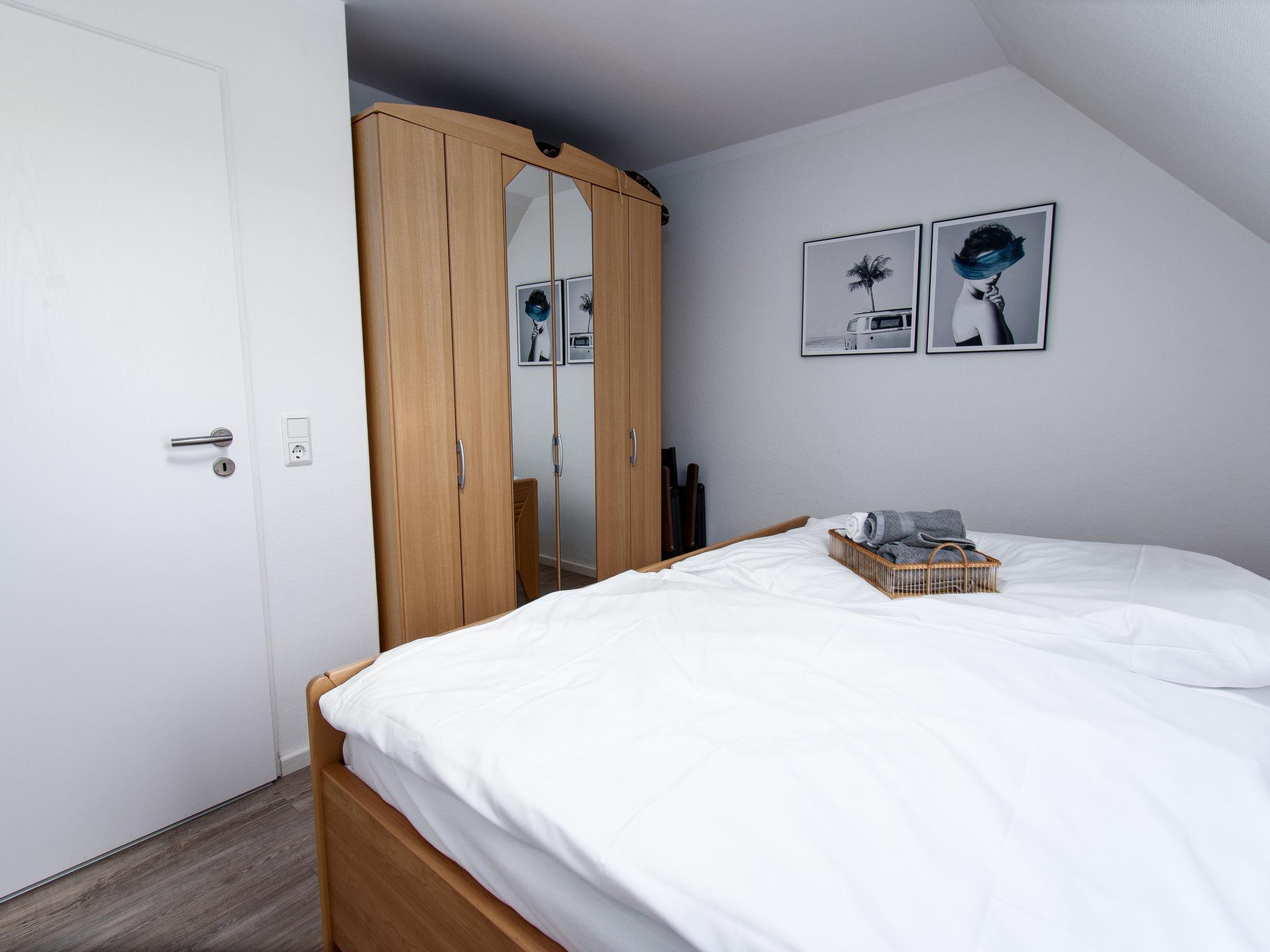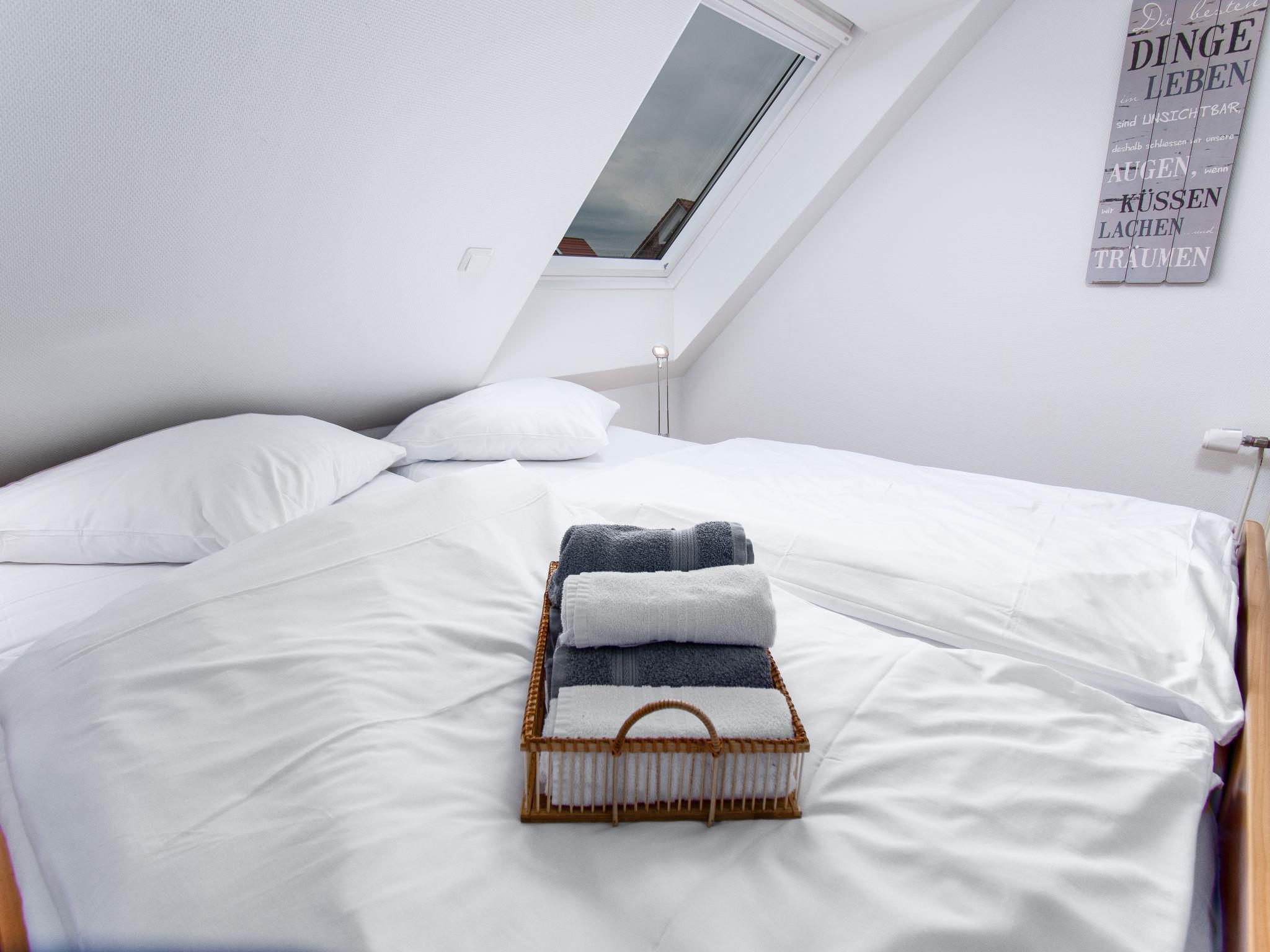 "Sanddüne", 3-room apartment 58 m2 on 2 levels on 1st floor. Tasteful and cosy furnishings: living/dining room 18 m2 with satellite TV (flat screen). Exit to the balcony. 1 room 10 m2 with 1 double bed (2 x 90 cm, length 200 cm). Kitchenette (dishwasher, 4 ceramic glass hob hotplates, toaster, microwave, electric coffee machine). Shower/WC. Upper floor: (steep stair), 1 room 10 m2, with sloping ceilings with 2 beds (90 cm, length 200 cm). Small balcony. Balcony furniture. Facilities: children's high chair (extra). Internet (WiFi, free). Please note: non-smokers only. Smoke alarm. Access to the upper floor via a staircase. DE2981.471.1