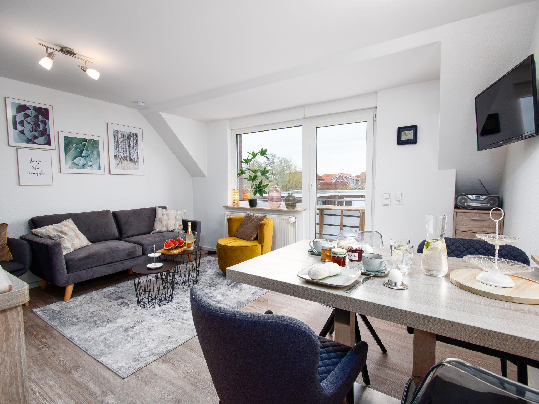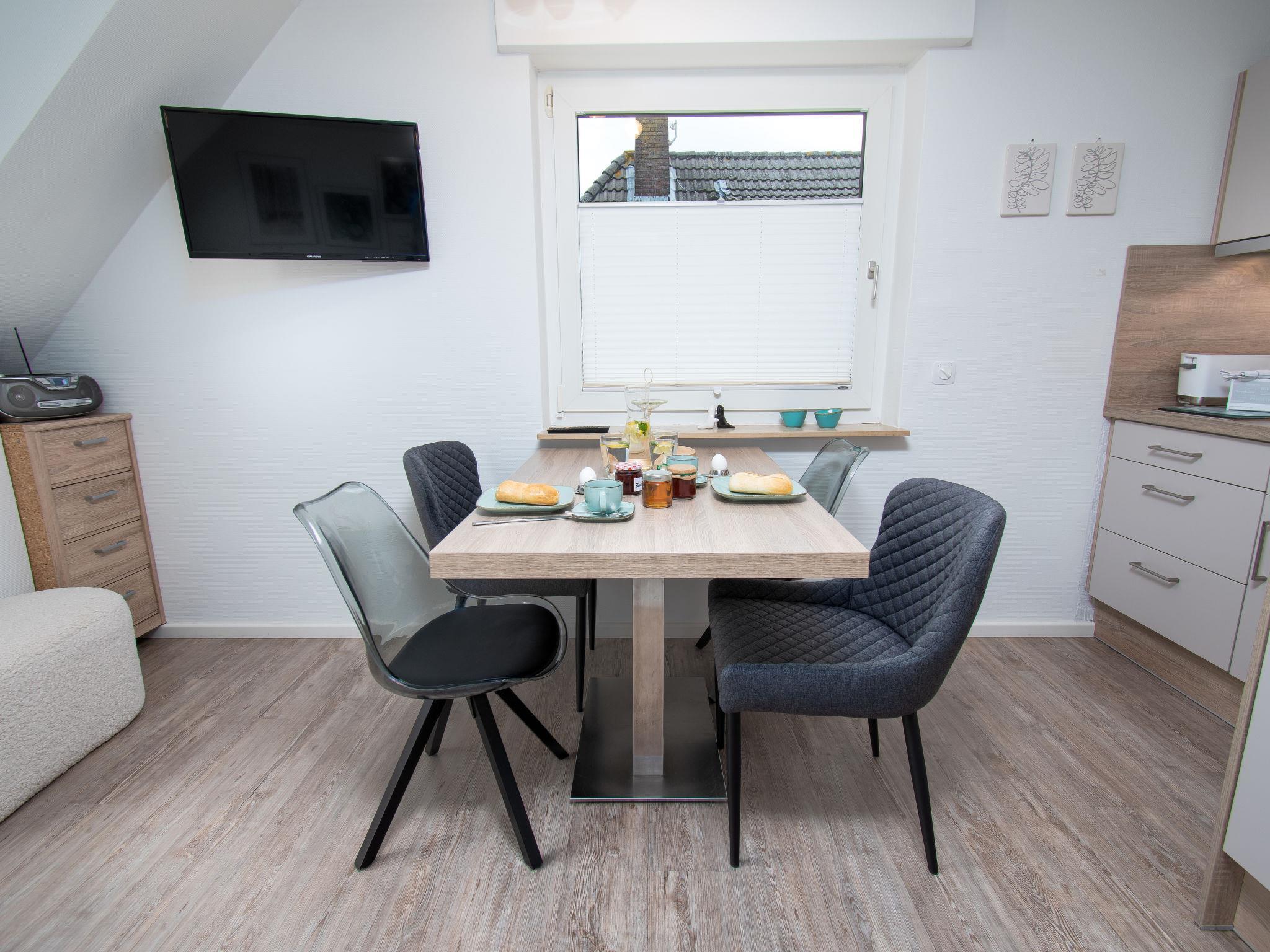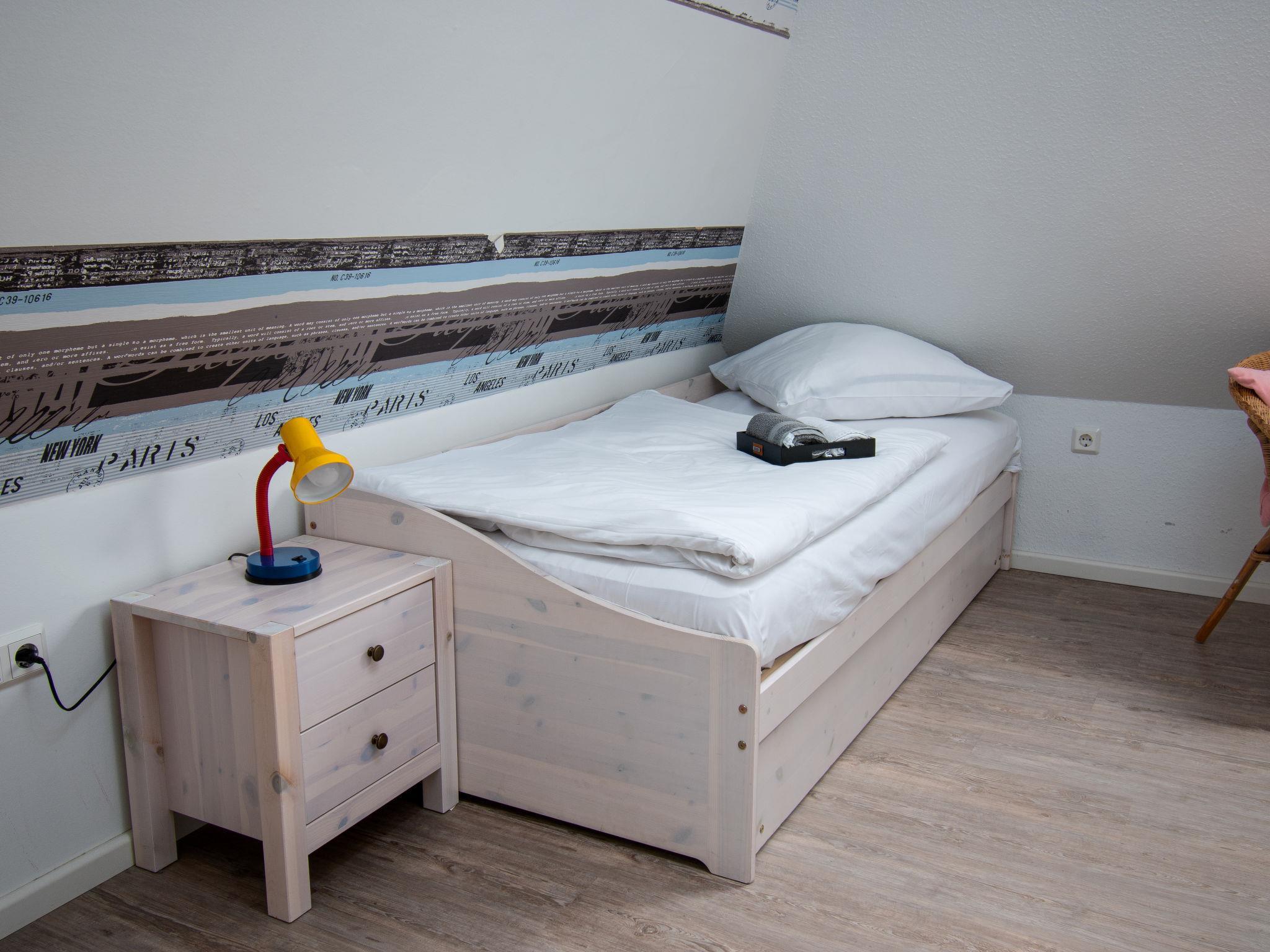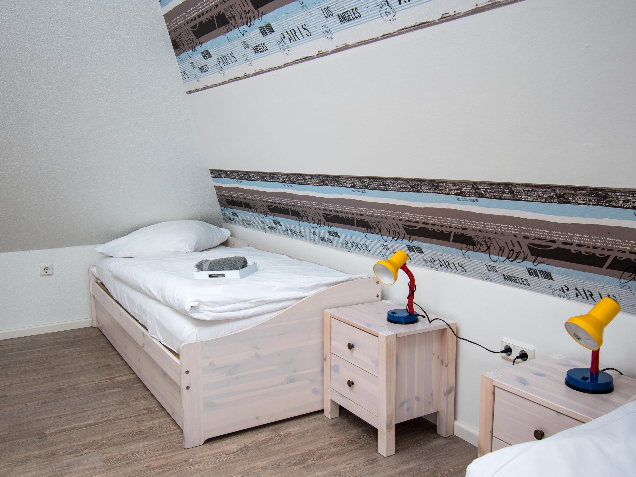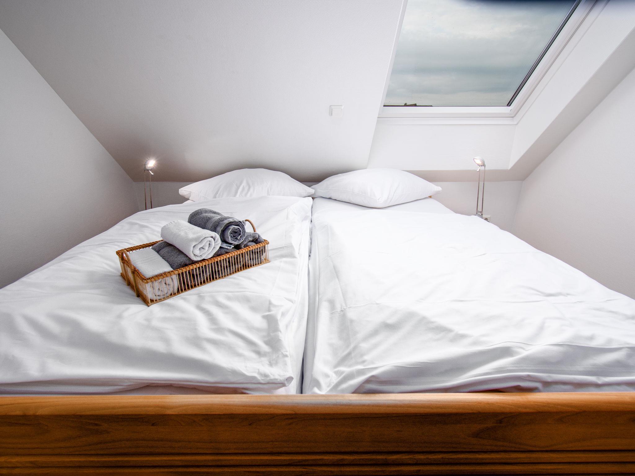 "Sanddüne", 3-room apartment 58 m2 on 2 levels on 1st floor. Tasteful and cosy furnishings: living/dining room 18 m2 with satellite TV (flat screen). Exit to the balcony. 1 room 10 m2 with 1 double bed (2 x 90 cm, length 200 cm). Kitchenette (dishwasher, 4 ceramic glass hob hotplates, toaster, microwave, electric coffee machine). Shower/WC. Upper floor: (steep stair), 1 room 10 m2, with sloping ceilings with 2 beds (90 cm, length 200 cm). Small balcony. Balcony furniture. Facilities: children's high chair (extra). Internet (WiFi, free). Please note: non-smokers only. Smoke alarm. Access to the upper floor via a staircase. DE2981.471.1