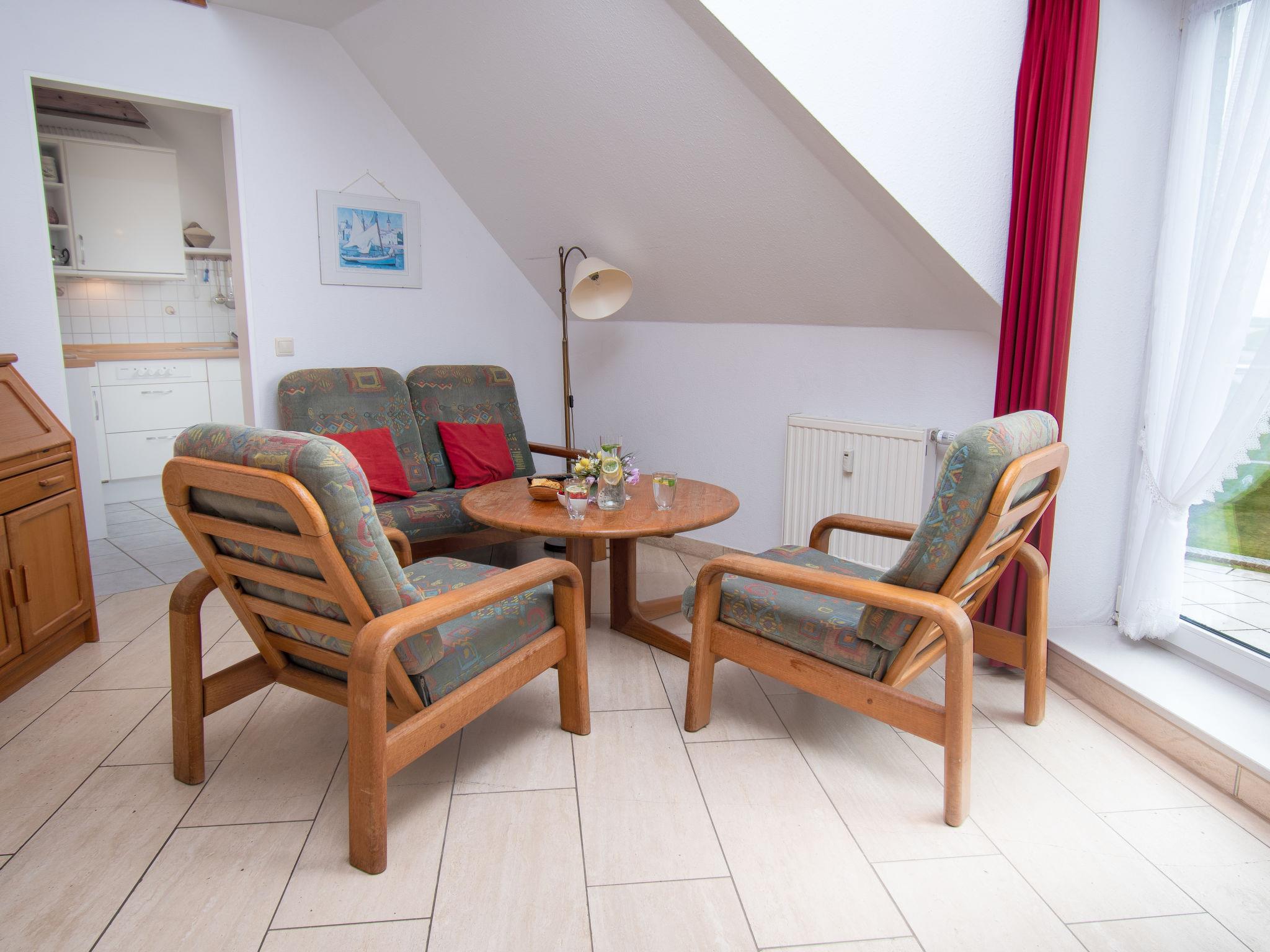 "Meerblick", 2-room apartment 60 m2 on 3rd floor. Cosy furnishings: living room 17 m2 with satellite TV (flat screen). 1 room 11 m2 with 2 fold-away beds (80 cm, length 190 cm). Kitchen 6 m2 (4 ceramic glass hob hotplates, toaster, kettle, microwave, electric coffee machine) with dining table. Shower/WC. Small balcony 4 m2. Balcony furniture. Beautiful view of the sea. Facilities: children's high chair (extra). Please note: non-smokers only. Smoke alarm, no lift.
