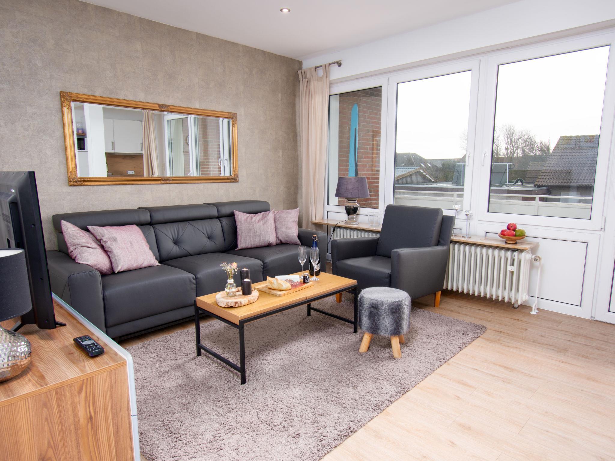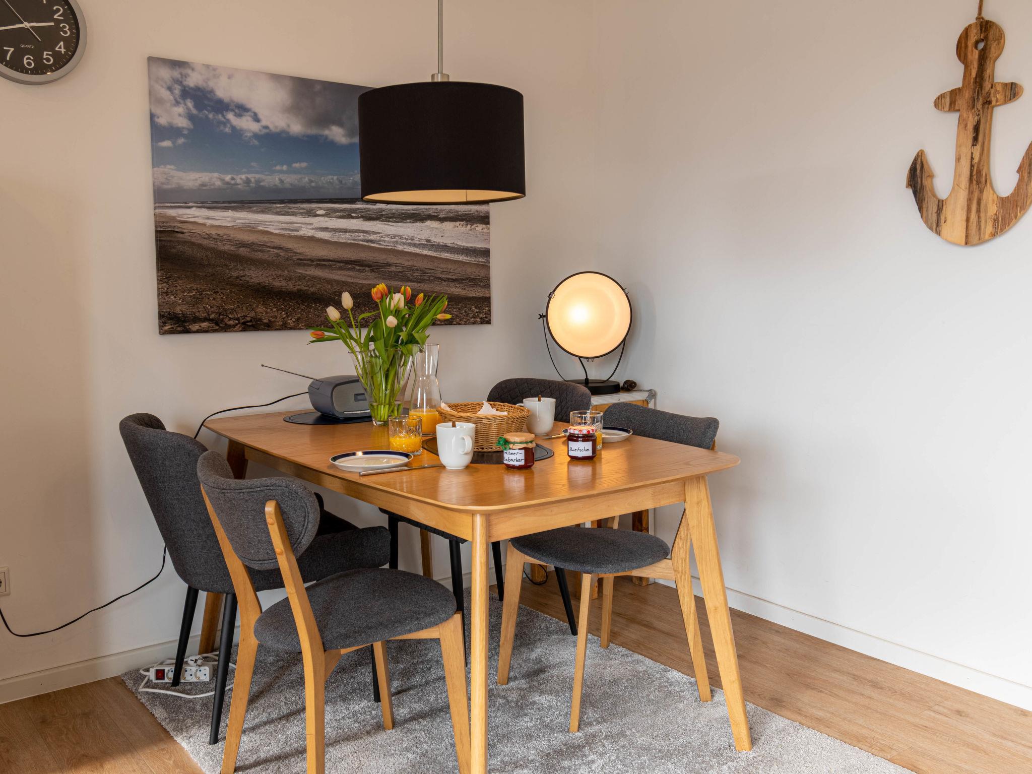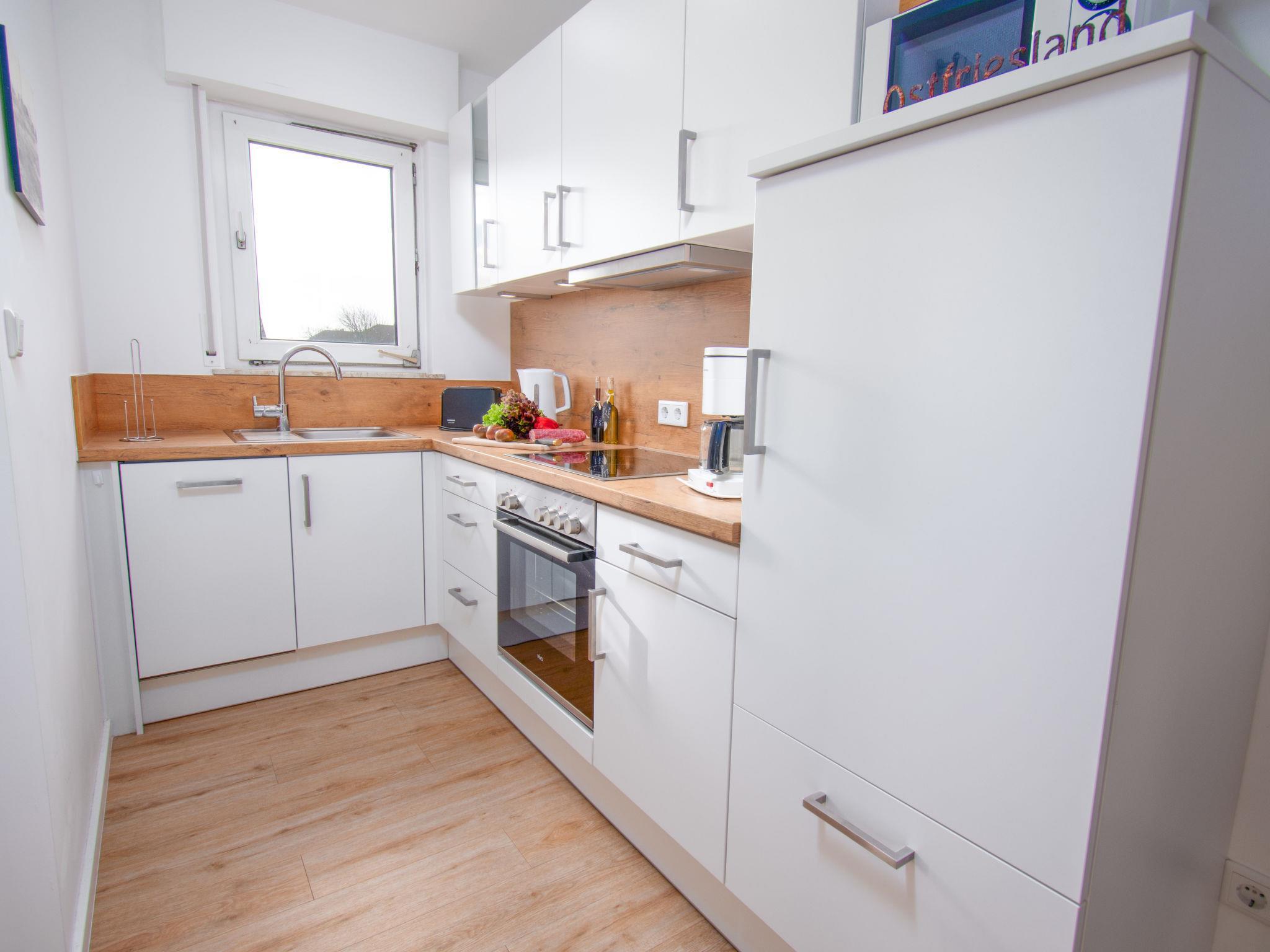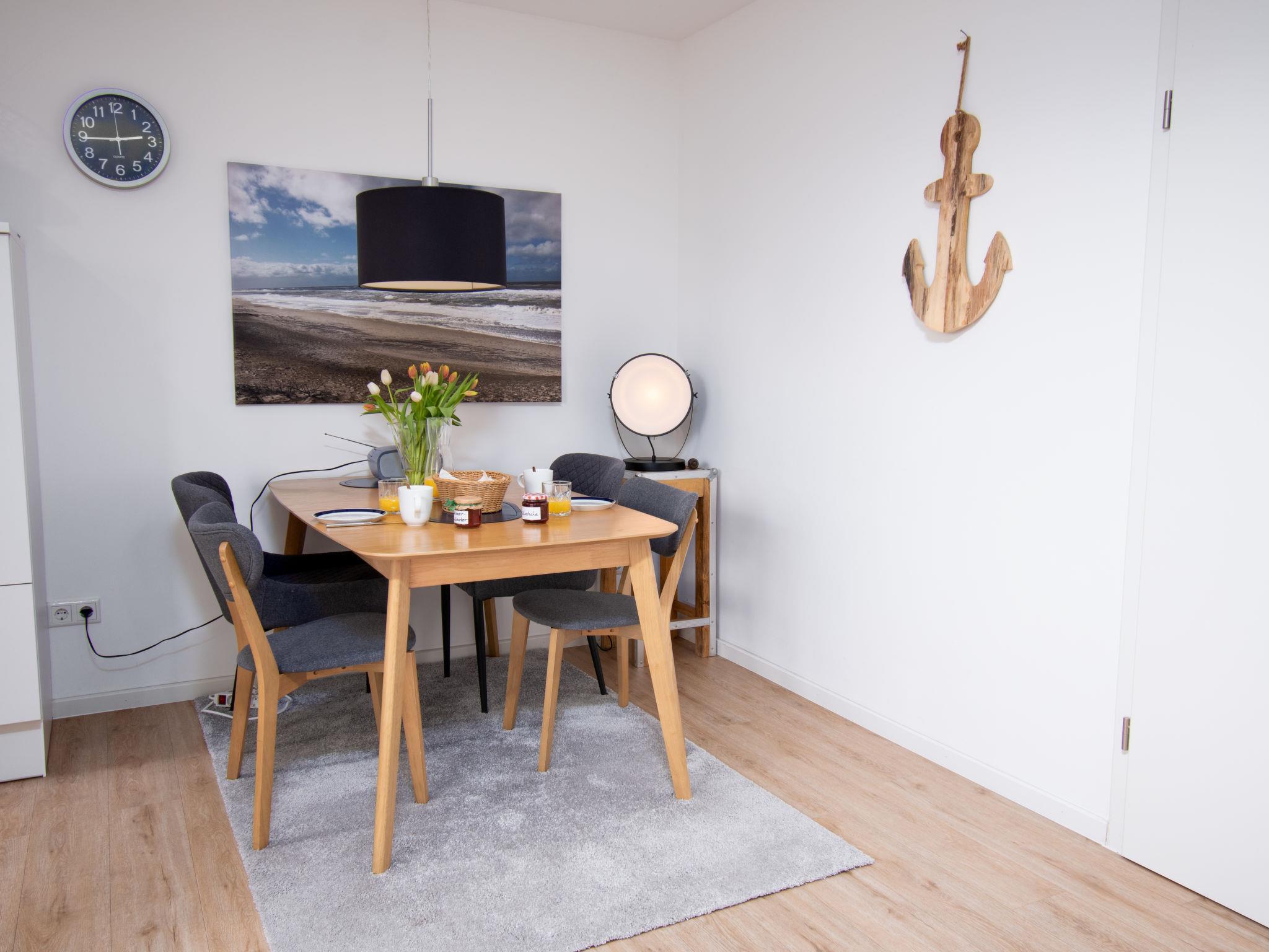 "Gezeiten", 3-room apartment 55 m2 on 1st floor. Tasteful furnishings: living/dining room 16 m2 with satellite TV (flat screen). Exit to the balcony. 1 room 8 m2 with 1 double bed (160 cm, length 200 cm), satellite TV (flat screen). 1 room 3 m2, without window with 1 bed (90 cm, length 180 cm). Kitchenette (oven, dishwasher, 4 ceramic glass hob hotplates, toaster, kettle, microwave, electric coffee machine). Shower/WC. Balcony furniture, electric barbecue. Facilities: children's high chair (extra). Internet (WiFi, free). Please note: non-smokers only. Smoke alarm.