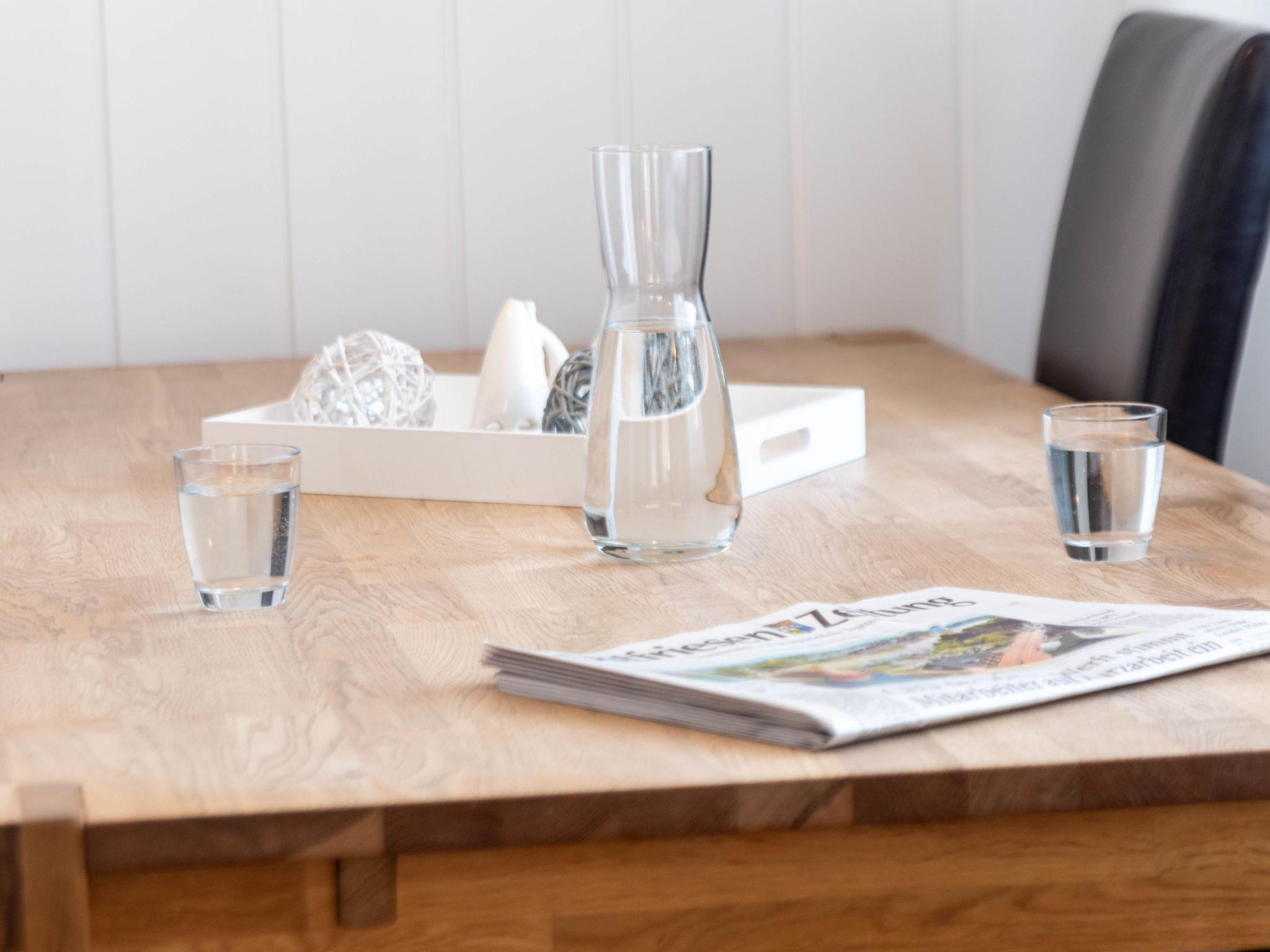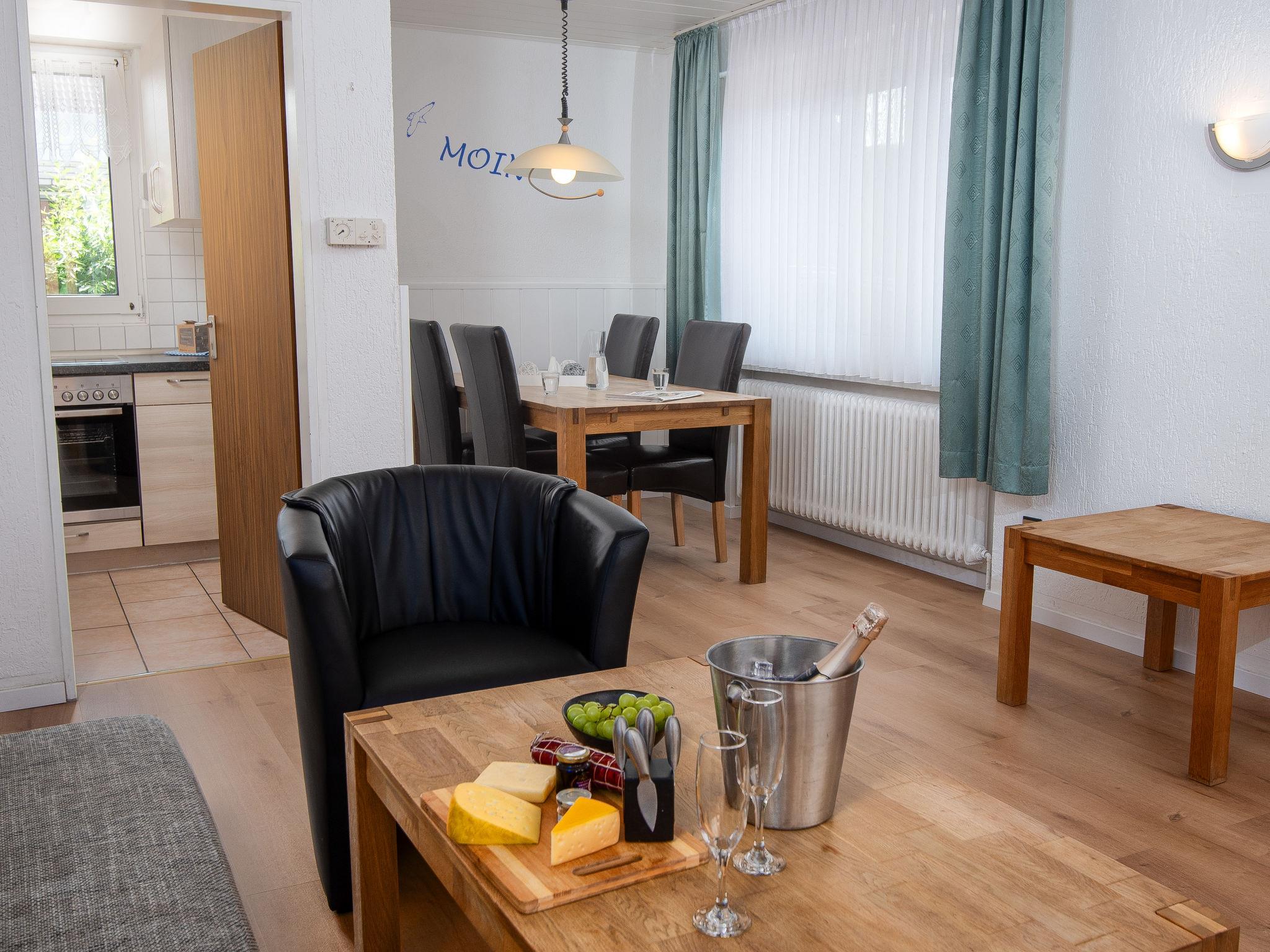 "Schwalbennest I", 3-room apartment 70 m2, on the ground floor. Very simple furnishings: living/dining room 21 m2 with digital TV, flat screen and radio. 1 room 11 m2 with 1 double bed (2 x 90 cm, length 200 cm). 1 room 7 m2 with 2 beds (90 cm, length 190 cm). Small kitchen 3 m2 (oven, dishwasher, 4 ceramic glass hob hotplates, toaster, kettle, electric coffee machine). Shower/WC. Sitting area. Facilities: children's high chair (extra). Parking at the house. Please note: non-smokers only. Maximum 1 small pet/ dog allowed. Smoke alarm.