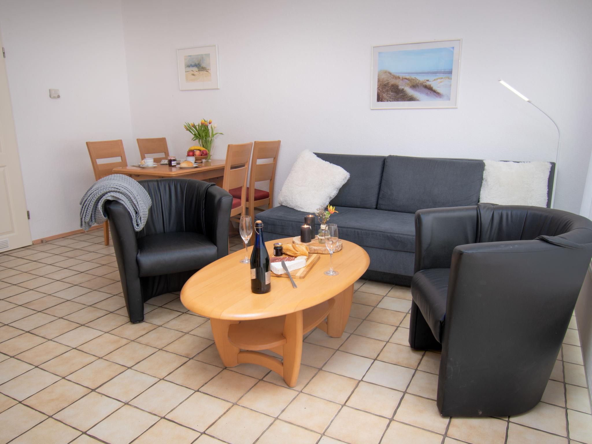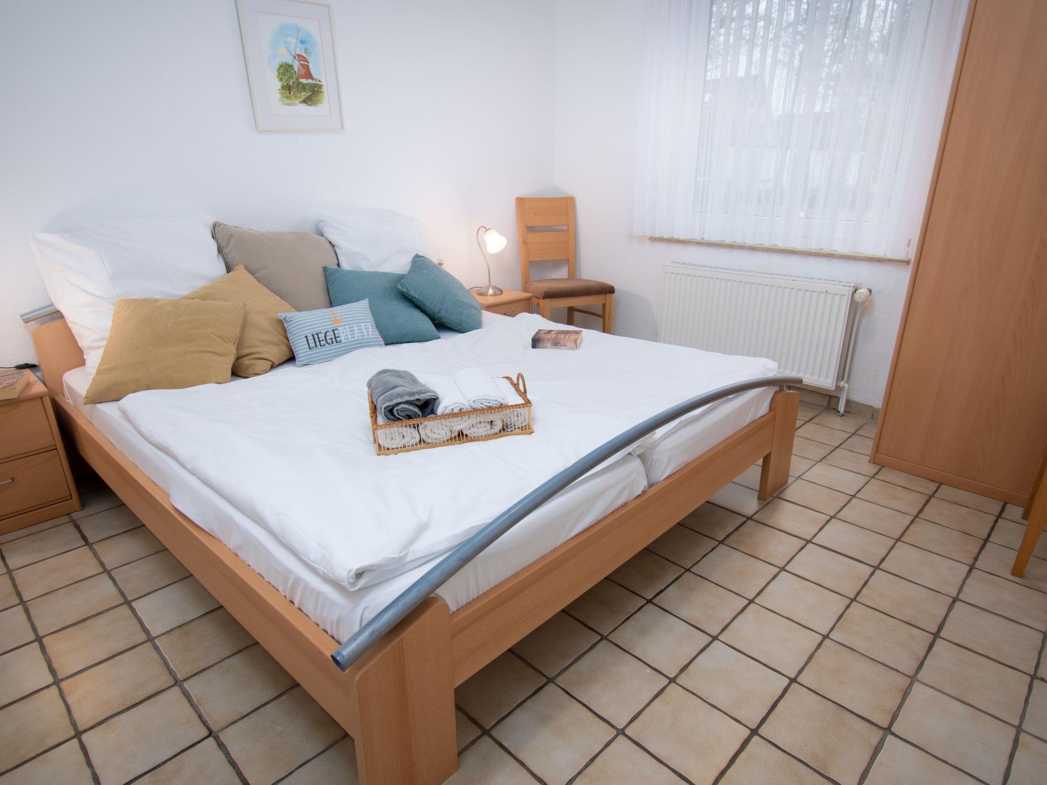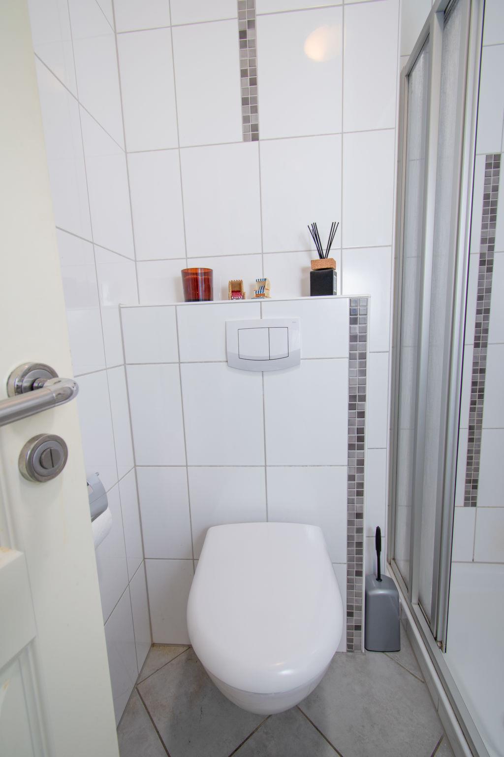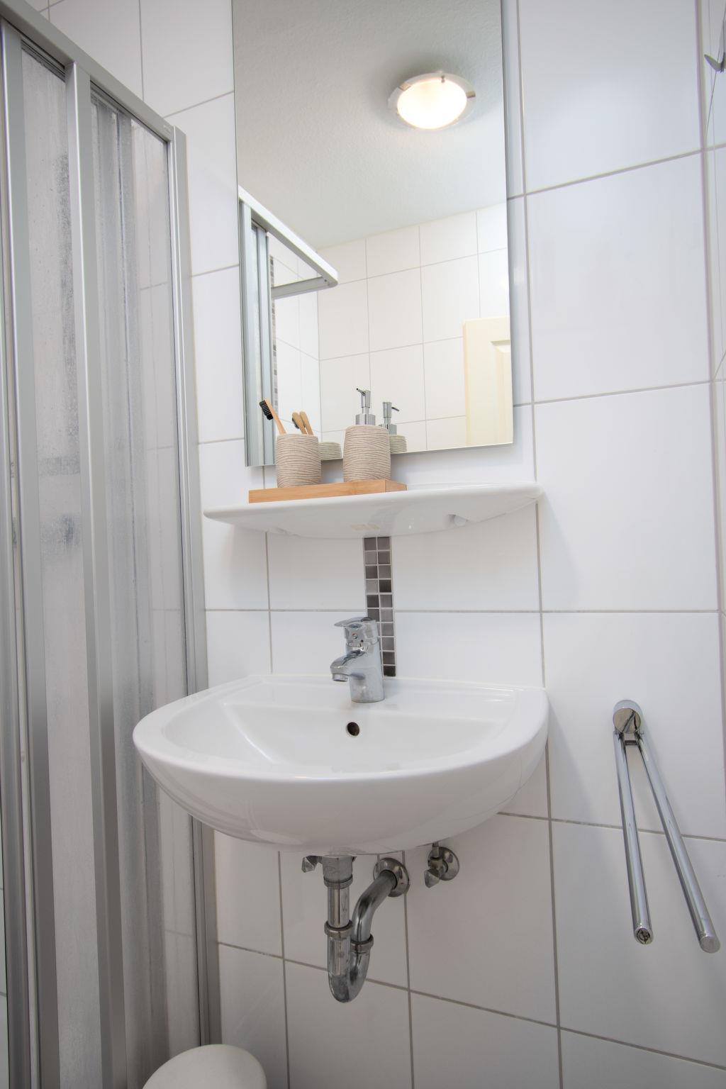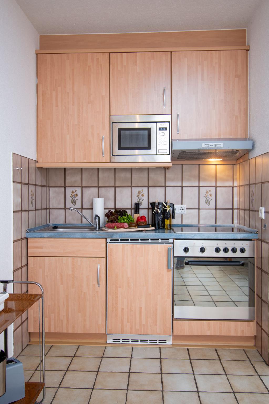 "Koralle", 2-room apartment 45 m2, on the ground floor. Cosy furnishings: living/dining room 20 m2 with 1 double sofabed (1 x 150 cm, length 190 cm), digital TV, flat screen and radio. Exit to the terrace. 1 room 10 m2 with 1 double bed (2 x 90 cm, length 200 cm). Kitchenette (oven, 4 ceramic glass hob hotplates, toaster, kettle, microwave, electric coffee machine). Shower/WC. Small terrace, small garden. Terrace furniture. Facilities: children's high chair (extra). Internet (WiFi, free). Please note: non-smokers only. Maximum 1 pet/ dog allowed. Smoke alarm.