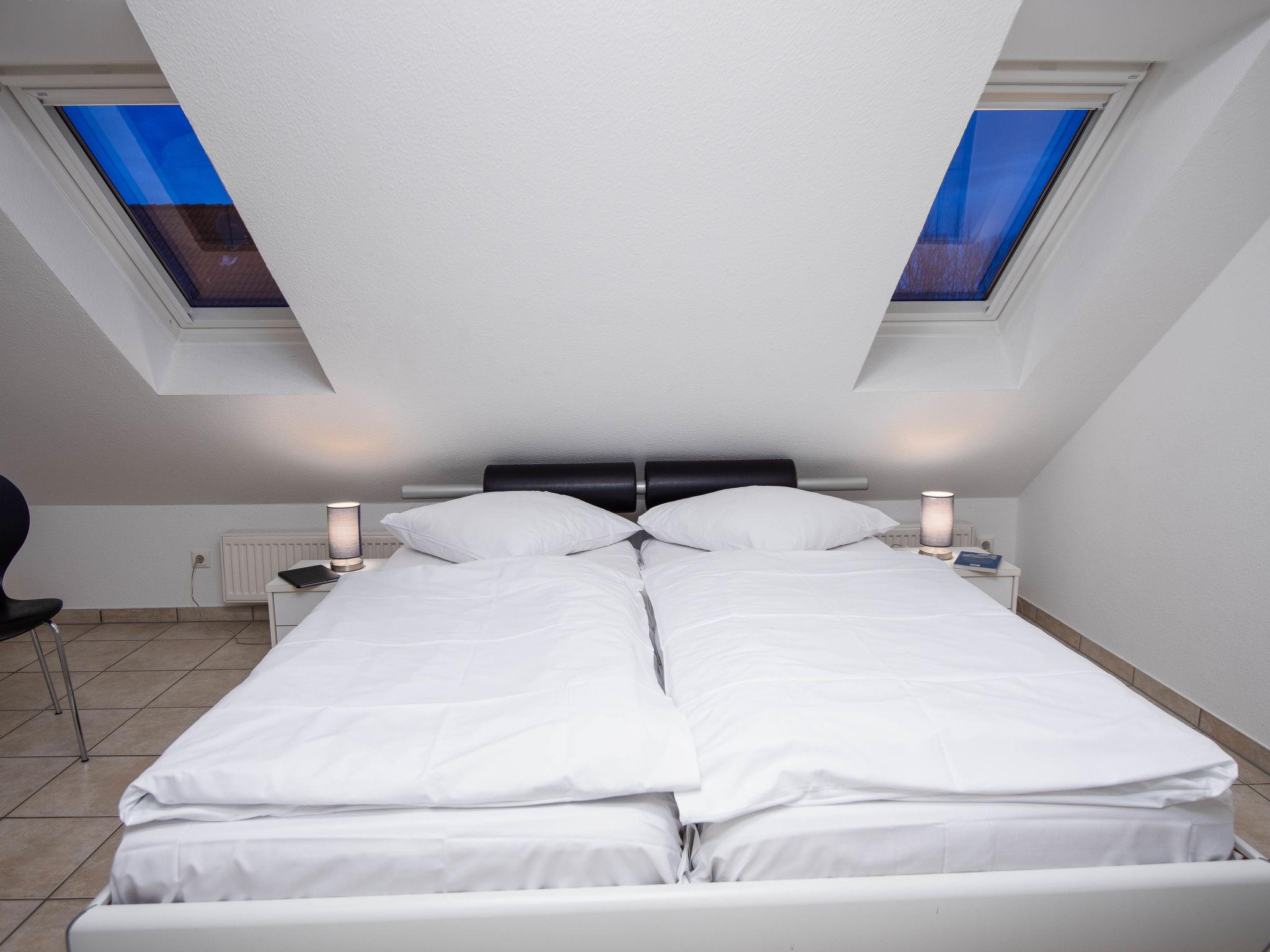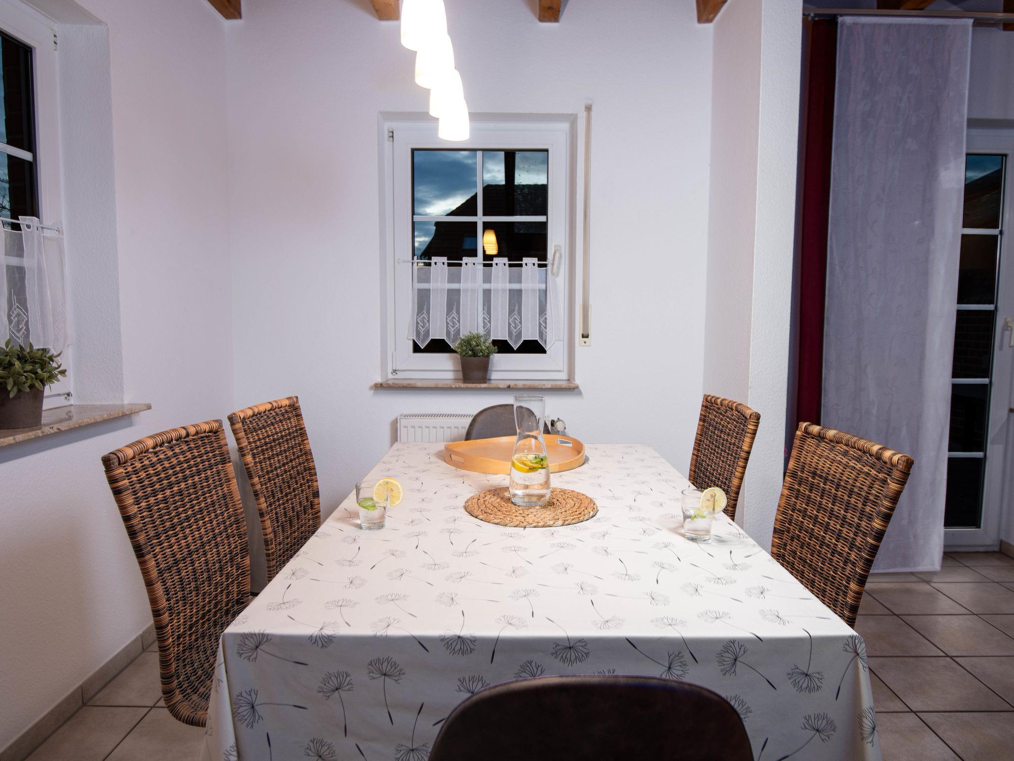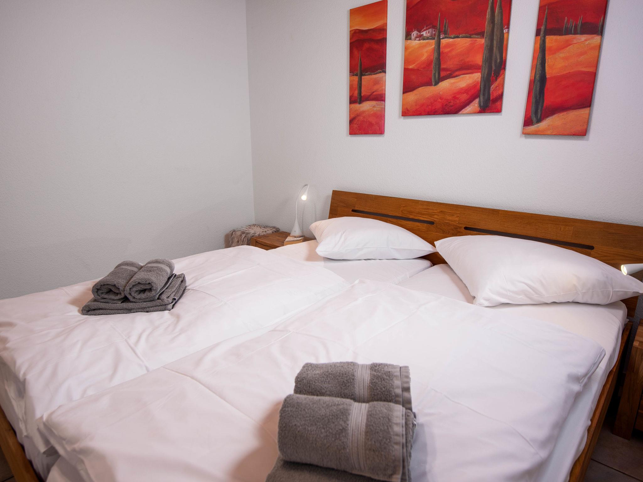 "Martina", 4-room semi-detached house 100 m2 on 2 levels, on the ground floor. Comfortable and tasteful furnishings: living/dining room 21 m2 with satellite TV (flat screen), hi-fi system. Exit to the terrace. 1 room 11 m2 with 1 double bed (2 x 90 cm, length 200 cm). Kitchenette (oven, dishwasher, 4 ceramic glass hob hotplates, toaster, kettle, microwave, electric coffee machine). Shower/WC. Upper floor: 1 room 9 m2, with sloping ceilings with 1 double bed (2 x 90 cm, length 200 cm), satellite TV (flat screen), DVD. 1 room 10 m2, with sloping ceilings with 2 beds (90 cm, length 200 cm). Shower/WC. Terrace 20 m2, roofed. Terrace furniture, barbecue. Facilities: children's high chair (extra). Internet (WiFi, free). Blu-ray player. Please note: non-smoking house. Smoke alarm. Bicycle stand available.