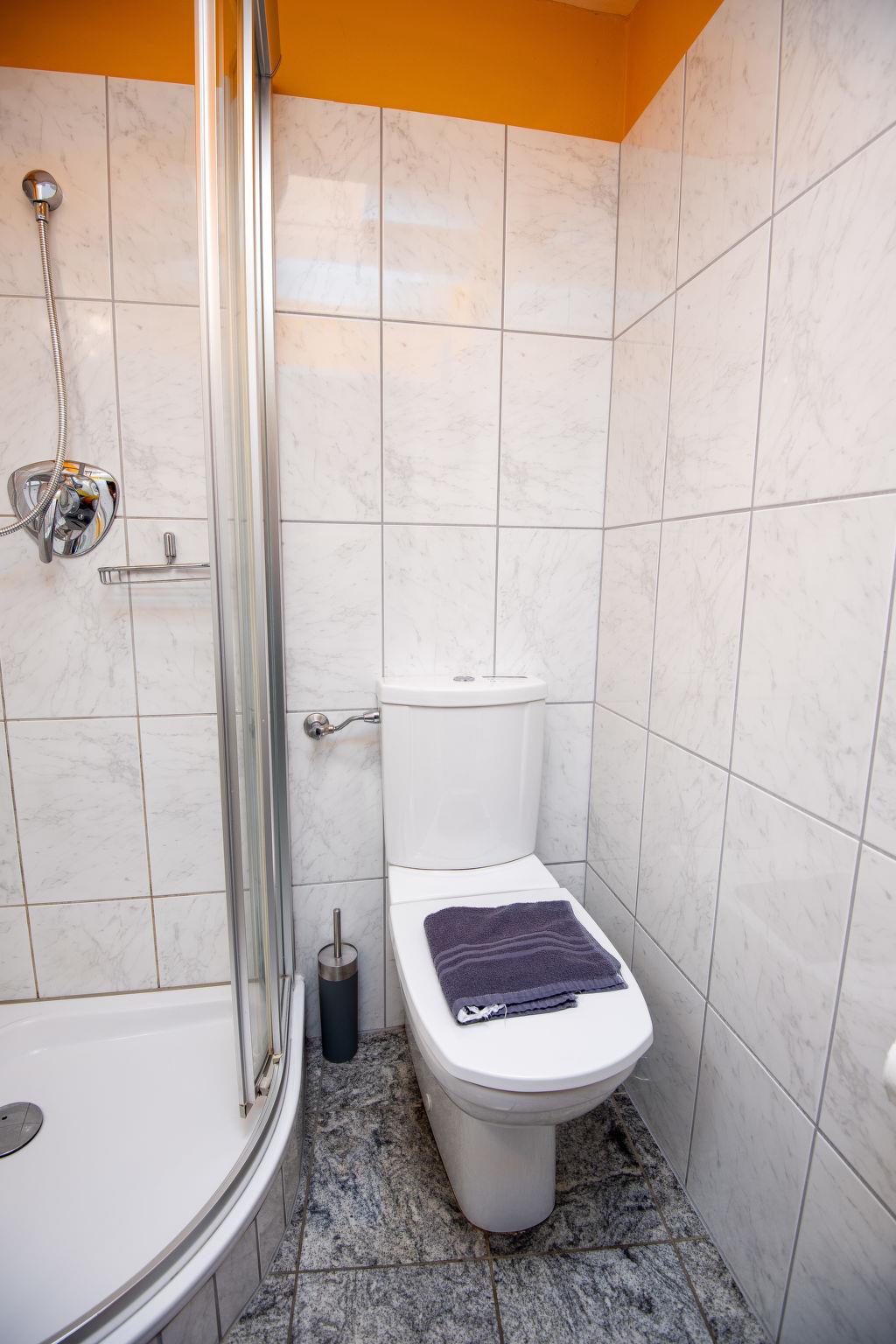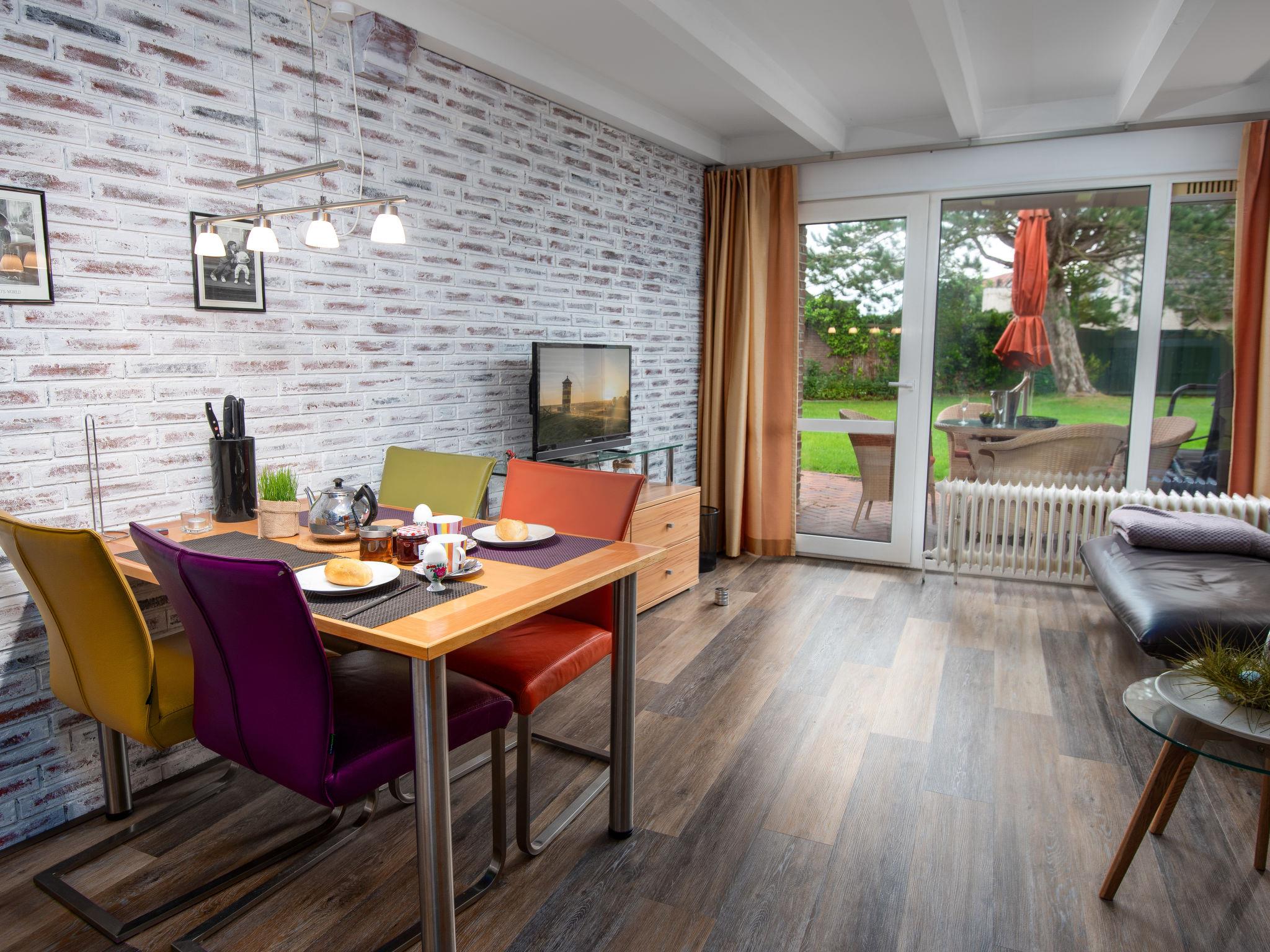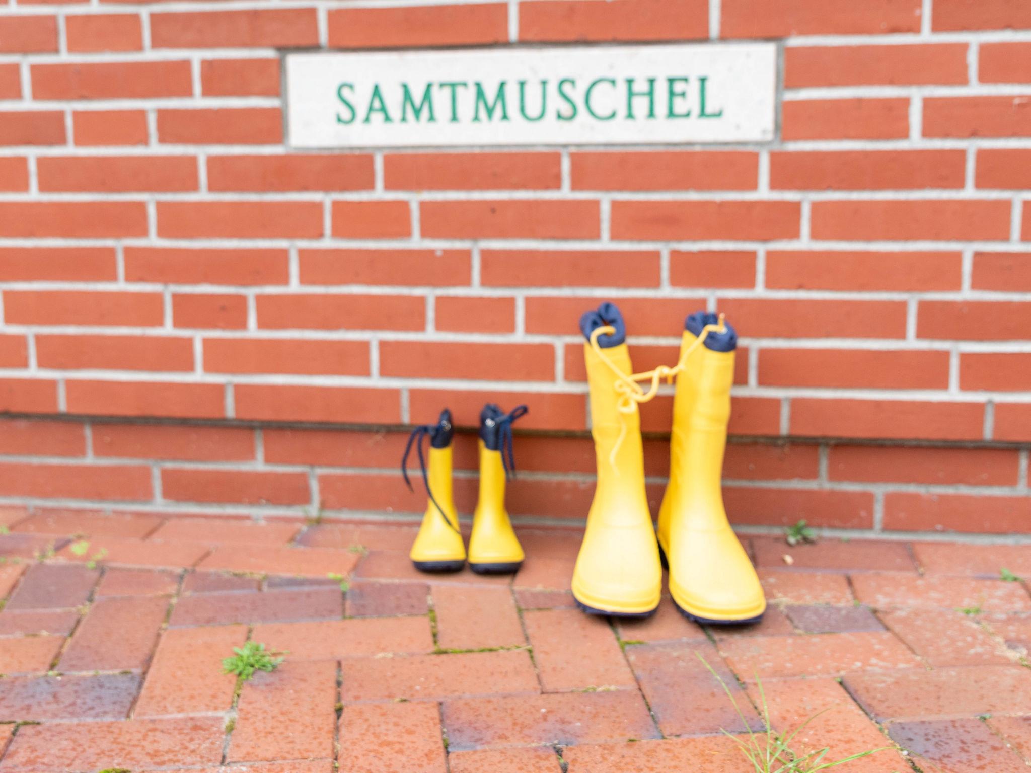 "Samtmuschel", 3-room terraced house 54 m2, on the ground floor. Beautiful furnishings: living/dining room 16 m2 with satellite TV (flat screen), hi-fi system. Exit to the terrace. 1 room 8 m2 with 1 double bed (2 x 90 cm, length 200 cm). 1 room 7 m2 with 2 beds (90 cm, length 190 cm). Kitchenette (4 ceramic glass hob hotplates, toaster, kettle, electric coffee machine) with dining table. Shower/WC. Terrace 11 m2. Terrace furniture, barbecue (portable). Facilities: children's high chair (extra). Internet (WiFi, free). Please note: fridge without freezer, non-smoking house. Smoke alarm.