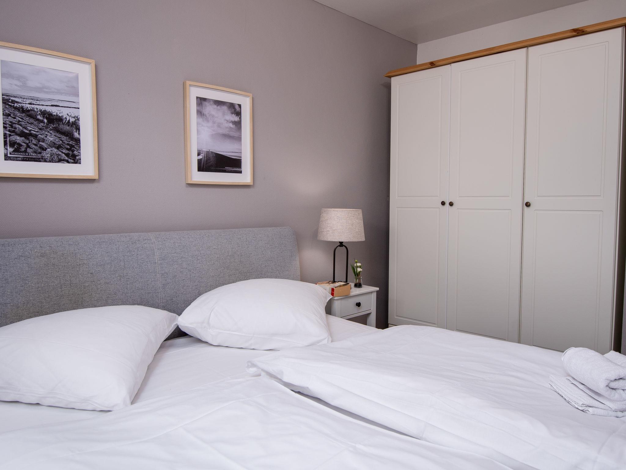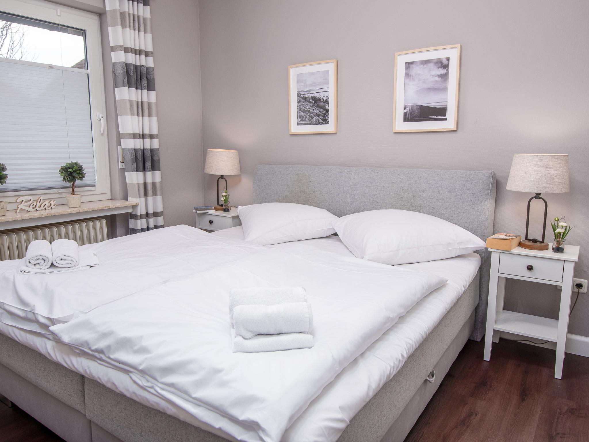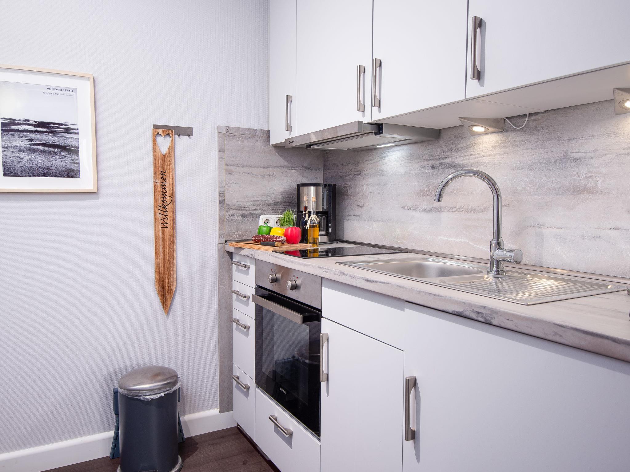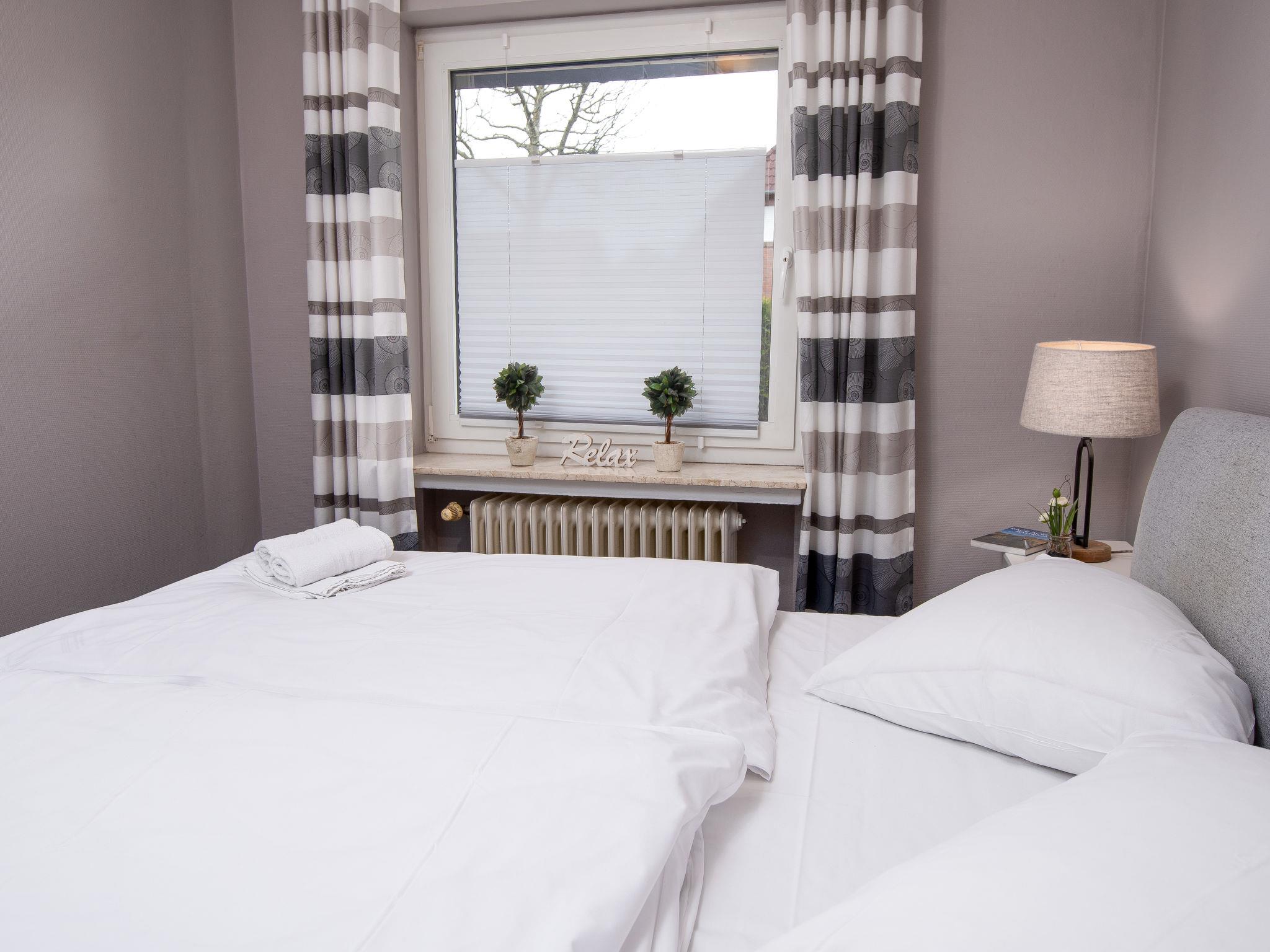 "Langeoog", 2-room apartment 40 m2, on the ground floor. Partly renovated in 2021, modern and tasteful furnishings: living/dining room 18 m2 with satellite TV (flat screen). 1 room 9 m2 with 1 double bed (2 x 90 cm, length 200 cm). Open kitchen (oven, 2 ceramic glass hob hotplates, toaster, kettle, electric coffee machine) with dining table. Shower/WC. Terrace 6 m2, lawn. Terrace furniture. Facilities: Internet (WiFi, free). Please note: not suitable for children under 6 years. Non-smokers only. Maximum occupancy: 2 people (baby or toddler as 3rd person is not possible). Terrace with beach chair.