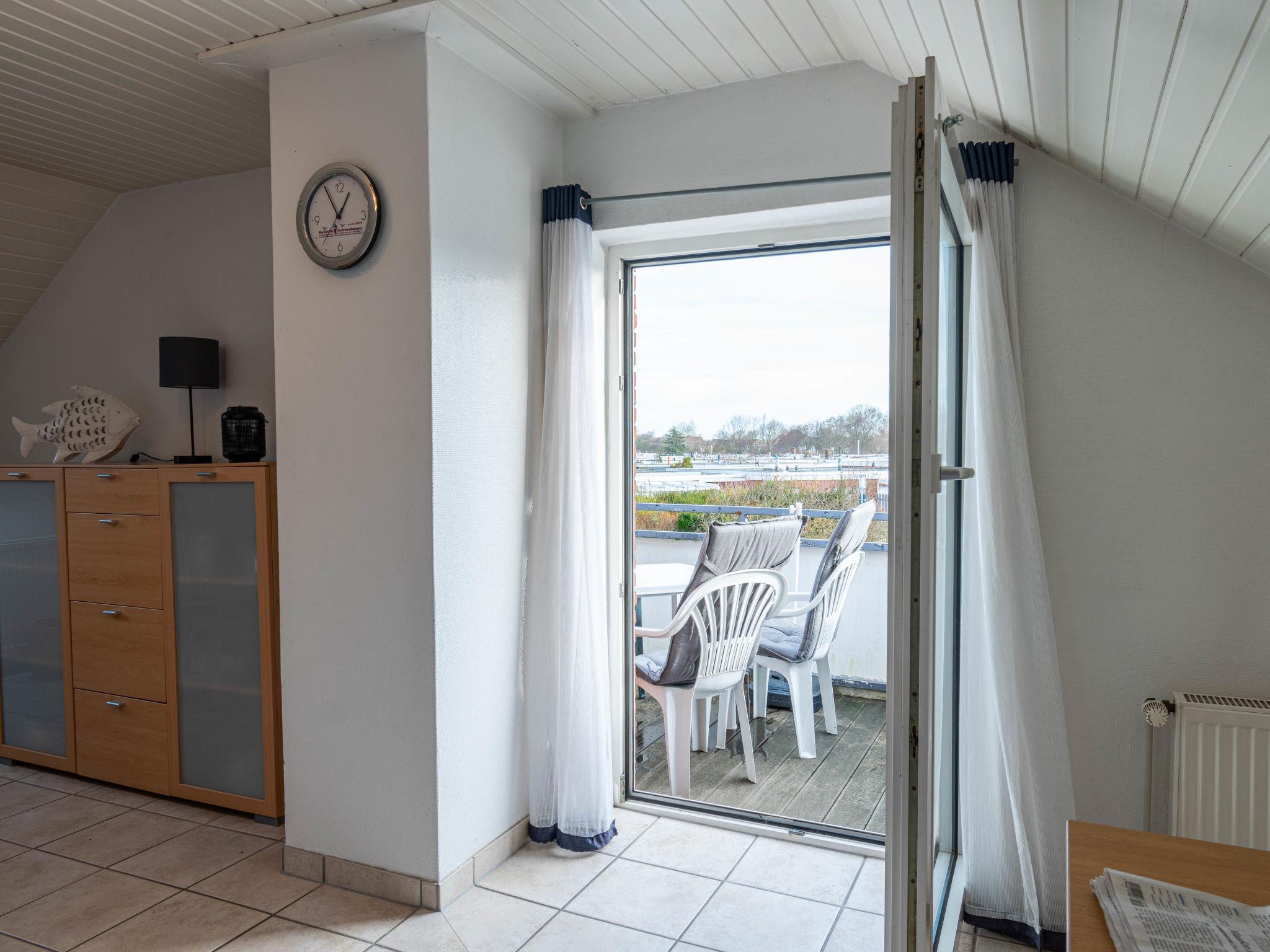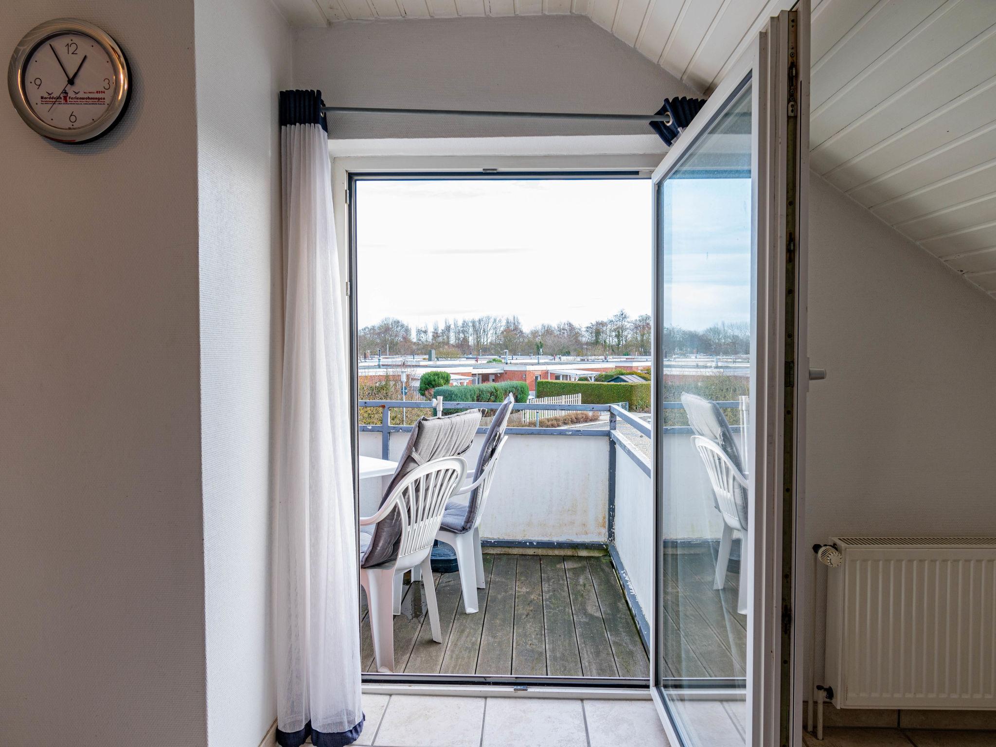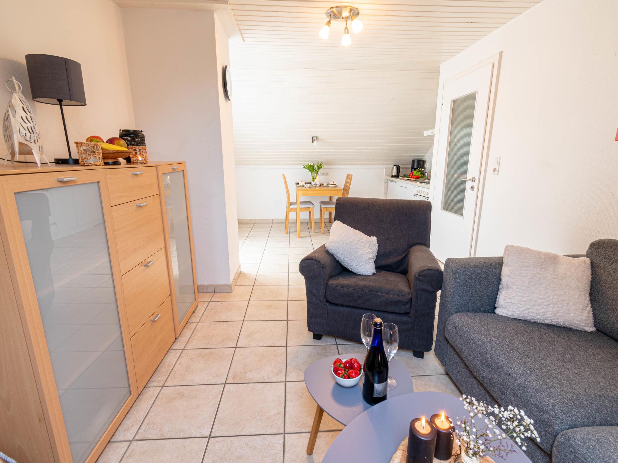 "Juist", 2-room apartment 32 m2, on the top floor. With sloping ceilings, stylish furnishings: living/dining room 12 m2 with satellite TV (flat screen). Exit to the balcony. 1 small room 4 m2 with 1 double bed (2 x 80 cm, length 200 cm). Kitchenette (oven, 4 ceramic glass hob hotplates, toaster, kettle, electric coffee machine) with dining table. Shower/WC. Small balcony 6 m2. Balcony furniture. Facilities: children's high chair (extra). Please note: non-smokers only. Maximum 1 pet/ dog allowed. Smoke alarm. The very small double room is not suitable for elderly or mobility-impaired people (no access from the sides of the bed).