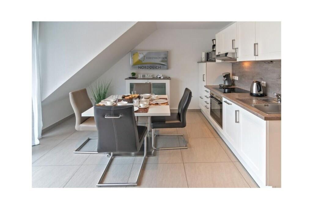 Holiday apartment Deichoase The holiday apartment Deichoase is rightly named: Here you will find your personal oasis directly behind the dike. The renovated and lovingly redesigned apartment has a special charm that no one can resist. It was designed with great attention to detail in a mixture of white and beige tones. Small accessories add maritime accents. The entire equipment is very high quality and modern. The spacious fitted kitchen has space for everything you need to prepare your meals. Of course, a dishwasher is also part of the comfort. The living room with the elegant leather couch is also very stylish. Here you can use a modern LED TV including satellite system and DVD player for your entertainment. Two bedrooms can accommodate a total of four people. One of them is equipped with a large double bed. The other has two single beds. Both rooms are under the sloping roof and therefore appear particularly cozy. The bathroom is also exclusively designed. Equipped with a spacious, modern glass shower, a wall-mounted toilet, underfloor heating, a practical towel dryer, a washbasin combination with plenty of storage space, a large mirror and a hairdryer, you will particularly enjoy staying here. Enjoy your evenings on the beautiful balcony, which offers a wonderful evening view of the sunset on the sea side. For a carefree start to your vacation, book our linen package. This consists of bed linen, towels, shower mats, tea towels and a service set (toilet paper, dishwasher tablets, garbage bags, dish brush, cleaning cloths and other little helpers for a carefree start to your vacation.