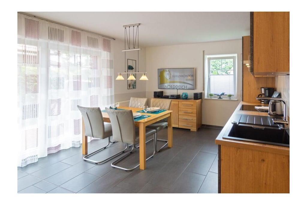 Holiday apartment Meeresoase Come in and feel like you've arrived straight away - this is what you will experience when you see the holiday apartment Meeresoase for the first time. Everything here is designed for your comfort. This apartment is particularly impressive due to its tasteful furnishing style. The living room is an absolute highlight. The spacious leather couch and the stylish color scheme are particularly inviting. Appropriate infotainment is provided: The living room is equipped with a new 50-inch LED TV including satellite TV with HD+, a DVD player and a CD player with radio. The chic fitted kitchen is also fully equipped. Nothing is missing here, even a dishwasher and a microwave are available. You will also find comfort in the chic bathroom. Here, too, care has been taken to ensure that you can feel at home. The bedroom, which, like the rest of the apartment, is on the ground floor, has a large, comfortable double bed. Watching TV in the evening is also possible here. The bedroom has been equipped with a new 32-inch TV for this purpose. Enjoy your holiday evenings on your own terrace, where there are plenty of places to sit. Your pet doesn't have to stay home alone, because it is very welcome in this apartment. The fee for the dog is EURO10.00 per night. For a carefree start to your holiday, book our linen package. This consists of bed linen, towels, shower mats, tea towels and a service set (toilet paper, dishwasher tablets, garbage bags, dish brush, cleaning cloths and other little helpers for a carefree start to your holiday.