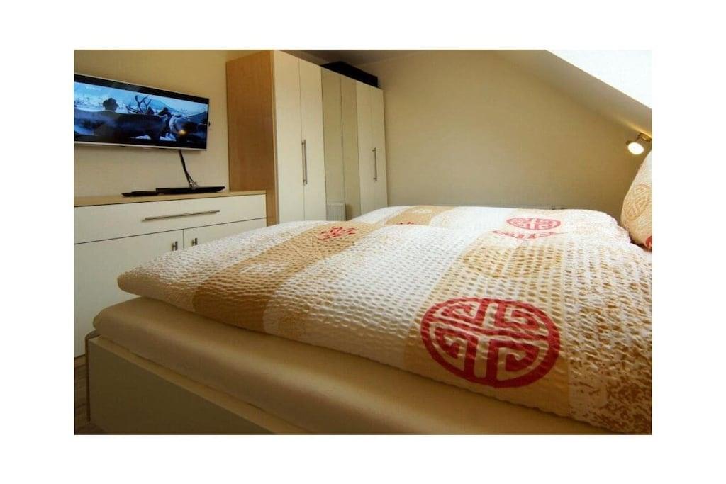Holiday apartment Kettenstek You can only feel completely comfortable on holiday in a well-kept and attractive ambience. This is what the holiday apartment Kettenstek offers you, an apartment in which you will not lack anything. The spacious kitchen already exudes comfort. So that you can cook to your heart's content during your stay, the fitted kitchen has been equipped with every conceivable appliance and utensil. In addition to the usual appliances, this also includes a microwave and an integrated dishwasher. In the living area you will find an inviting seating area, which looks very modern and at the same time cozy thanks to the cleverly selected decorations. Infotainment is well taken care of: a modern flat-screen TV including satellite system and DVD player are available here, as well as a music system for your entertainment. Game nights are also possible. Your holiday apartment has been equipped with a selection of board games for this purpose. Two bedrooms offer space for a total of four people. One bedroom is equipped with a double bed, the other with two single beds that can optionally be pushed together to form a double bed. There would also be space for a baby travel bed if required. Both bedrooms are also equipped with a flat-screen TV, a special luxury of this apartment. The bathroom is also a highlight - not only the chic design in white and granite is a special feature, but above all the comfortable underfloor heating. So nothing stands in the way of a stay in Norddeich even on cooler days. For a carefree start to your vacation, book our linen package. This consists of bed linen, towels, shower mats, tea towels and a service set (toilet paper, dishwasher tablets, garbage bags, dish brush, cleaning cloths and other small helpers) for a carefree start to your vacation.