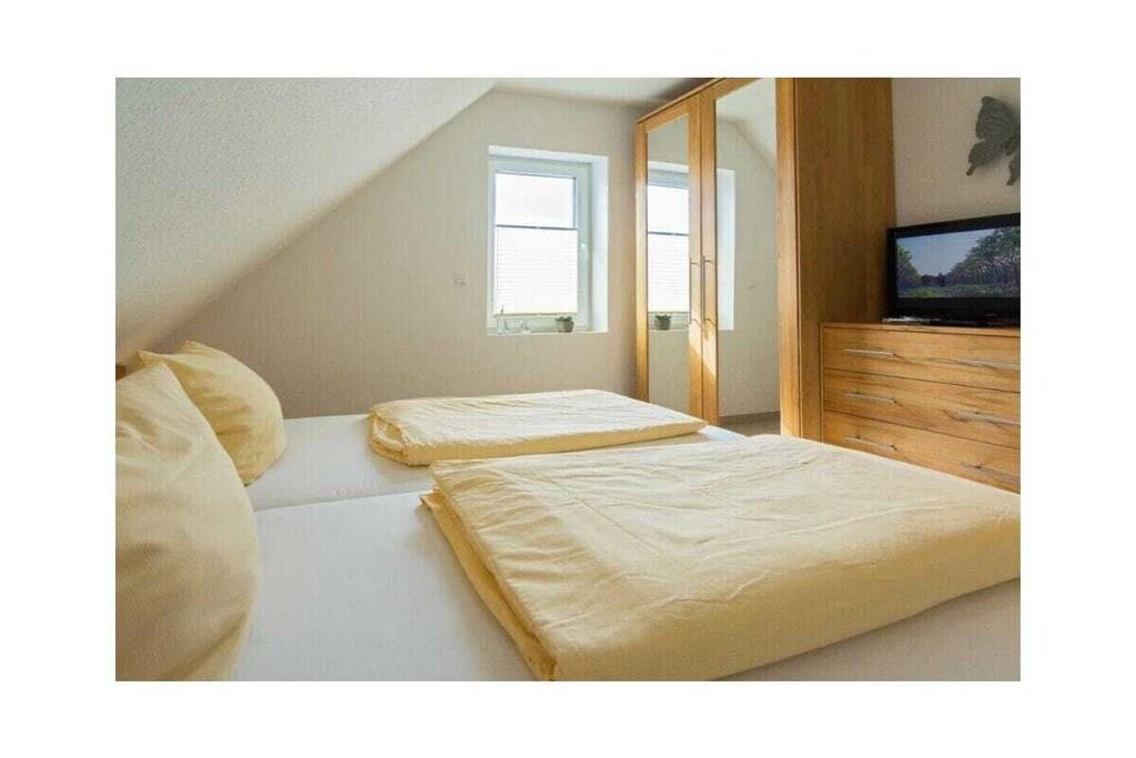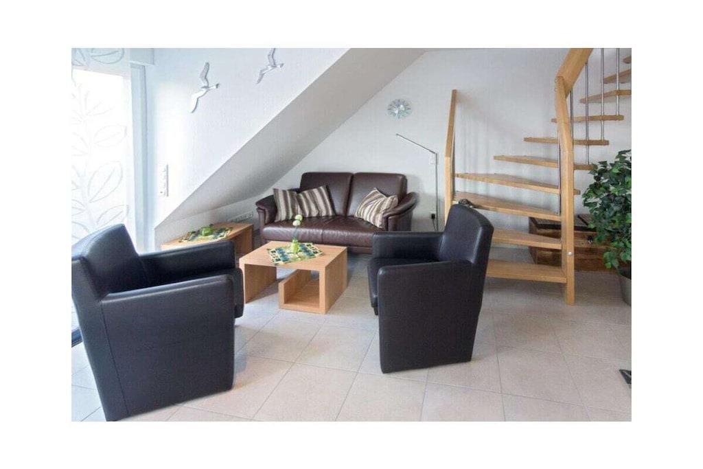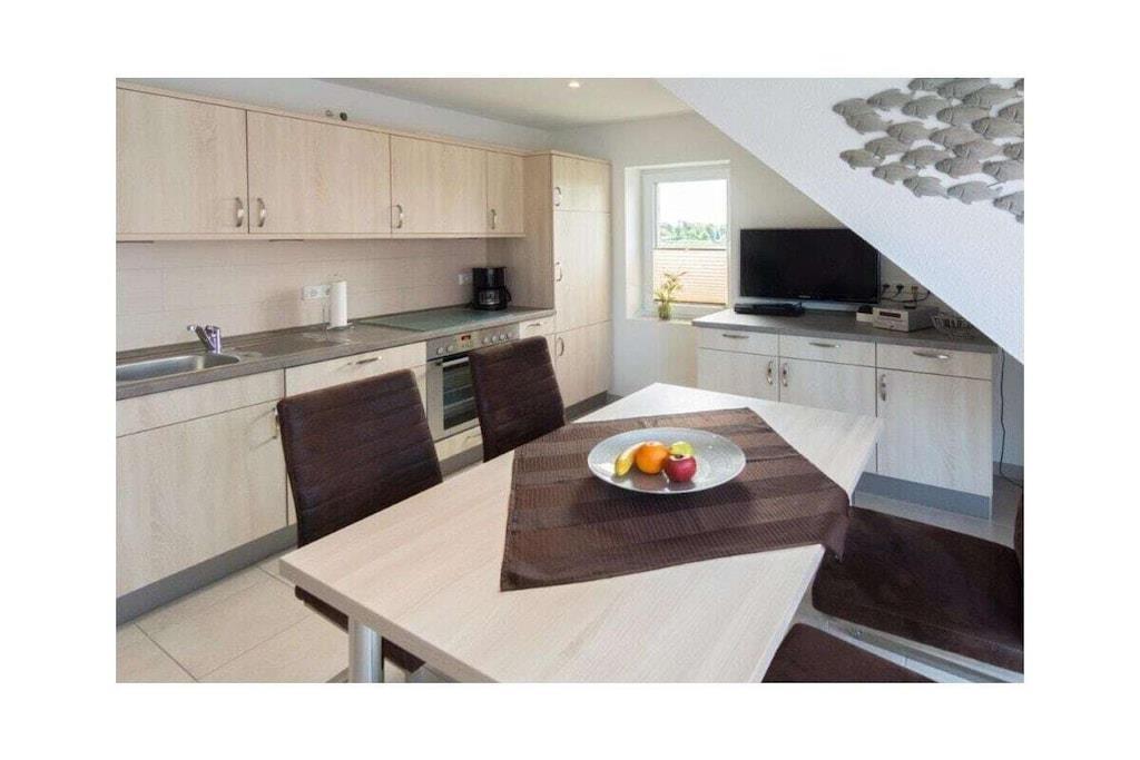 Holiday apartment Strandlilie The cozy holiday apartment Strandlilie is ideal for a family of four. You won't miss anything here. The holiday apartment consists of a modern living and dining area with a bright, friendly atmosphere, where everyone feels at home. In the two bedrooms, guests can enjoy a pleasant night's sleep in either a double bed or two comfortable single beds. The rooms can be darkened using electric blinds so that you can enjoy undisturbed sleep well into the early hours. Otherwise, guests will find everything they need for a pleasant holiday stay here: The kitchen is equipped with all appliances such as a dishwasher, refrigerator with freezer compartment, oven, ceramic hob, filter coffee machine, waffle iron, toaster, kettle, egg cooker, Senseo coffee pad machine and blender. The living room has a modern flat screen TV including satellite TV. The bathroom offers the best comfort thanks to the floor-level modern glass shower, underfloor heating, an integrated towel dryer and an additional cosmetic mirror. Perfect for families with a baby or toddler: The parents' bedroom is big enough to set up a baby bed. A high chair can also be provided on request. For a carefree start to your vacation, book our linen package. This consists of bed linen, towels, shower mats, tea towels and a service set (toilet paper, dishwasher tablets, garbage bags, dish brush, cleaning cloth and other small helpers) for a carefree start to your vacation.