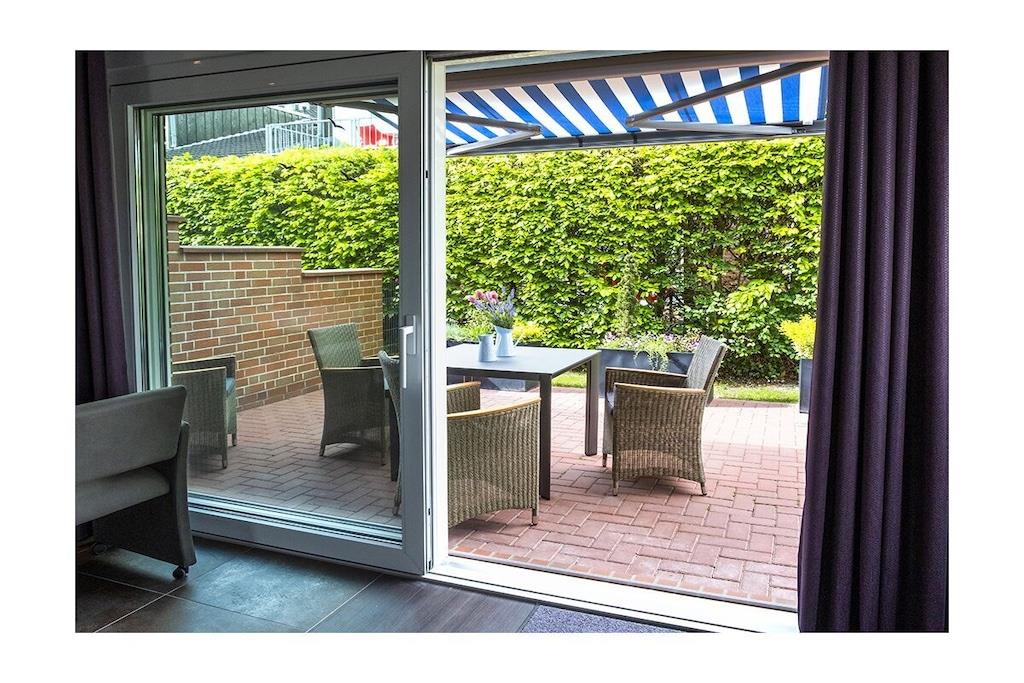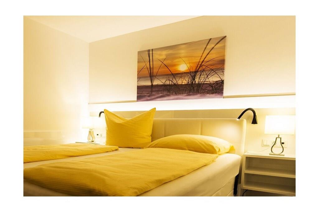 Luxury Apartment Norddeich Dream Pearl Experience a luxurious holiday in Norddeich. This holiday apartment offers you an extraordinary flair. Completely renovated in 2019, the apartment not only offers every comfort that guests could wish for for a pleasant stay, but also sets high standards with its luxurious furnishings. The holiday home is in a prime location in the heart of Norddeich. Only a few meters separate the holiday guest from the dike and the beach behind it. It is also only a few minutes' walk to the center with its various leisure activities and shopping opportunities. Nevertheless, guests can look forward to a quiet location in which absolute relaxation from everyday life is possible. The holiday apartment The heart of the apartment is the spacious living room. The very elegant sofa is a great place to relax. Perfect entertainment is guaranteed thanks to the large wall-mounted TV. The room has an exquisite flair not least thanks to the high-quality modern vinyl floor. The trendy LED lighting also provides pleasant, warm light. As in the rest of the apartment, this is built into the suspended ceiling construction. If required, the lighting can be dimmed individually. All windows in the room as well as the patio lift-sliding door are equipped with fly screens and electrically operated roller blinds, and there are also elegant pleated blinds on two French doors. The kitchen is also completely new, in addition to high-quality kitchen appliances, a back wall with 2 seats for the dining area has been integrated, and there are 2 very comfortable kitchen chairs on castors to match. In the bedroom there is a new 1.80m x 2.00m box spring bed with an additional back wall panel structure, in which an LED light strip is built behind the headboard and on the sides. In addition to the usual bedside lamps, the bed has two high-quality gooseneck reading lamps. There is also a sufficient