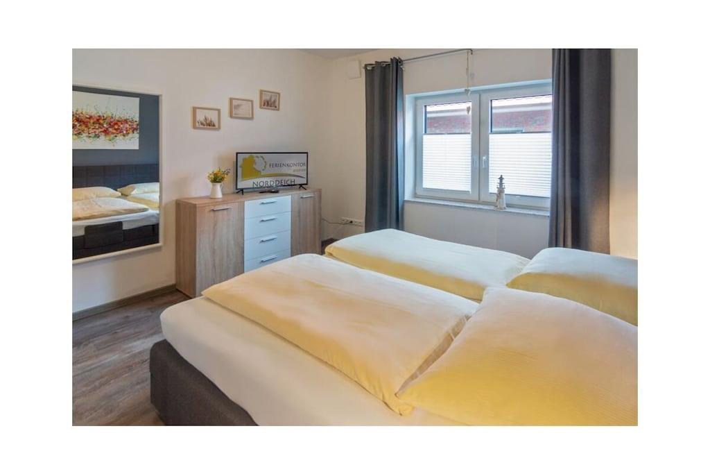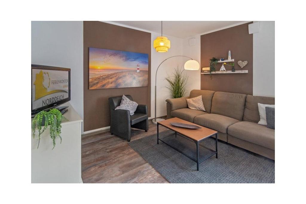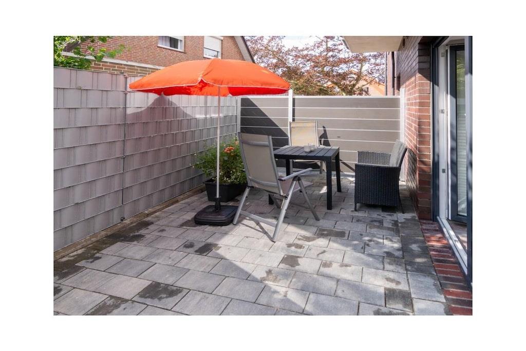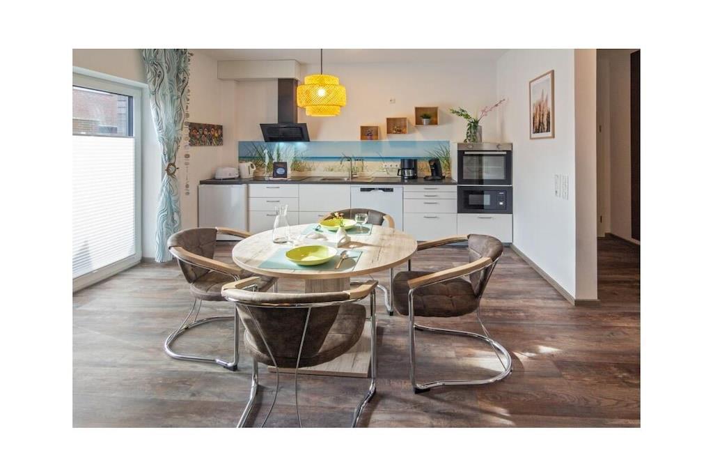 Holiday apartment Dream 1 Your holiday in Norddeich can be a real dream holiday in this small but lovely holiday apartment. It offers privacy and peace for two people, and is still centrally located. The apartment is on the ground floor of an apartment building that has other holiday apartments. This makes it a popular domicile for several families or groups of friends who like to spend their holiday together in the beautiful north, but don't want to do without their own four walls. As a group, use several apartments at the same time and decide for yourself how much holiday time you want to spend together. Even if you are only traveling as a couple, this apartment leaves nothing to be desired. From the front door, you are just a few steps from the lively center, where you can stroll, shop and enjoy the culinary offerings of the North Sea coast at any time. The nice thing about Norddeich: Just as quickly as you can get to the magical center of the town, you can also walk over the dike, where a kilometer-long sandy beach awaits you. This is worth experiencing at any time of year, whether for long walks, flying a kite, a romantic drink in a beach chair or unlimited bathing fun on beautiful summer days. This first holiday apartment in the apartment building is on the ground floor and is therefore very easy to reach. It is small but spacious. The hallway, living and dining area offer a large open space. Natural colors such as brown, beige and plain white in combination with natural wood ensure a calm ambience. Everyone immediately feels at home here. The kitchen is fully equipped with all the necessary electrical appliances and sufficient dishes and cutlery. You can enjoy your coffee (from the existing filter coffee machine) either at the rustic-modern dining table or, when the weather is nice, directly on the terrace. In the living room you will also find everything you need for a comfortable stay.