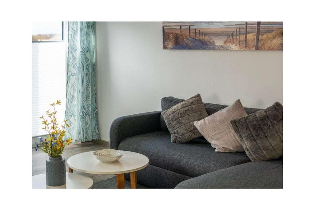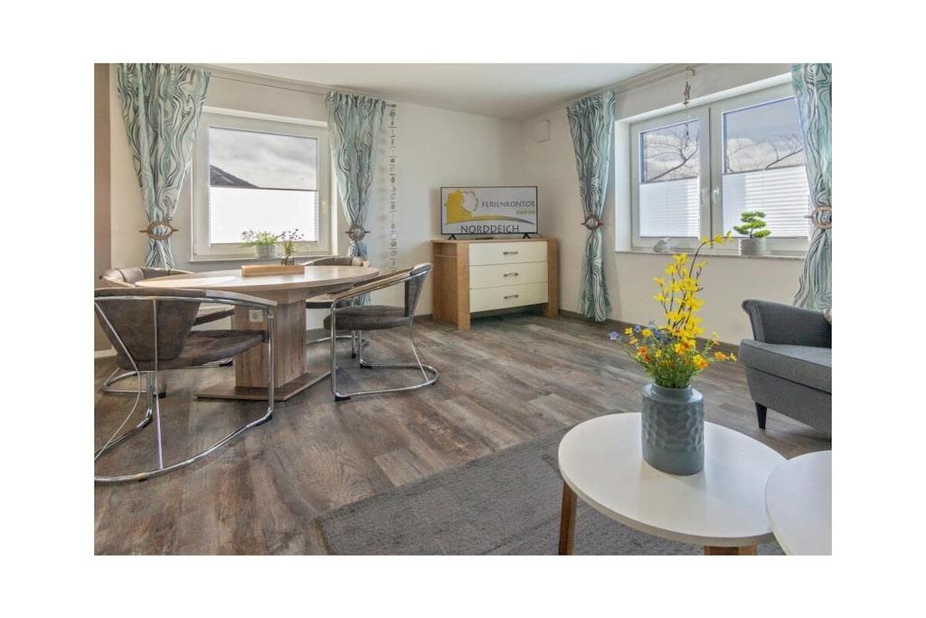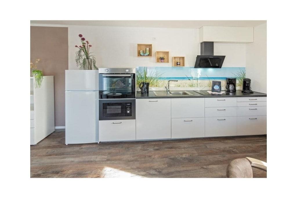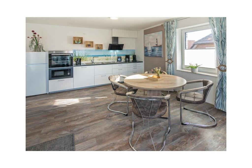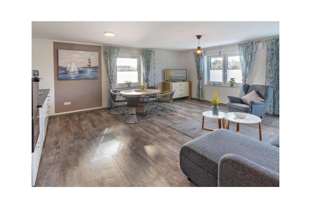 Dream Apartment 3 Many people like to spend the best time of the year alone or as a couple, to enjoy peace and quiet and to get some distance. Others are happy when they can spend the holidays with other families and friends. But in a large property this is not always possible. Here, in the beautiful north, you will find the perfect holiday home - regardless of whether you are planning a trip as a couple or are traveling with several families. The apartment building is located in the heart of Norddeich. The district of Norden is particularly popular because North Sea lovers will find everything they need for their maritime vacation happiness here. The dike is right on the doorstep. All you have to do is walk over and you can breathe in the soothing North Sea air. The kilometer-long sandy beach invites you to take walks, swim and enjoy numerous leisure activities. Norddeich itself is small and cozy, but still lively and varied, with small shops, regional restaurants and a wide range of tourism options for young and old. The apartment building in which your apartment is located has several smaller apartments. You can retreat here in the midst of other travelers, or rent several apartments together with other families for a successful holiday together. In any case, you will still find your privacy and the necessary seclusion in your own four walls. The Traum 3 holiday apartment is on the upper floor of the house. It has a very bright and spacious living-dining area, which is also connected to the open hallway. Bright colors and the modern vinyl floor in natural wood design create an inviting atmosphere. The living area with its cozy dining corner, the small sofa area and the TV form the center of your accommodation. Thanks to the maritime glass splashback, the kitchen will not let you forget that you are on the beautiful North Sea coast.