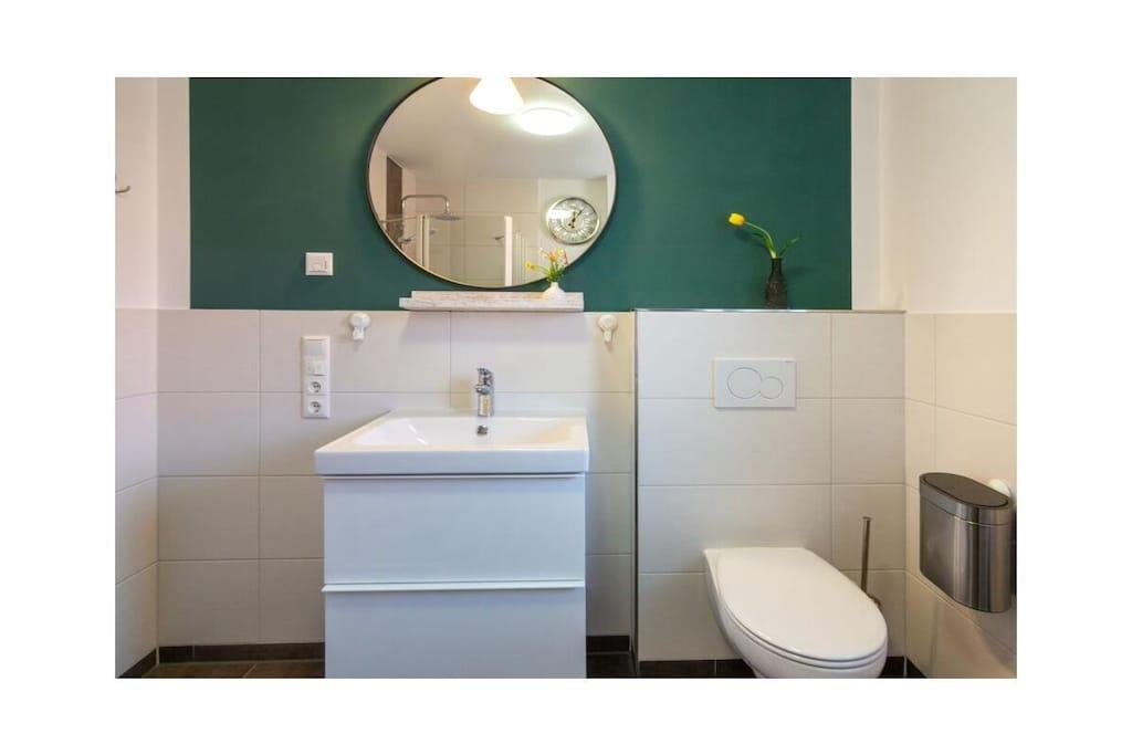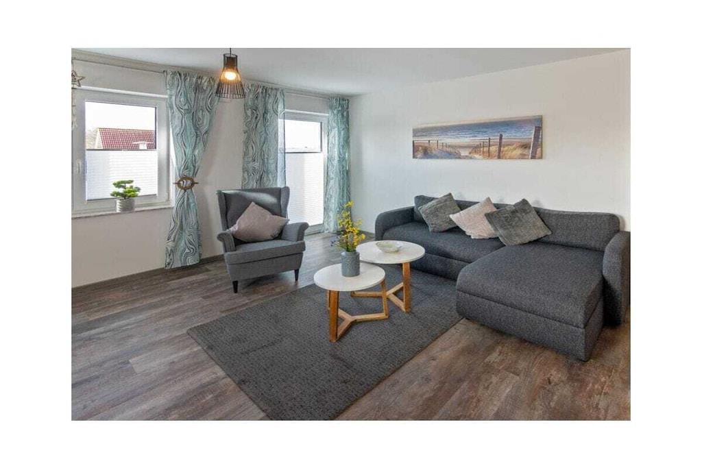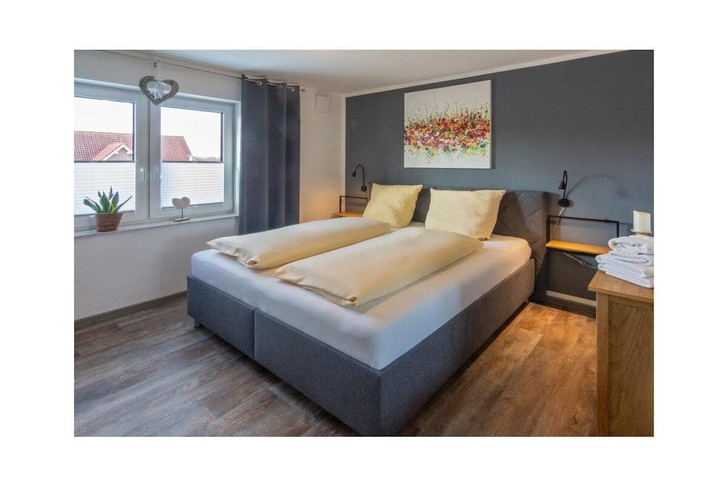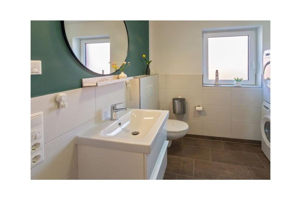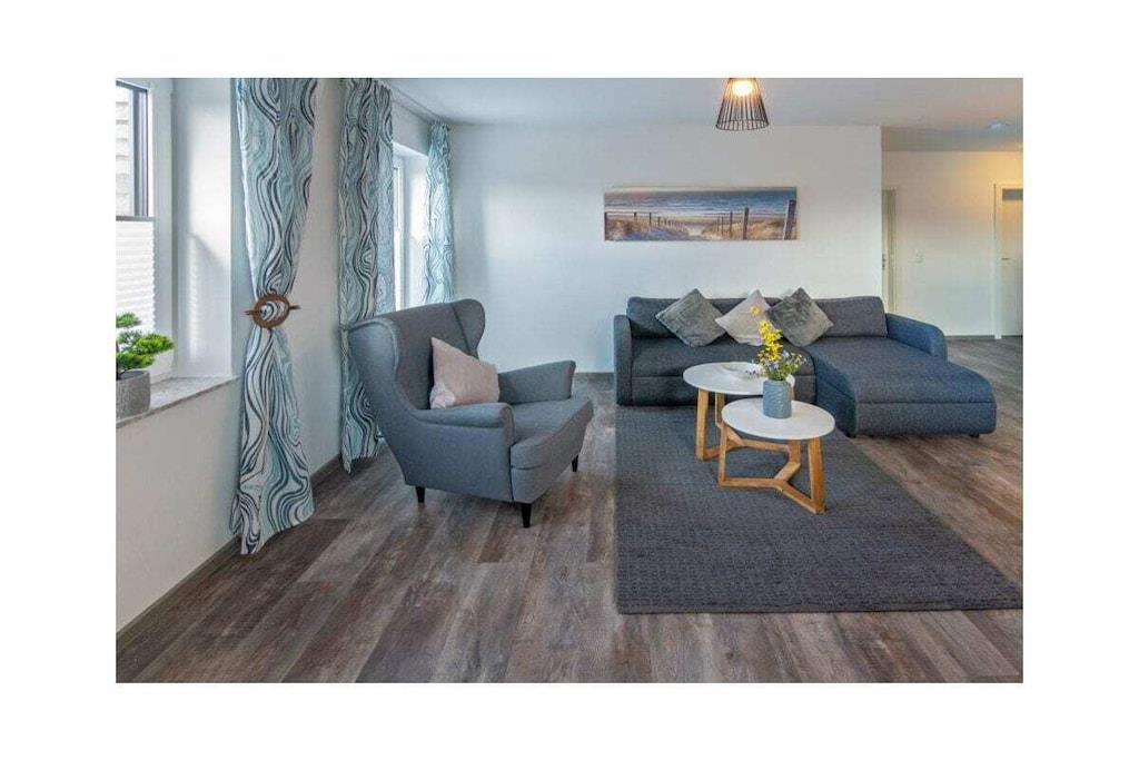 Dream Apartment 3 Many people like to spend the best time of the year alone or as a couple, to enjoy peace and quiet and to get some distance. Others are happy when they can spend the holidays with other families and friends. But in a large property this is not always possible. Here, in the beautiful north, you will find the perfect holiday home - regardless of whether you are planning a trip as a couple or are traveling with several families. The apartment building is located in the heart of Norddeich. The district of Norden is particularly popular because North Sea lovers will find everything they need for their maritime vacation happiness here. The dike is right on the doorstep. All you have to do is walk over and you can breathe in the soothing North Sea air. The kilometer-long sandy beach invites you to take walks, swim and enjoy numerous leisure activities. Norddeich itself is small and cozy, but still lively and varied, with small shops, regional restaurants and a wide range of tourism options for young and old. The apartment building in which your apartment is located has several smaller apartments. You can retreat here in the midst of other travelers, or rent several apartments together with other families for a successful holiday together. In any case, you will still find your privacy and the necessary seclusion in your own four walls. The Traum 3 holiday apartment is on the upper floor of the house. It has a very bright and spacious living-dining area, which is also connected to the open hallway. Bright colors and the modern vinyl floor in natural wood design create an inviting atmosphere. The living area with its cozy dining corner, the small sofa area and the TV form the center of your accommodation. Thanks to the maritime glass splashback, the kitchen will not let you forget that you are on the beautiful North Sea coast.