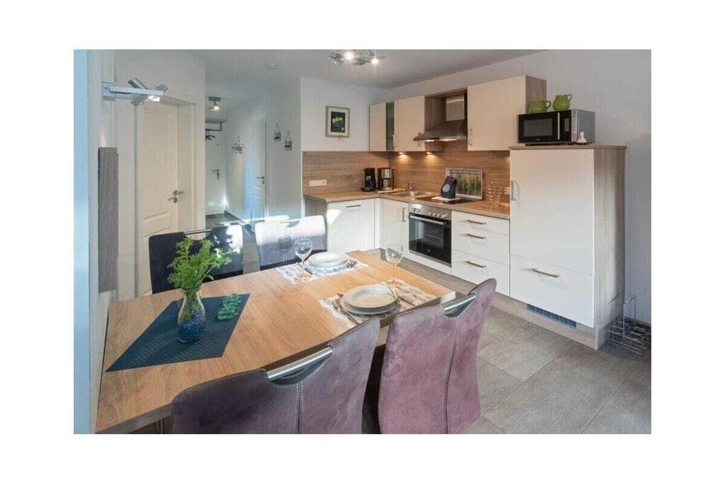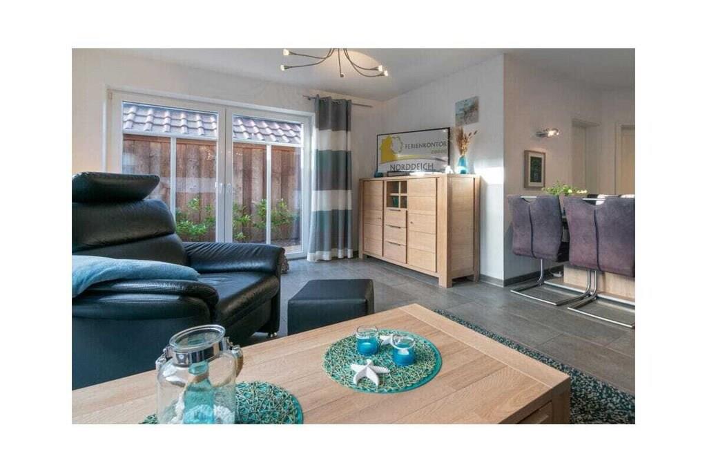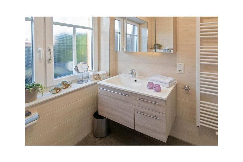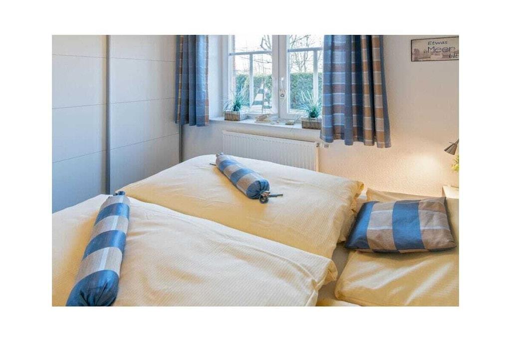Holiday apartment Kleine Auszeit Welcome to our cozy holiday apartment "Kleine Auszeit" on the edge of Norddeich. Housed in a semi-detached house, the "Kleine Auszeit" offers the ideal setting for your relaxing holiday in the north of Germany. Our ground floor apartment impresses with its inviting terrace, which is designed on the corner and is directly accessible from the spacious living area. The open floor plan seamlessly connects the kitchen, the dining area and the tastefully furnished living area and creates a sociable atmosphere. Our holiday apartment is designed for the stay of 2 adults and 2 children. And your pet is also a welcome guest. Food and water bowls are already ready when you move in. The center of the living area, the cozy sofa set with the armchair and an elegant table, invites you to relax in the evenings while you watch your favorite shows on the flat screen TV provided. A Blu-ray player is also available and you are welcome to bring your favorite films from home. As a special extra, the living area has a safe in the closet, which offers additional security for storing your valuables. The modern corner kitchen is well equipped and certainly leaves nothing to be desired. A 4-burner stove, an oven, a microwave, a refrigerator, a pad coffee machine and a toaster as well as sufficient dishes and glasses are at your disposal. The dining table with its four chairs invites you to share meals, game nights or other communal activities. If you have a small child in your family, you will also find a children's high chair in the "Little Time Out". The "parents' bedroom" is comfortable and attractively designed. In addition to a spacious double bed measuring 160 cm x 200 cm and the matching bedside tables with reading lamp, you will find a