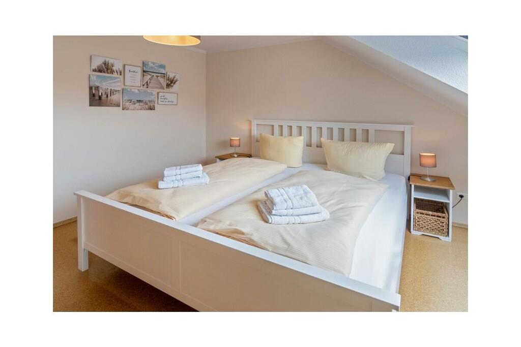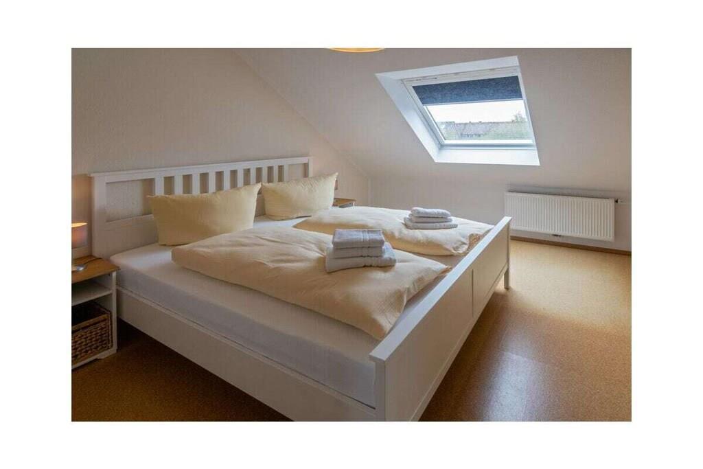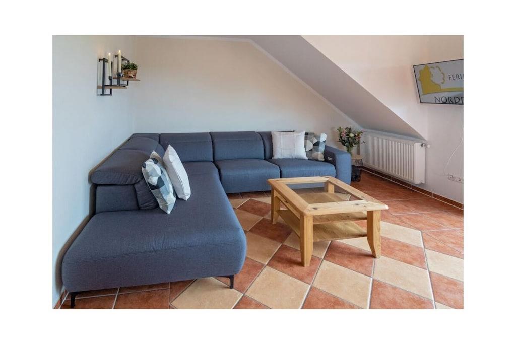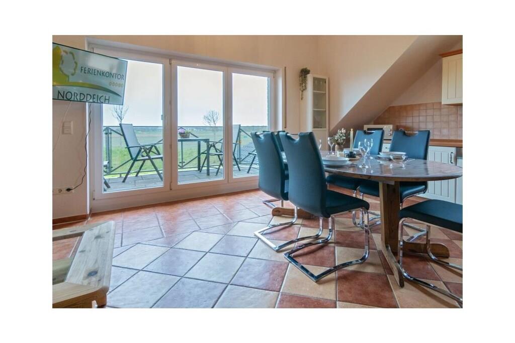 Holiday apartment Küstenbrise Norddeich, a district of the northern German town of Norden, is a popular travel destination at any time of year. The extensive Norddeich sandy beach is unique and invites you to walk, swim, relax or even do sports. Depending on the season, you will meet a wide variety of people on the beach, take mudflat tours under the expert guidance of Norddeich mudflat guides, experience the annual kite festival or be enchanted by the crackling of the Easter fire. There are many opportunities, and you will definitely enjoy your stay. This is certainly all the more true if you spend your time directly behind the dike in this particularly beautiful holiday apartment. Just a few meters behind the dunes, the holiday apartment Küstenbrise awaits you, which extends over two floors. You will find space here with the large family or with a nice group of friends. The apartment is best suited for four to six people. There are three bedrooms at your disposal. All bedrooms are furnished in a friendly and bright style - a successful combination of modern furnishing style and North German country house charm. You will find everything very well maintained and in excellent condition. The master bedroom on the upper floor of the holiday home has a double bed and a very spacious wardrobe. On the same floor is the second bedroom, which is furnished with two single beds. A narrow wooden staircase takes you to the attic, the second floor of your holiday home. Here you will find a cozy bedroom with two single beds. Although this bunk under the roof does not offer you much space, it is all the more cozy. There is enough space for everyone in the living and dining area. The open kitchen is bright and inviting - ideal for cooking together when you don't feel like going to a restaurant. The living area also has a tasteful mix of country and country furniture.