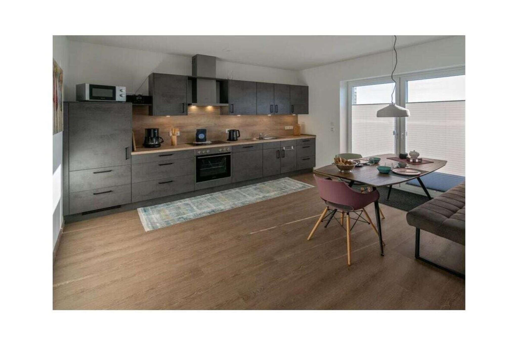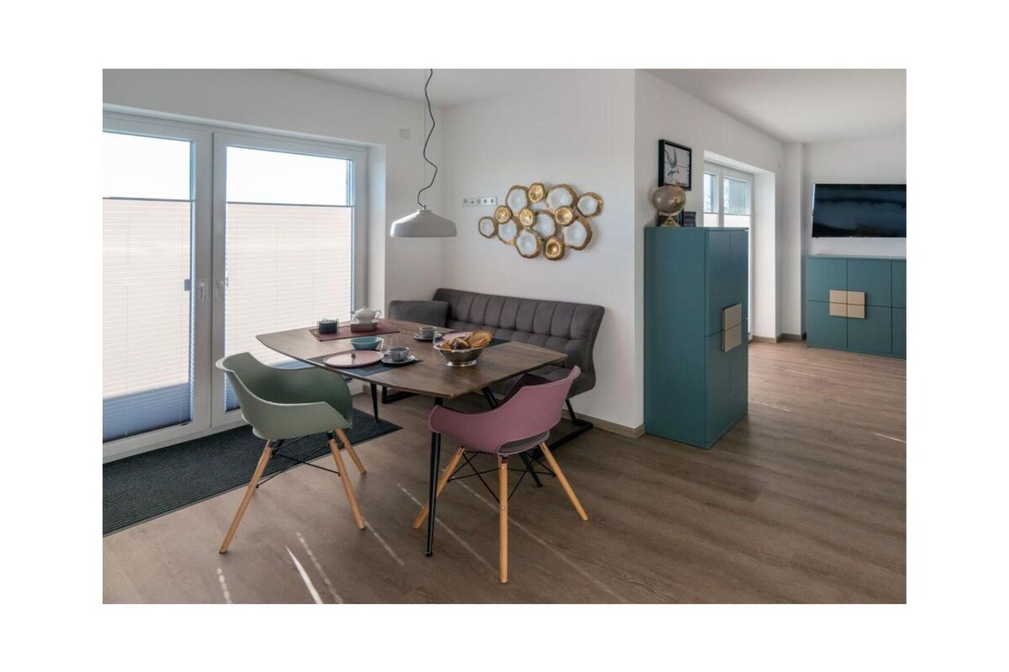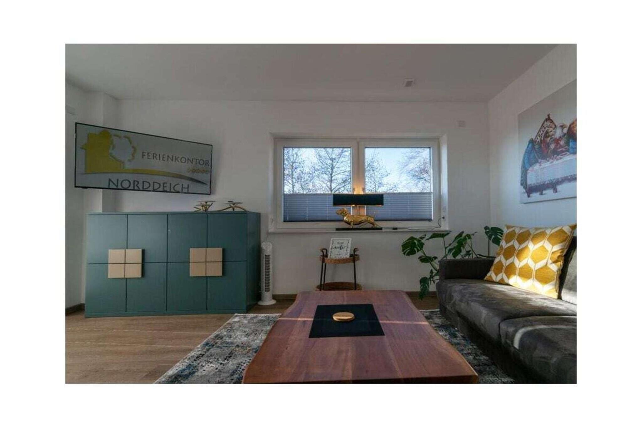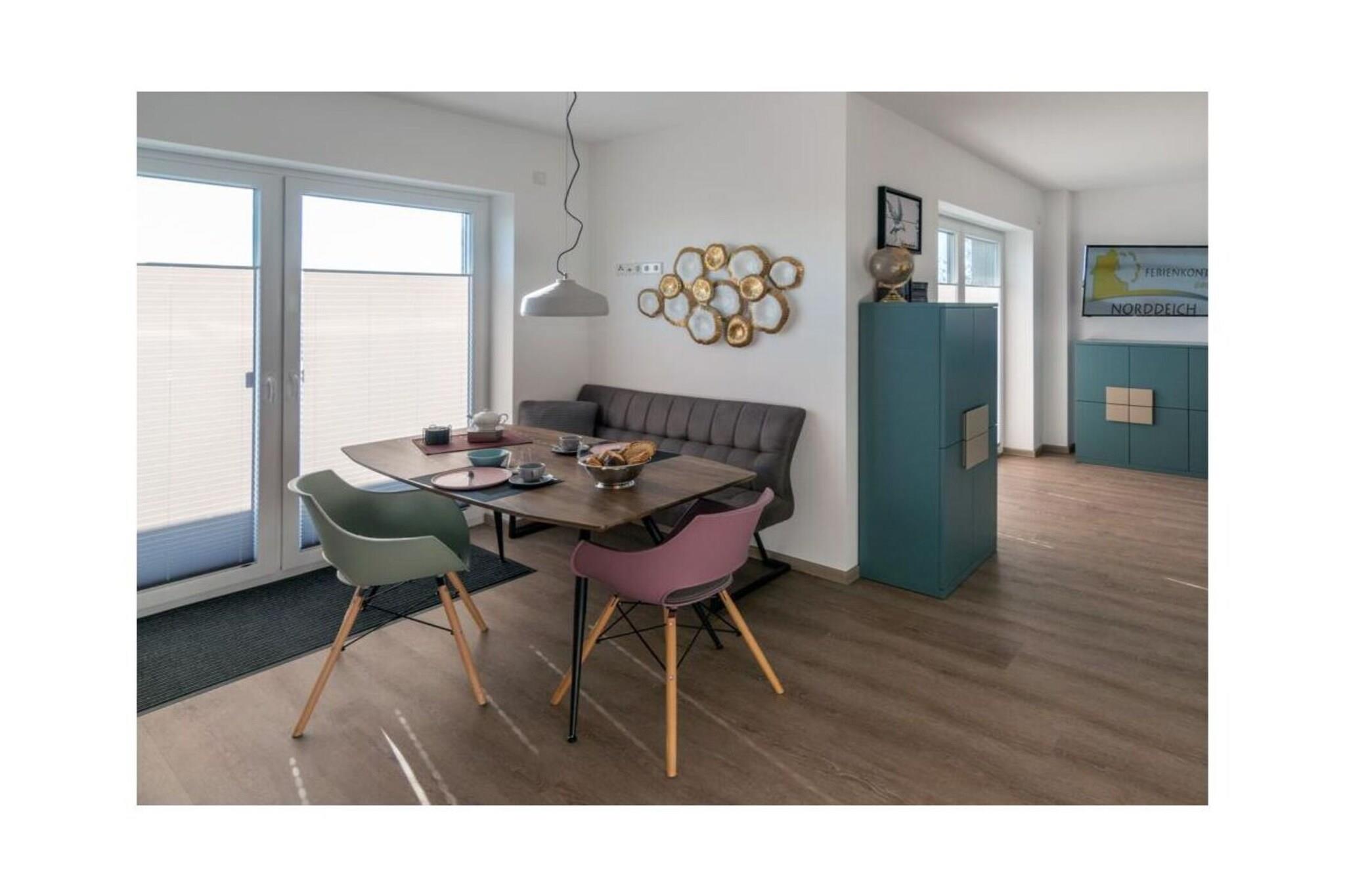 Holiday apartment Deck 8, Zum Bahnkolk 5, Norddeich Spend relaxing and eventful days in the small holiday paradise of Norddeich. Here, in the quiet district of the East Frisian town of Norden, you will find everything you could wish for for your dream holiday: a long sandy beach, wide dunes, quaint restaurants and inviting shops. This exclusive holiday apartment, which is barrier-free, guarantees you an all-round pleasant stay. The holiday apartment The Deck 8 holiday apartment is on the second floor of an apartment building and, despite its very central location, is pleasantly quiet. You can get to the wonderful sandy beach just as quickly as Norddeich's lively and inviting shopping mile. You will find a parking space right outside your front door. You don't have to climb any stairs to get to your holiday home, as there is a modern elevator that takes you directly to the 2nd floor. This property is also barrier-free inside. The kitchen, dining area and living room are connected in a spacious area. What is particularly striking here is the modern yet very comfortable furnishings. The apartment is bright and friendly, dark color accents on the selected designer furniture create an elegant flair. Thanks to the wide window front in the living and dining area, your apartment is flooded with light almost all day. Of course, the windows can be darkened using the shutters if desired. A stylish couch and the color-coordinated armchair in the living area invite you to linger. A modern TV guarantees cozy evenings in front of the TV. The modern kitchenette is functionally equipped with everything you need if you don't want to eat out. It has a stove with four hotplates on a ceramic hob, an oven, a refrigerator, a dishwasher, a microwave, a coffee machine, a toaster, an egg cooker and enough dishes.