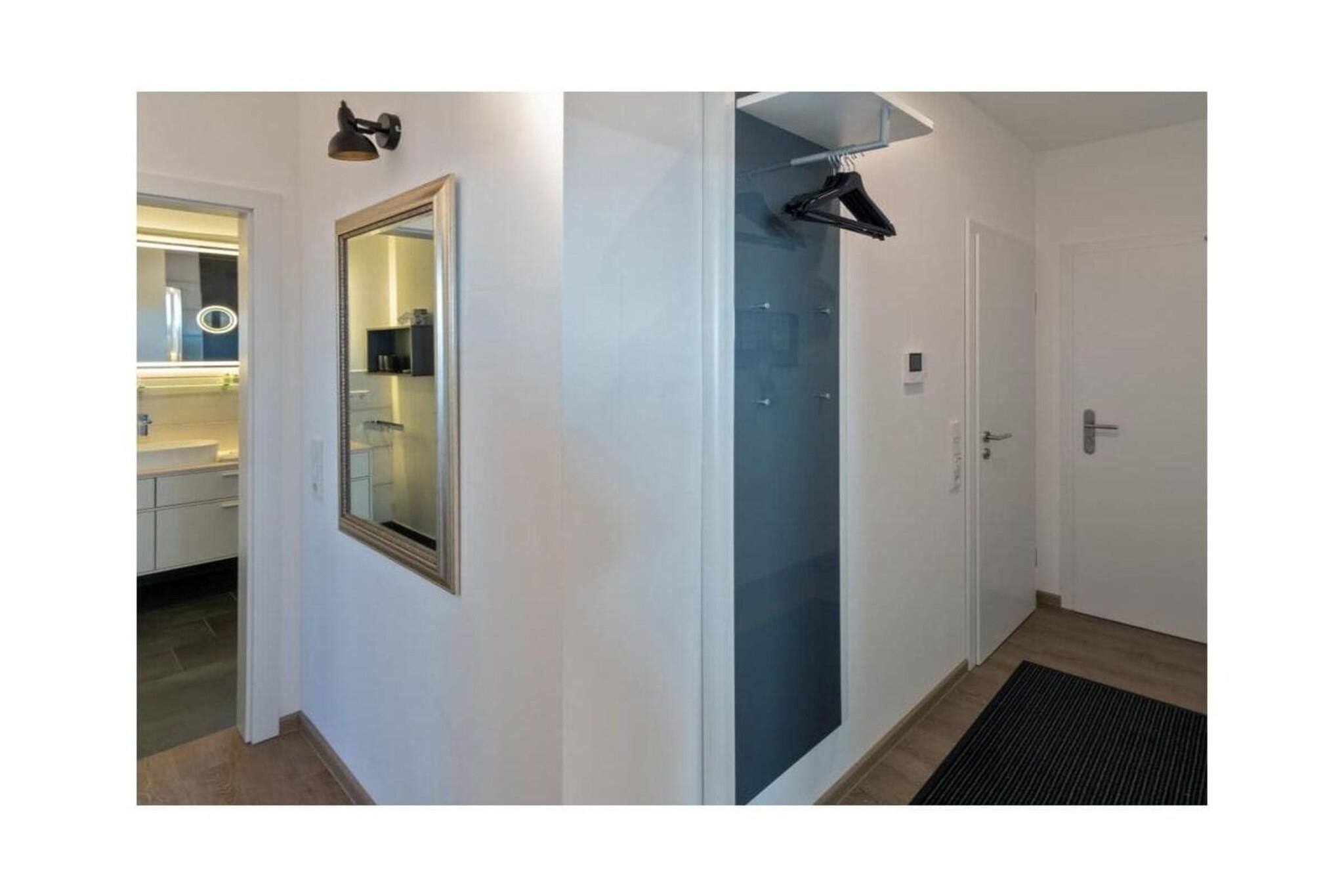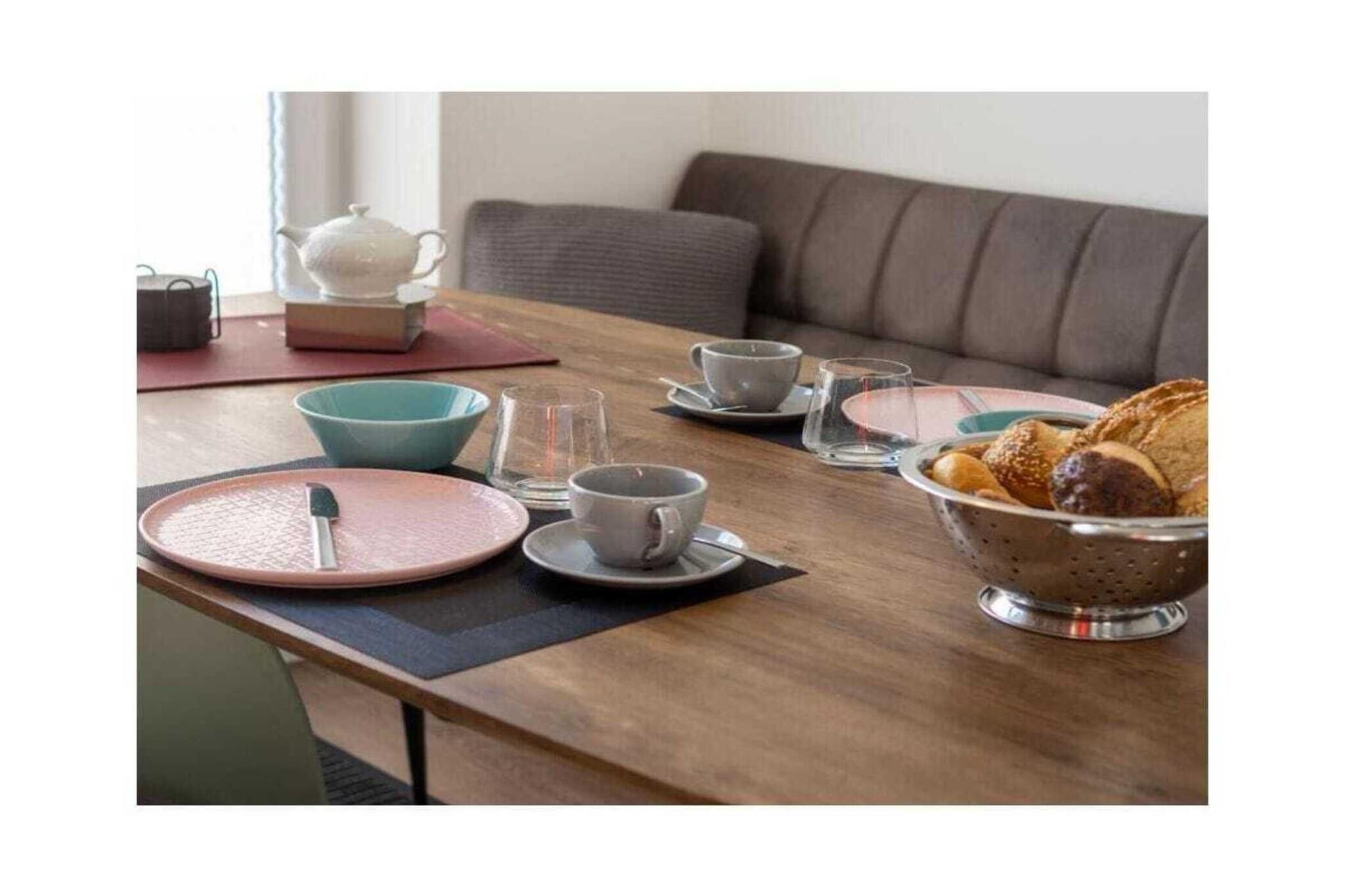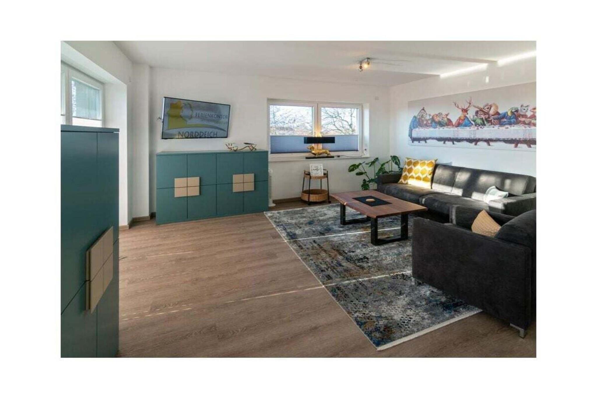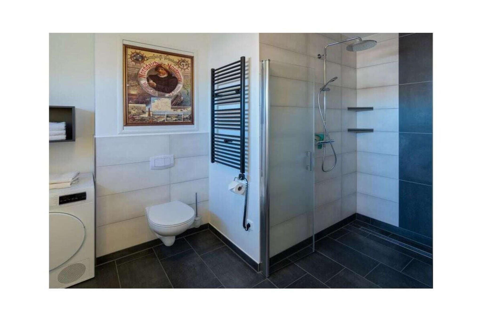 Holiday apartment Deck 8, Zum Bahnkolk 5, Norddeich Spend relaxing and eventful days in the small holiday paradise of Norddeich. Here, in the quiet district of the East Frisian town of Norden, you will find everything you could wish for for your dream holiday: a long sandy beach, wide dunes, quaint restaurants and inviting shops. This exclusive holiday apartment, which is barrier-free, guarantees you an all-round pleasant stay. The holiday apartment The Deck 8 holiday apartment is on the second floor of an apartment building and, despite its very central location, is pleasantly quiet. You can get to the wonderful sandy beach just as quickly as Norddeich's lively and inviting shopping mile. You will find a parking space right outside your front door. You don't have to climb any stairs to get to your holiday home, as there is a modern elevator that takes you directly to the 2nd floor. This property is also barrier-free inside. The kitchen, dining area and living room are connected in a spacious area. What is particularly striking here is the modern yet very comfortable furnishings. The apartment is bright and friendly, dark color accents on the selected designer furniture create an elegant flair. Thanks to the wide window front in the living and dining area, your apartment is flooded with light almost all day. Of course, the windows can be darkened using the shutters if desired. A stylish couch and the color-coordinated armchair in the living area invite you to linger. A modern TV guarantees cozy evenings in front of the TV. The modern kitchenette is functionally equipped with everything you need if you don't want to eat out. It has a stove with four hotplates on a ceramic hob, an oven, a refrigerator, a dishwasher, a microwave, a coffee machine, a toaster, an egg cooker and enough dishes.